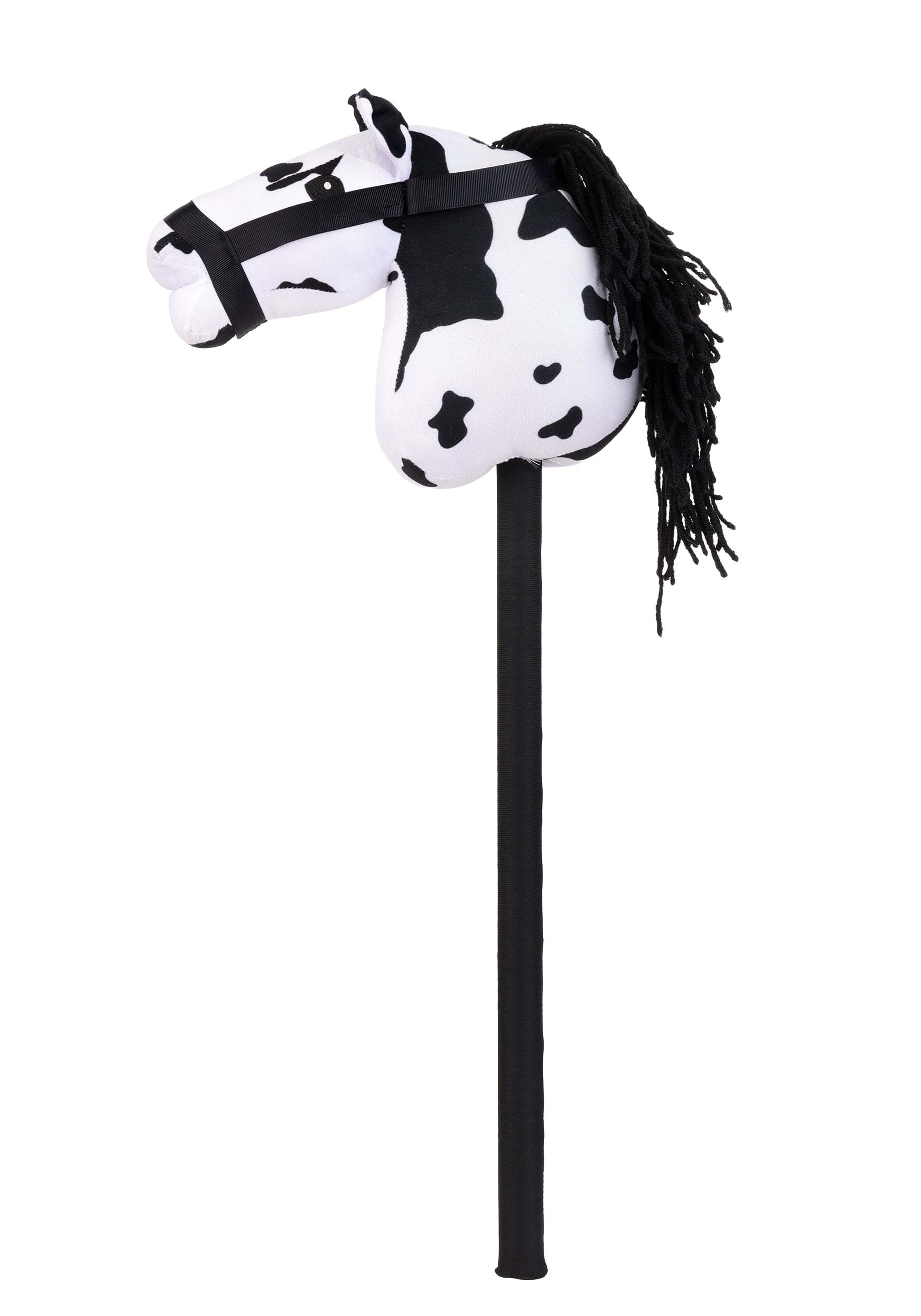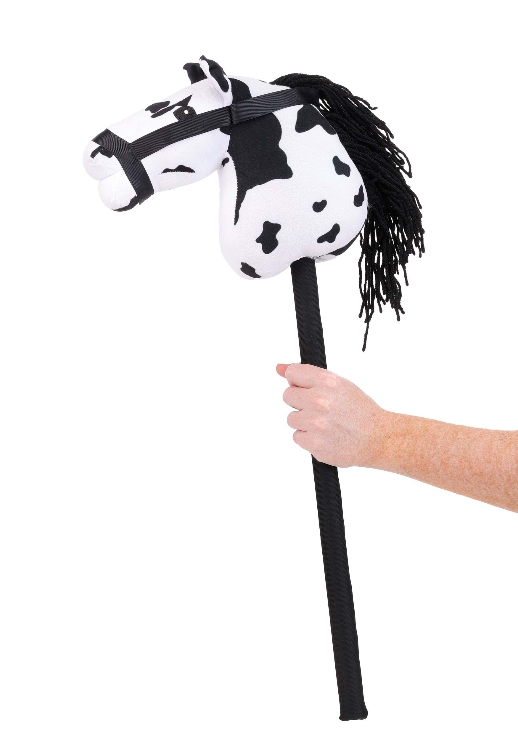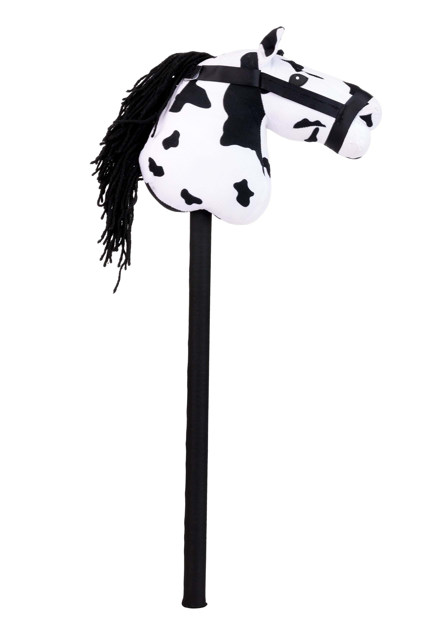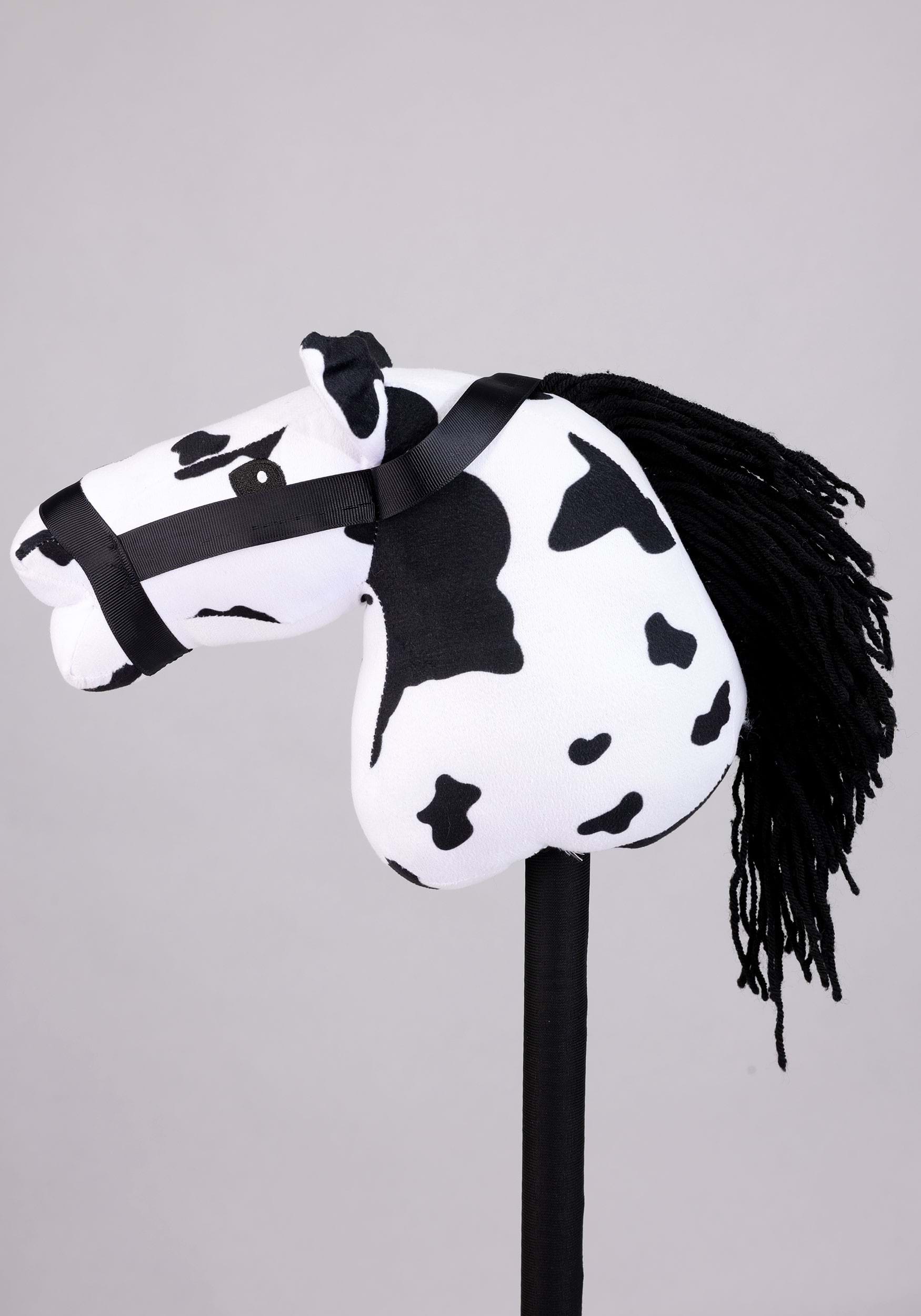 The Appaloosa hobby horse is a white plush horse head covered in black spots, with a flowing black yarn mane and a black bridle detail. The stick handle is wrapped in fabric so it's comfortable to grip during extended rides across the living room, the backyard, or wherever the trail takes you.