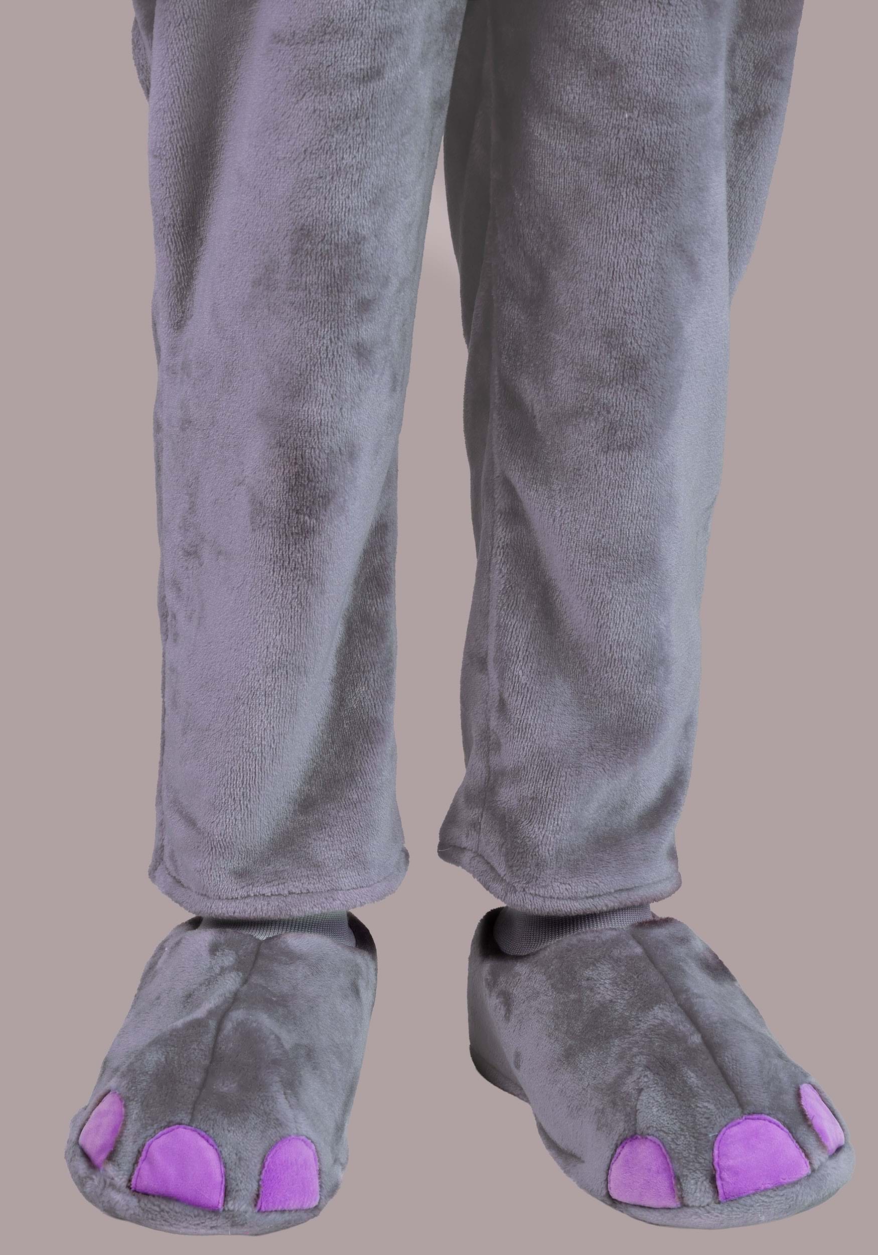 Let the fun start with this plush jumpsuit, complete with a back zipper and flared cuffs for easy wear. A heart-shaped purple tummy panel and two-tone elephant hands bring Finnick's disguise within reach. The plush hood features oversized Minky ears, a soft jersey liner, embroidered eyes, and an attachable trunk that secures easily with hook-and-loop fasteners. Matching shoe covers with elastic straps ensure a snug fit.