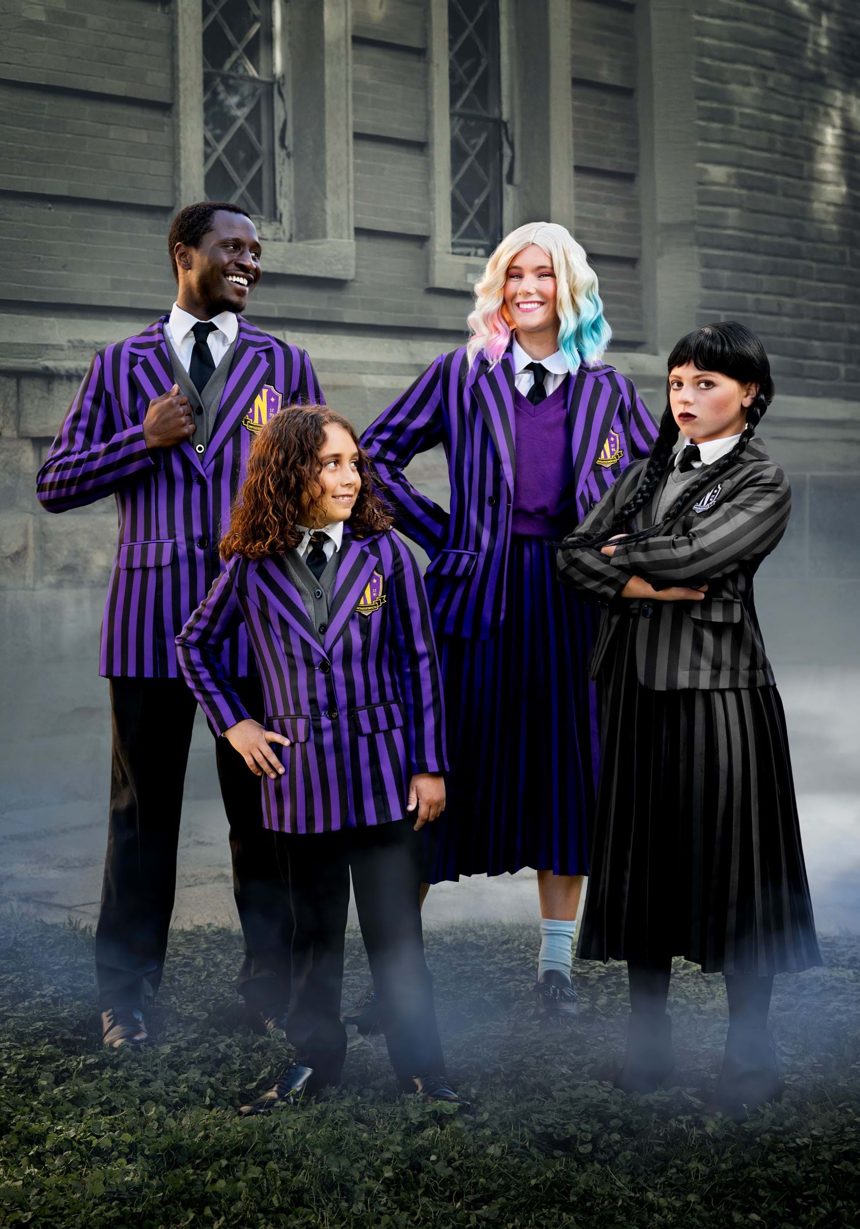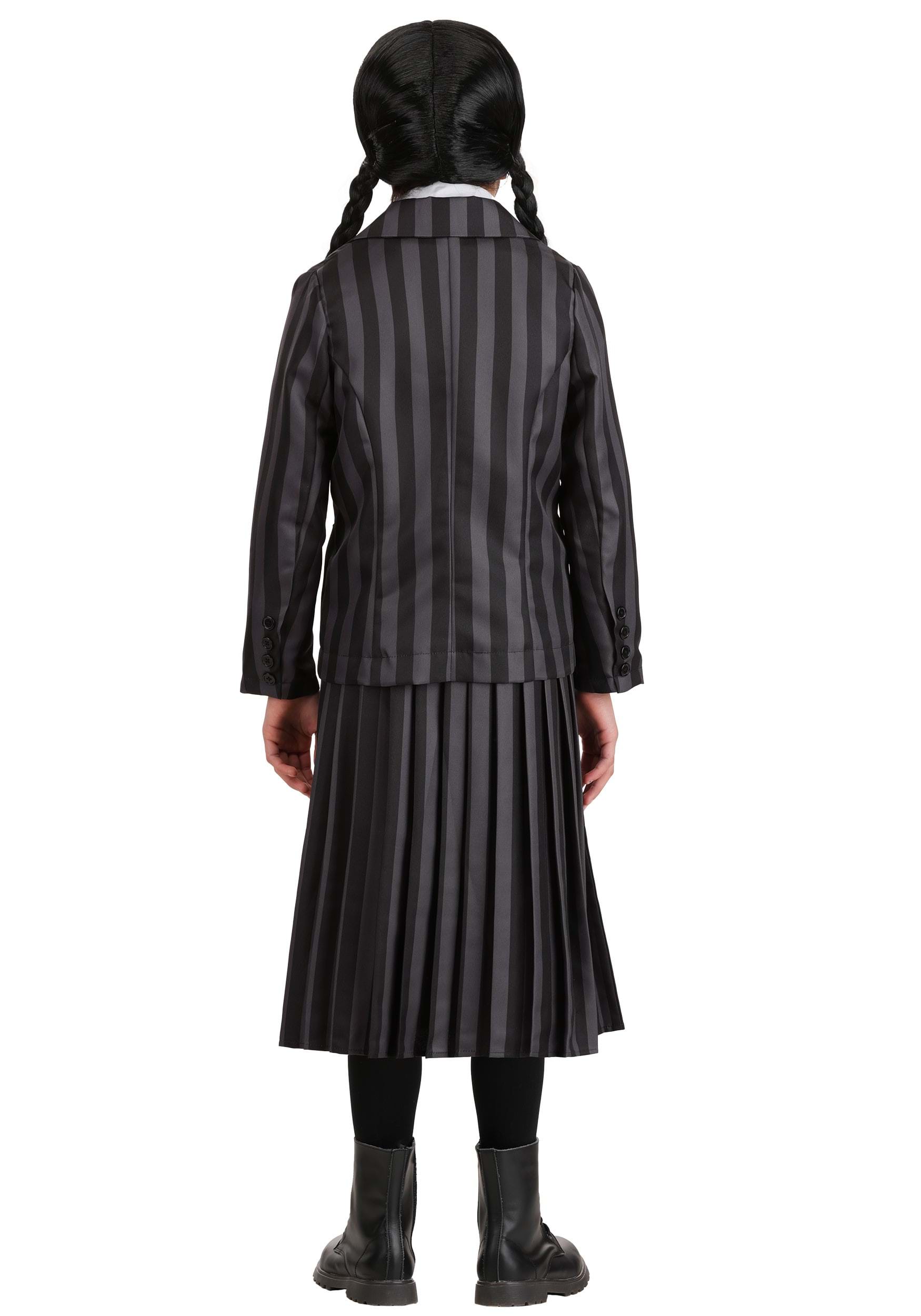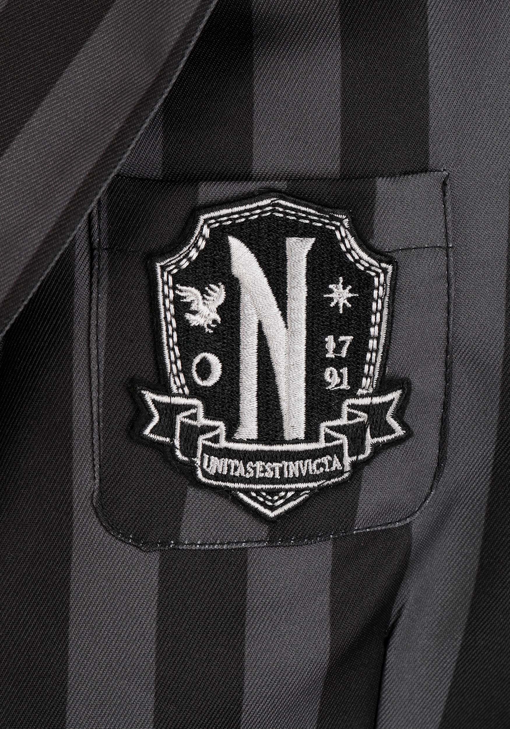This officially licensed costume includes everything your little Nevermore student needs: a tailored black-and-gray striped blazer made from medium-weight poly-cotton, complete with a front button closure and an embroidered Nevermore Academy crest on the chest. The matching pleated skirt has an elastic waistband for a secure, comfortable fit—perfect for sulking dramatically or writing ominous poetry.