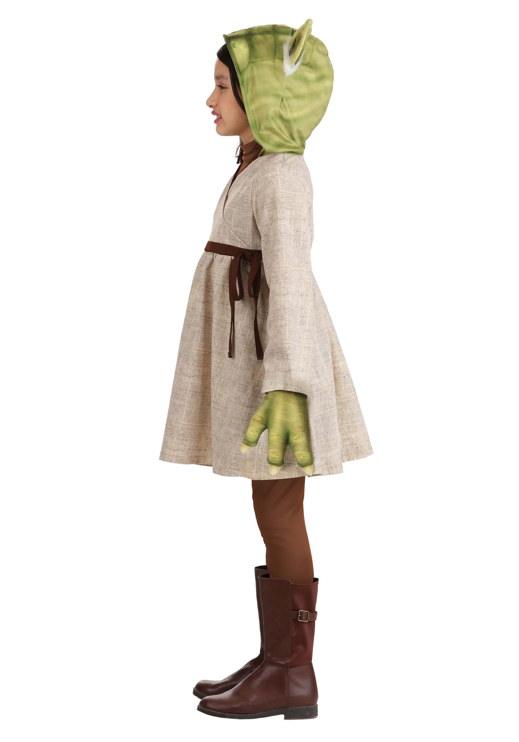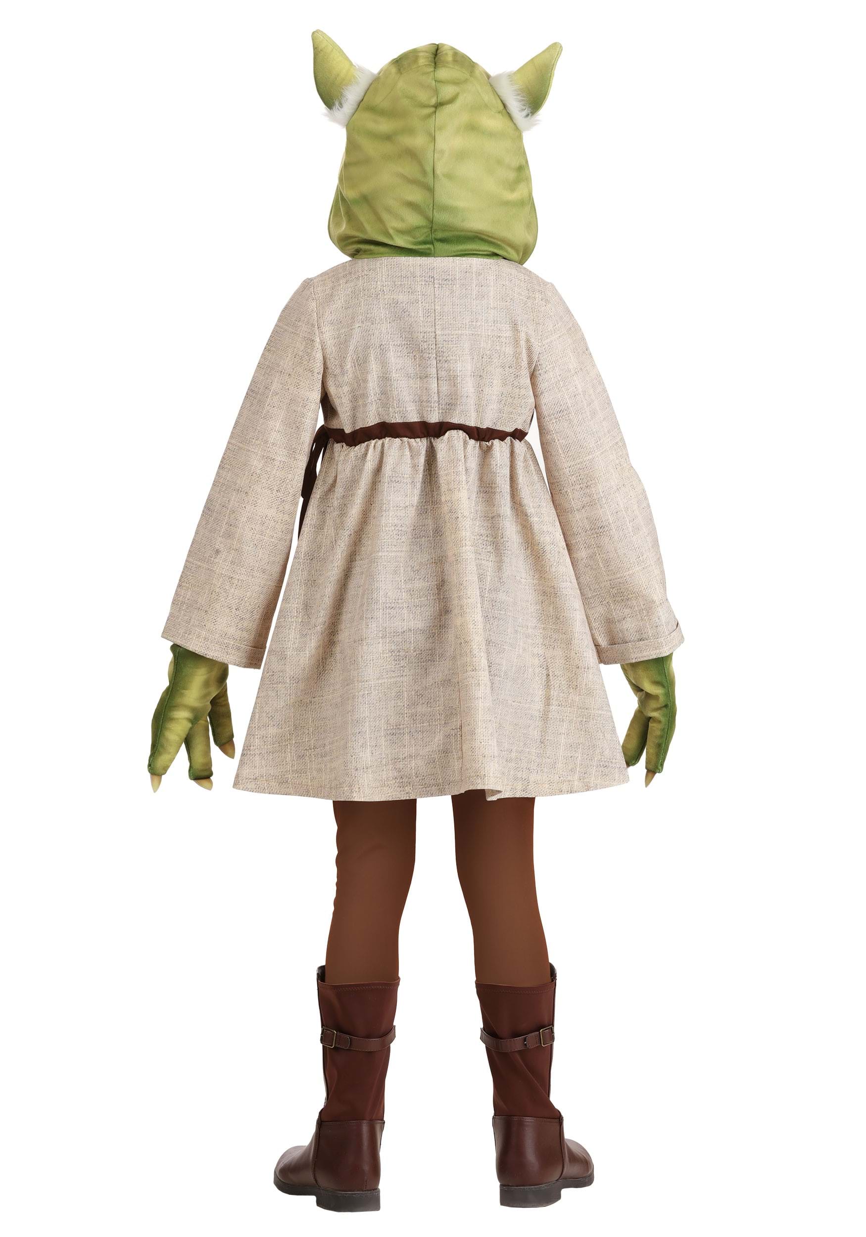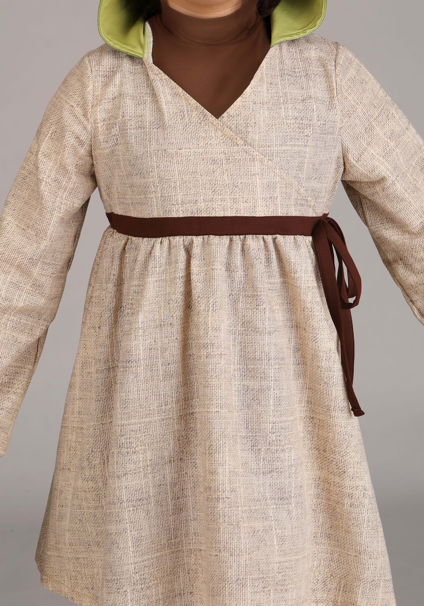The dress features a softened linen-look fabric printed in Yoda's iconic Jedi robes, with a faux wrap front, a bow-tied waist, and rolled tack cuffs for added detail. The attached Minky hood is fully lined and topped with foam ears, stitched "wrinkles," and fuzzy tufts of plush fur that capture Master Yoda's one-of-a-kind look.