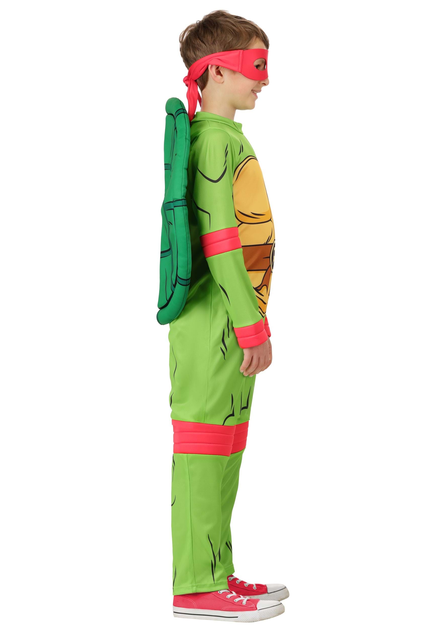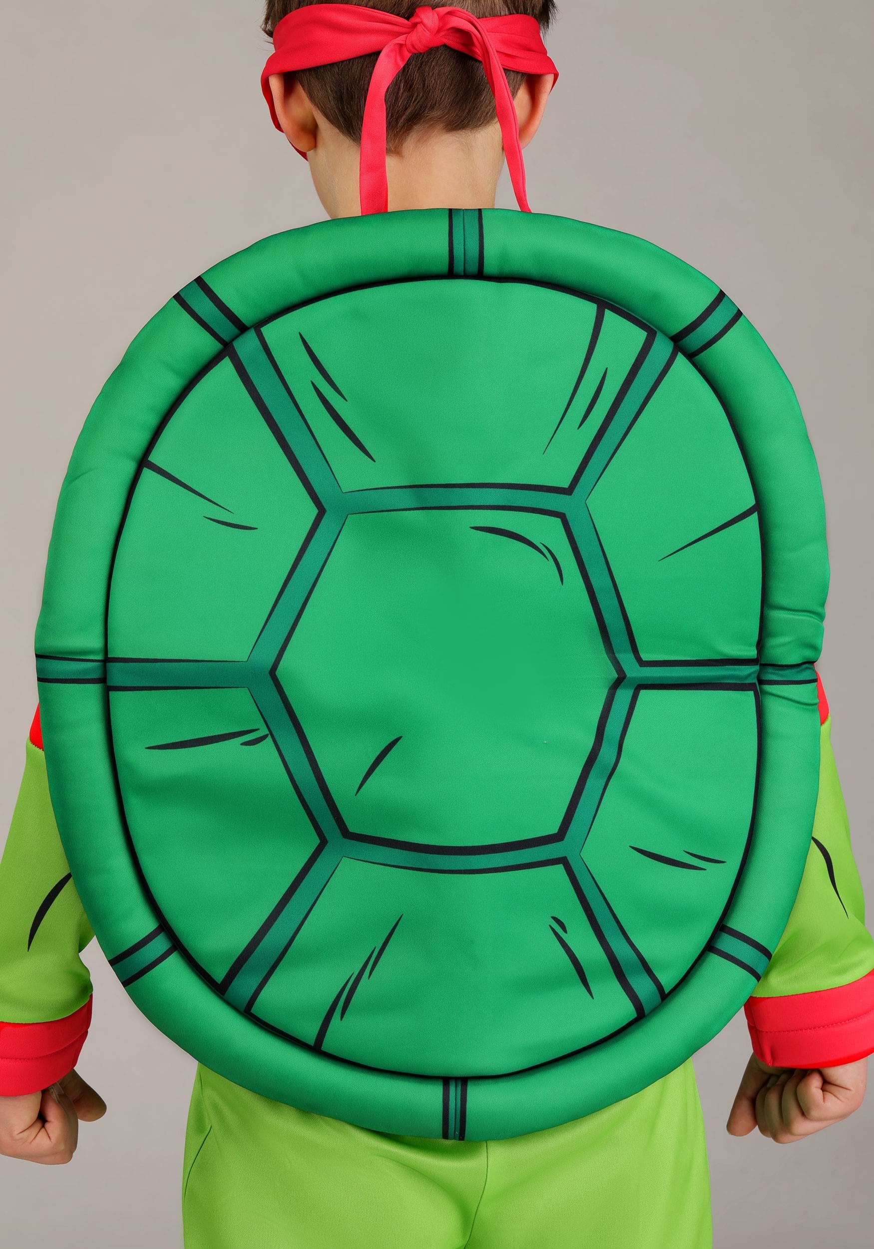 The attached turtle shell is made of soft foam and secures with hook and loop fasteners to keep it in place through pizza runs and trick-or-treat missions. The included foam-backed red eye mask ties around the head and stays comfy—perfect for hours of play or Halloween heroics.