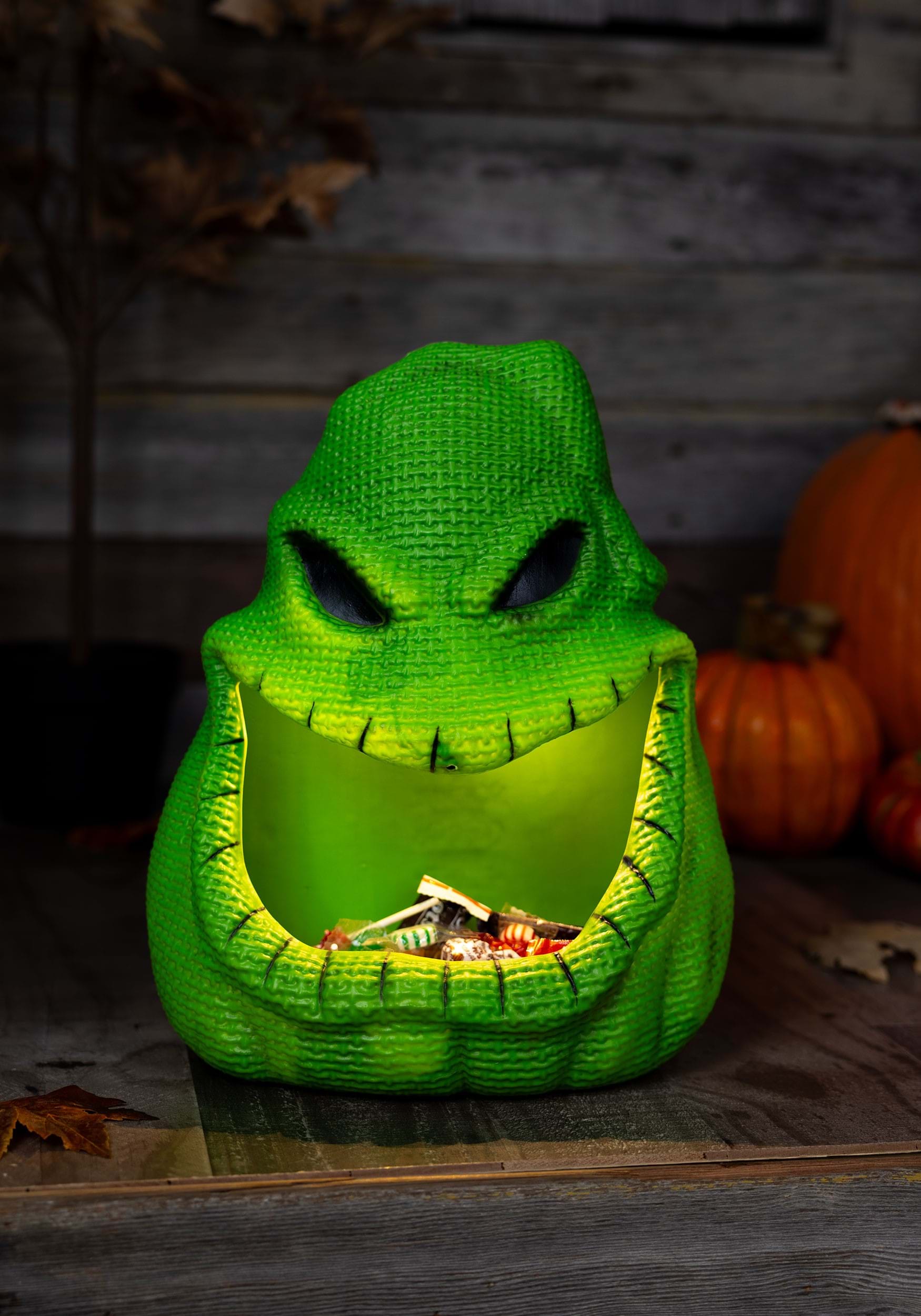 Standing at 14.5 inches tall, this officially licensed Nightmare Before Christmas decoration is shaped like Oogie Boogie’s unmistakable burlap head—complete with stitched details, black eyes, and a glowing neon grin that lights up when activated. Inside that grinning mouth? A space to hold your candy, of course.