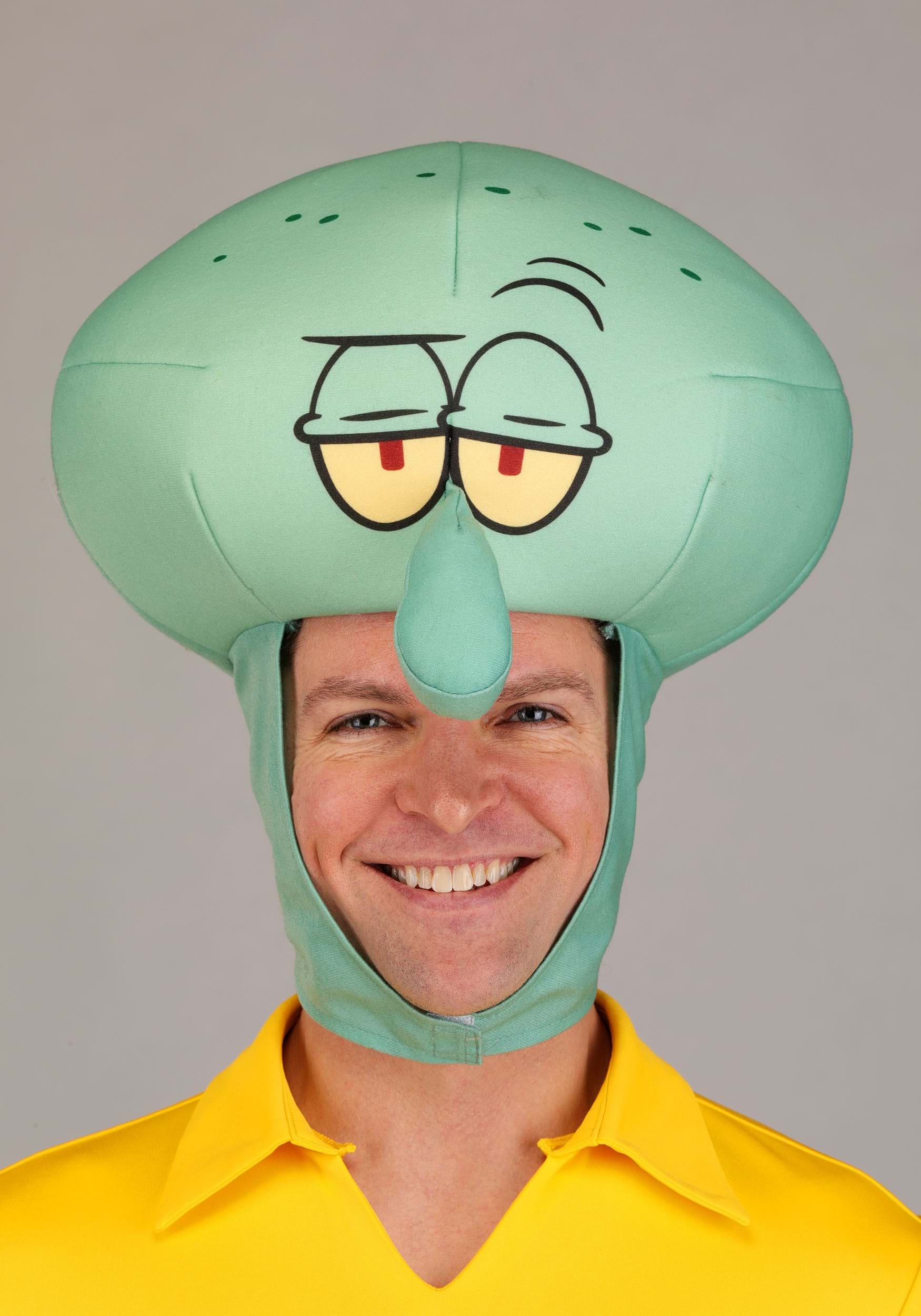 The headpiece tops it all off—literally—with a big, bulbous Squidward dome featuring printed eyes and his signature expression: somewhere between “meh” and “existential crisis.” A chin strap keeps it in place, even when you're delivering monologues about the mediocrity of modern society (or just trying to order lunch).