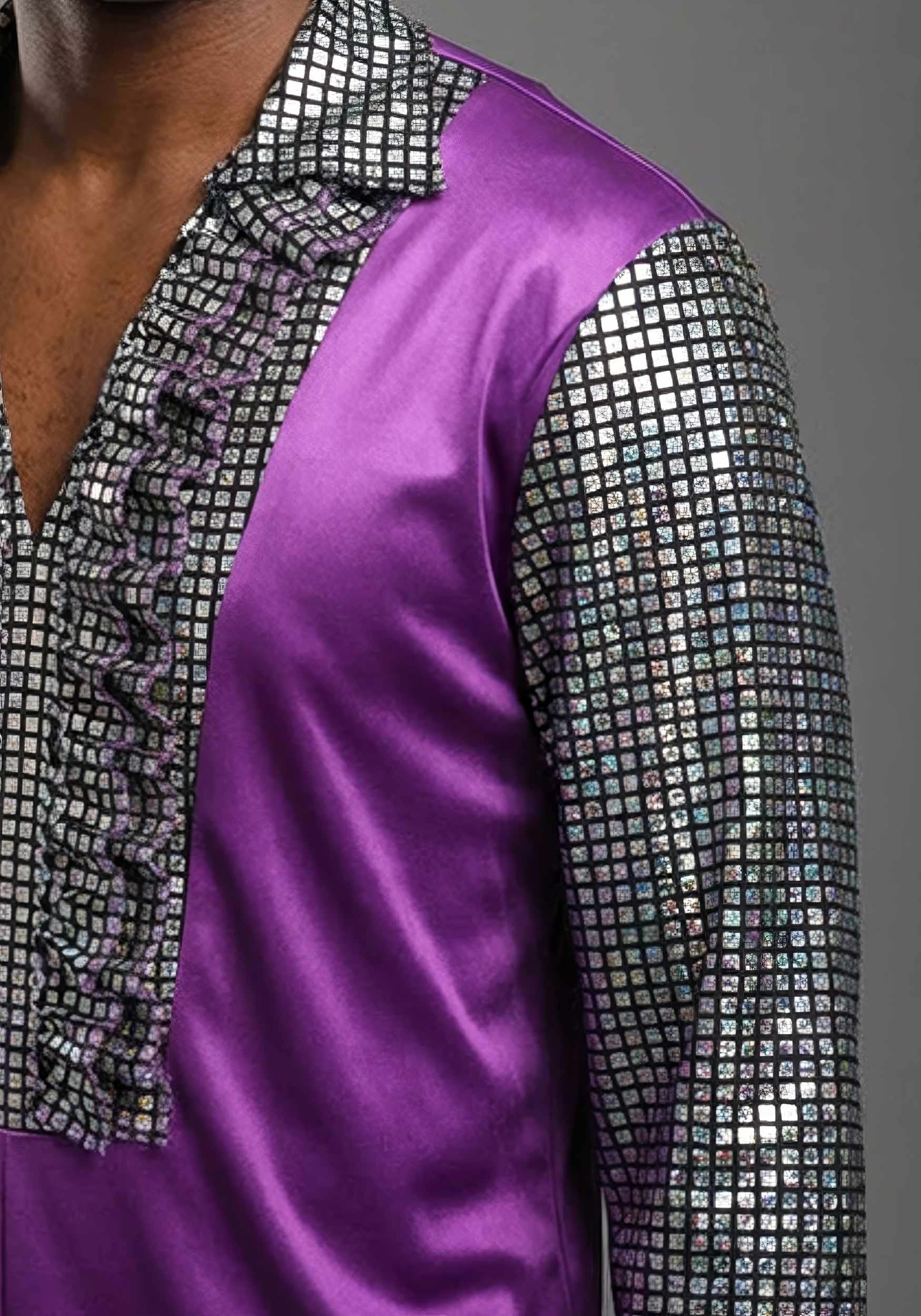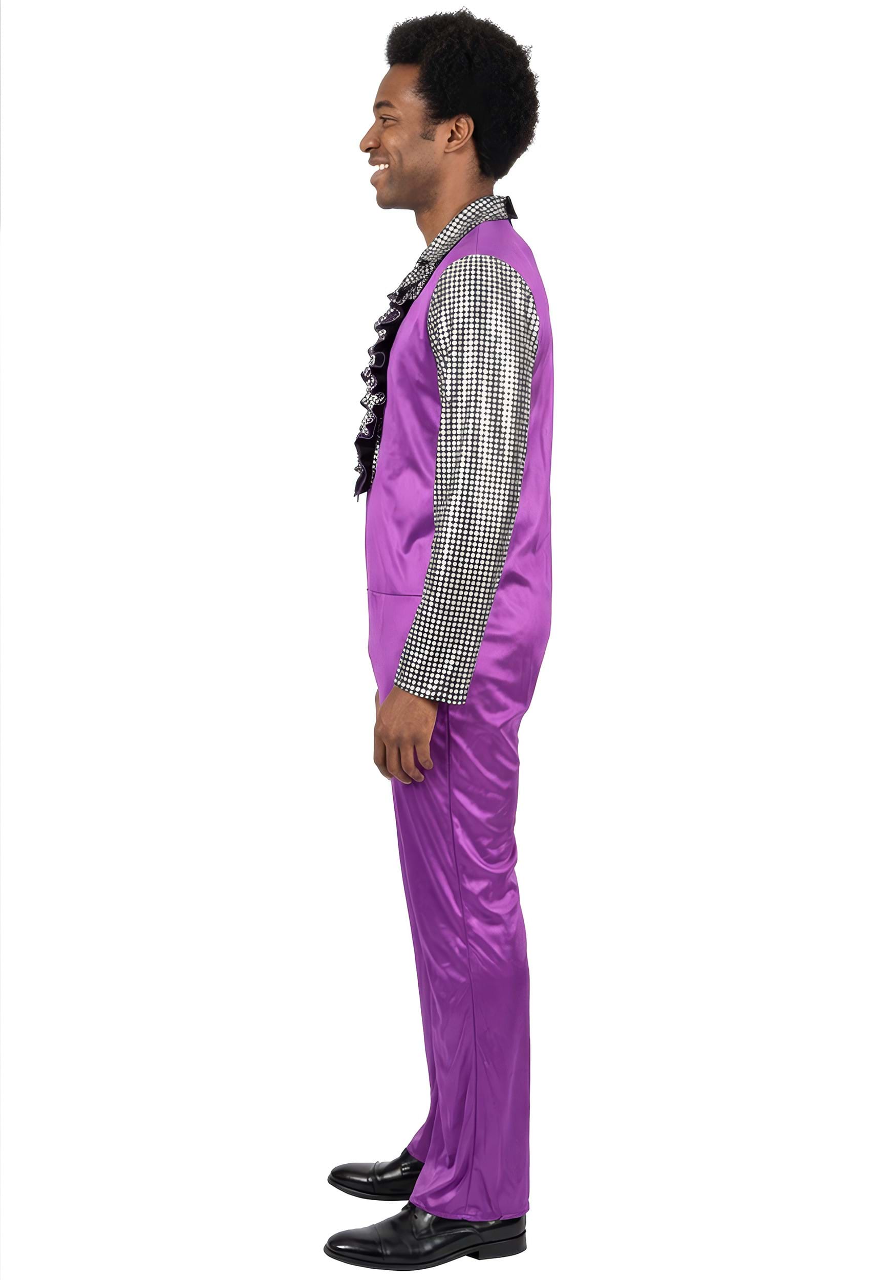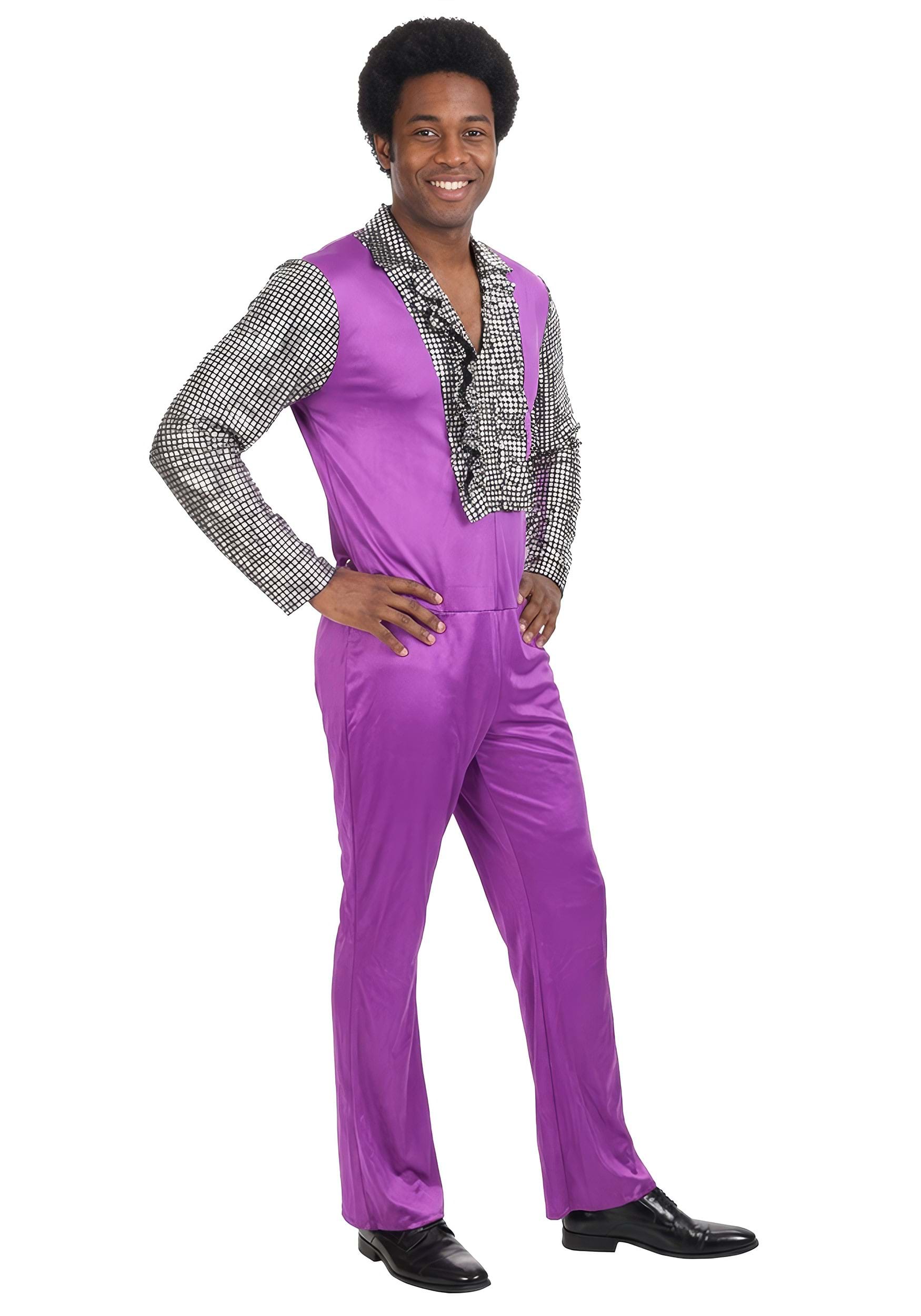 This costume includes a one-piece jumpsuit made from 100% polyester. The body features a shiny purple polyknit fabric that catches the light, while the sleeves and collar use a black polyknit material with a foil print for contrast and extra flair. The jumpsuit fastens in the back for a secure fit, keeping the look clean from the front. A ruffle collar adds that classic disco touch right where it counts, bringing texture and personality to the overall style.