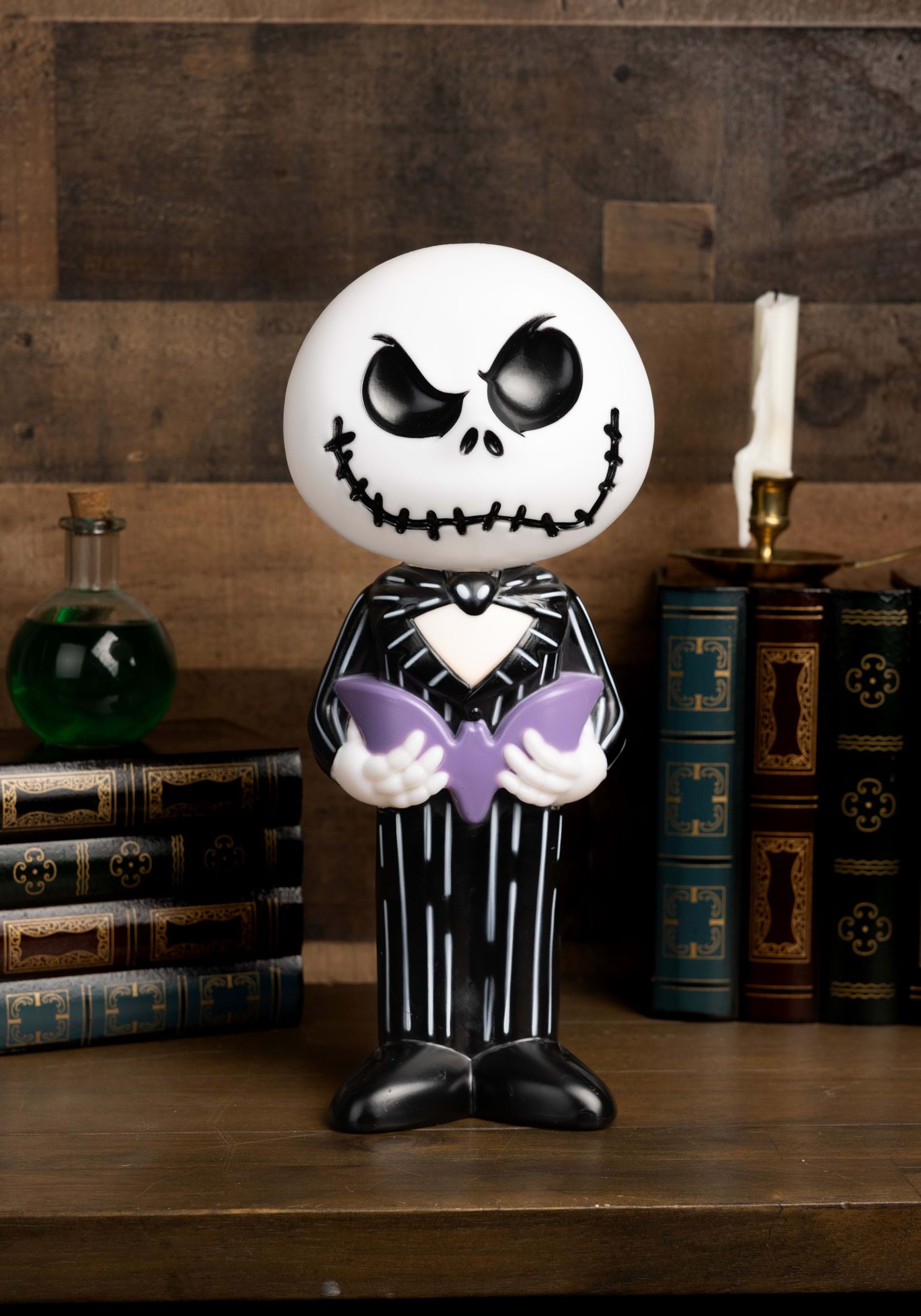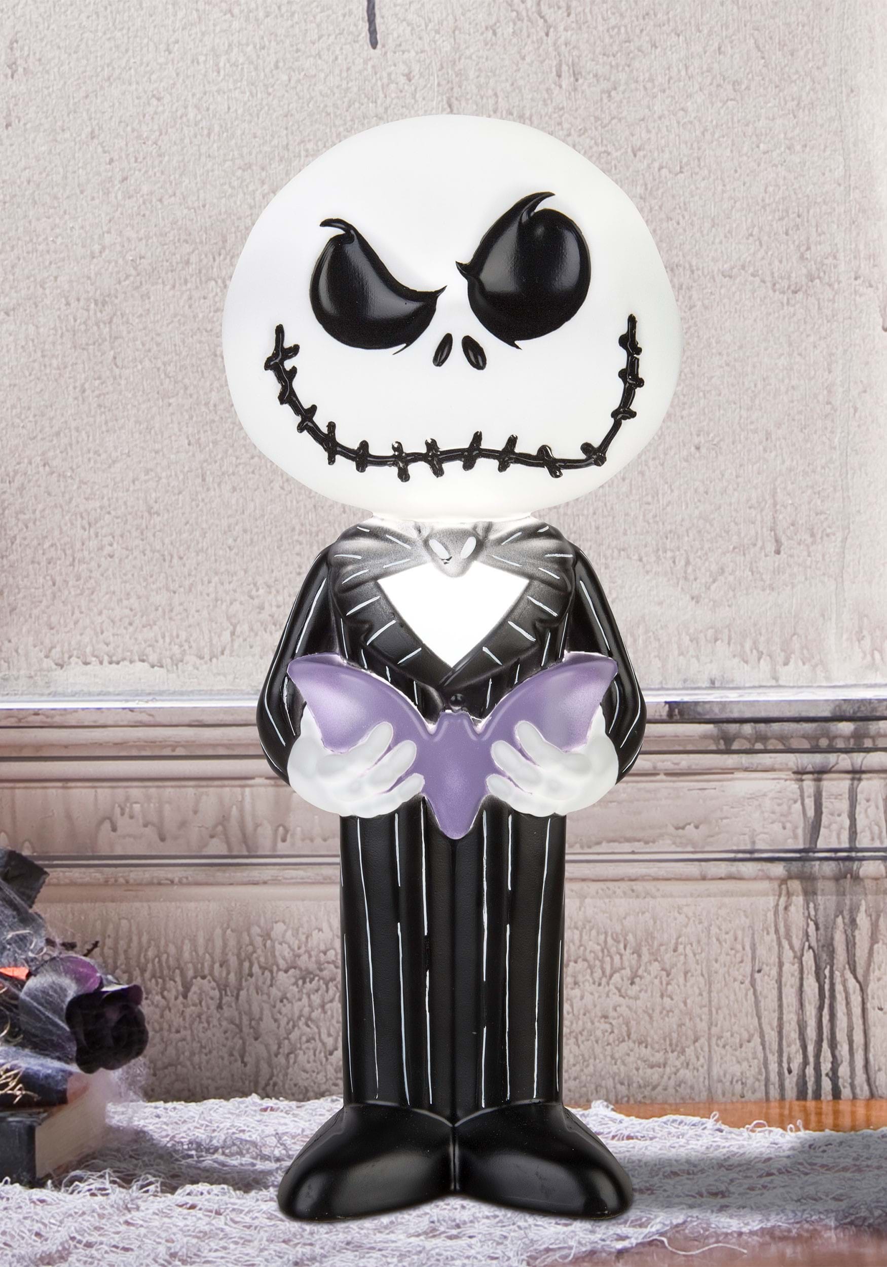 Standing 14 inches tall, this officially licensed blow mold decoration features Jack Skellington in his signature striped suit with a stylized design that captures his mischievous charm. He holds a molded purple bat with both hands, giving the piece a fun twist while keeping things unmistakably Halloween Town-approved.