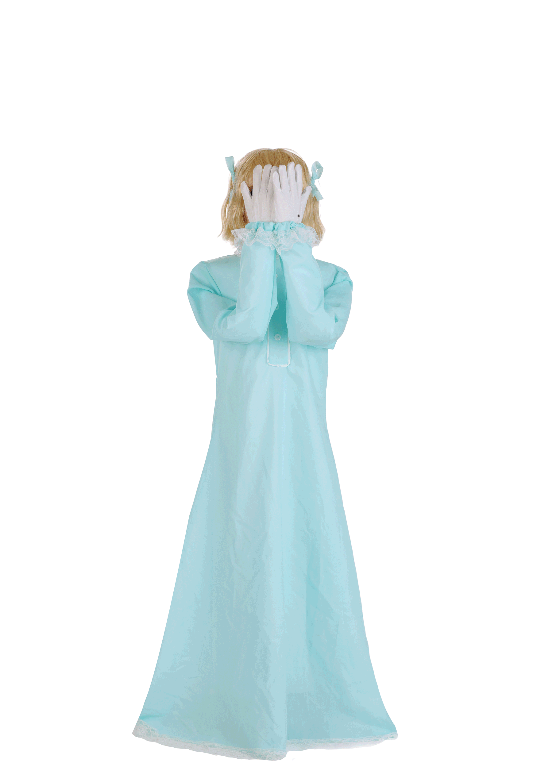 Standing at 5 feet tall, Peekaboo Penny is built on a sturdy metal frame with a plastic base and wears polyester clothes that scream “sweet and suspicious.” Her head stays bowed until activated, then snaps up in a sudden motion to reveal her screaming face and delightfully dead-eyed stare. She doesn't light up—because she doesn't need to. The sound and motion are more than enough.