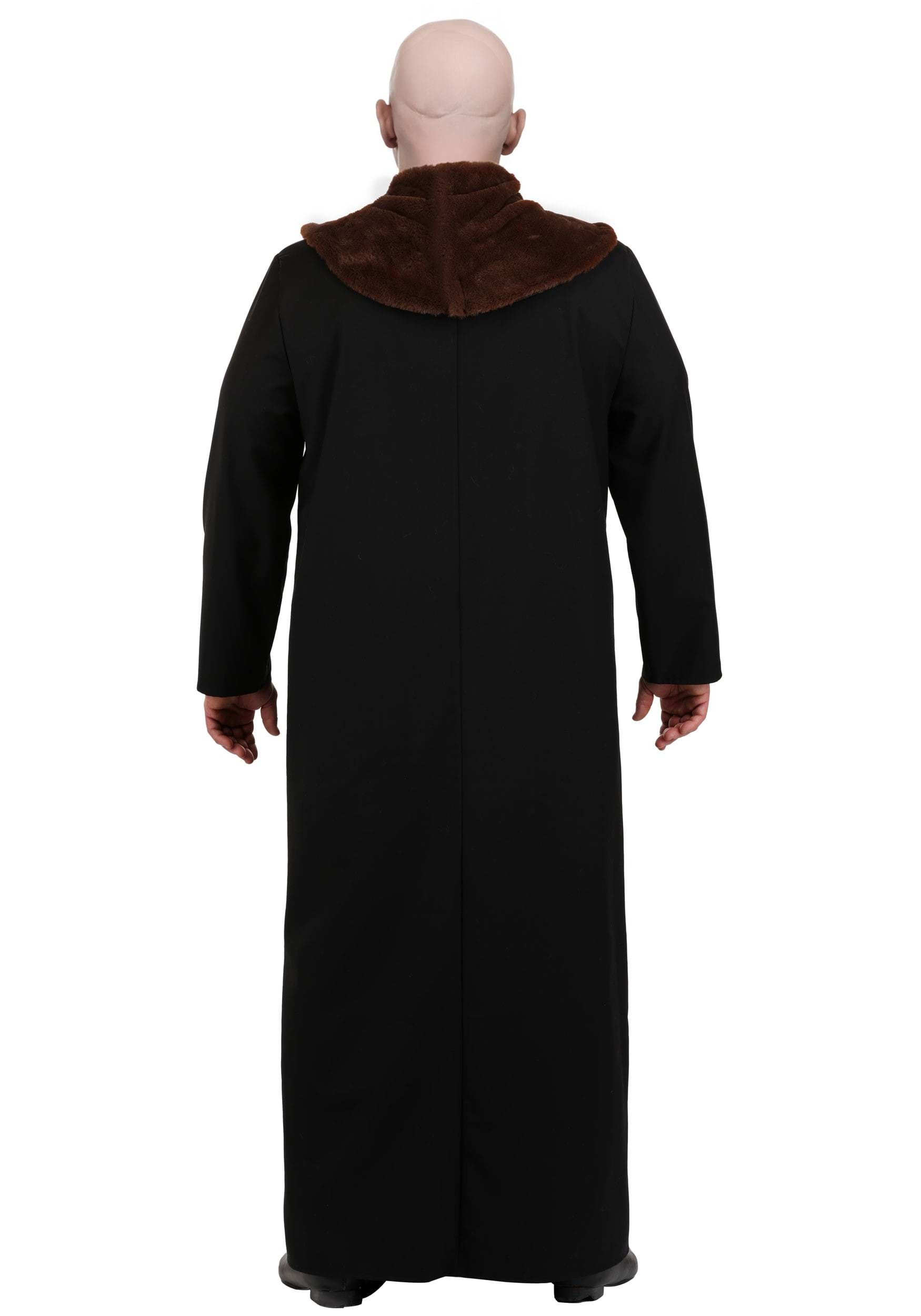 This officially licensed costume includes a long black robe made from 100% polyester woven fabric. The robe fastens down the front with hook and loop strips, and features built-in shoulder pads to give you that signature Fester silhouette: hunched, haunting, and oddly huggable. Over the robe sits a rich faux fur collar with a satin lining, which secures at the back and delivers peak ghoulish sophistication.