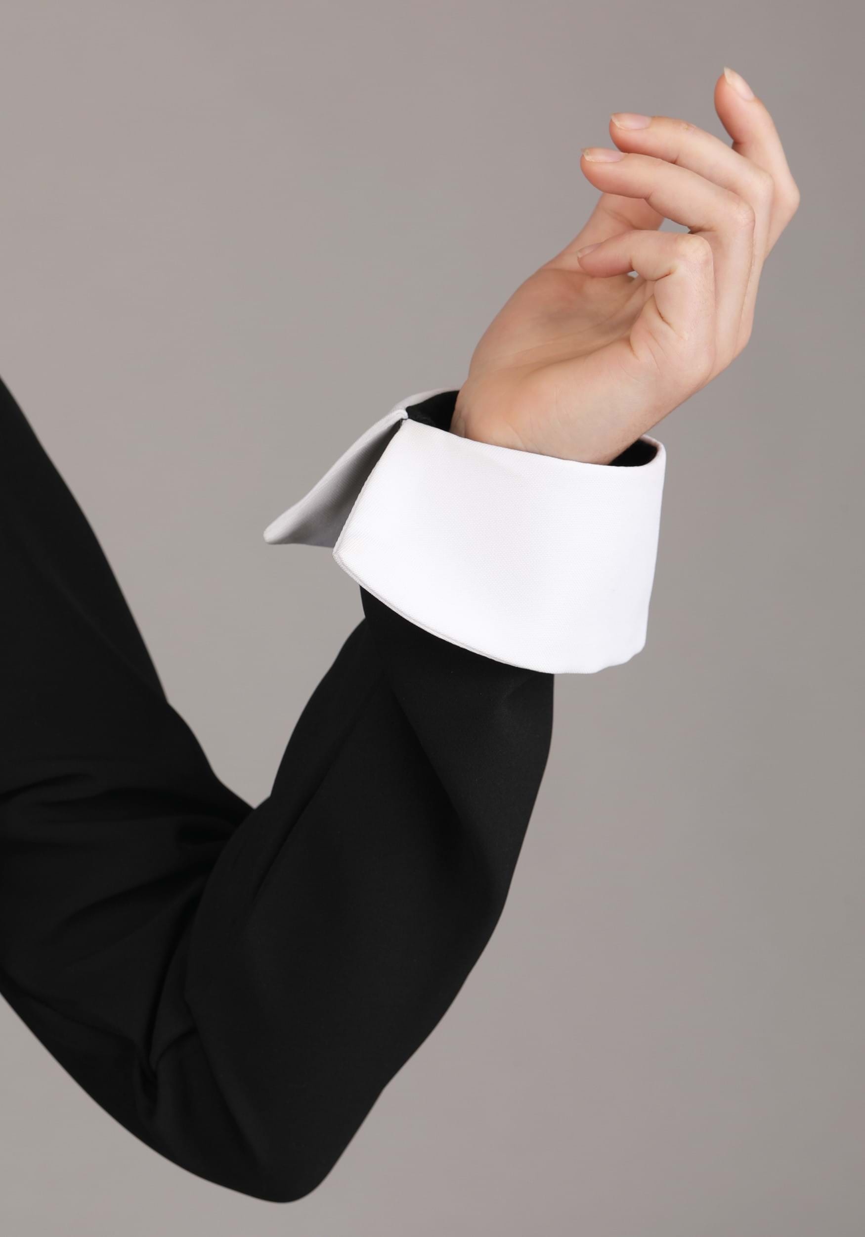 - Poly woven collar has an elastic loop and button closure on the back, poly woven sleeve cuffs