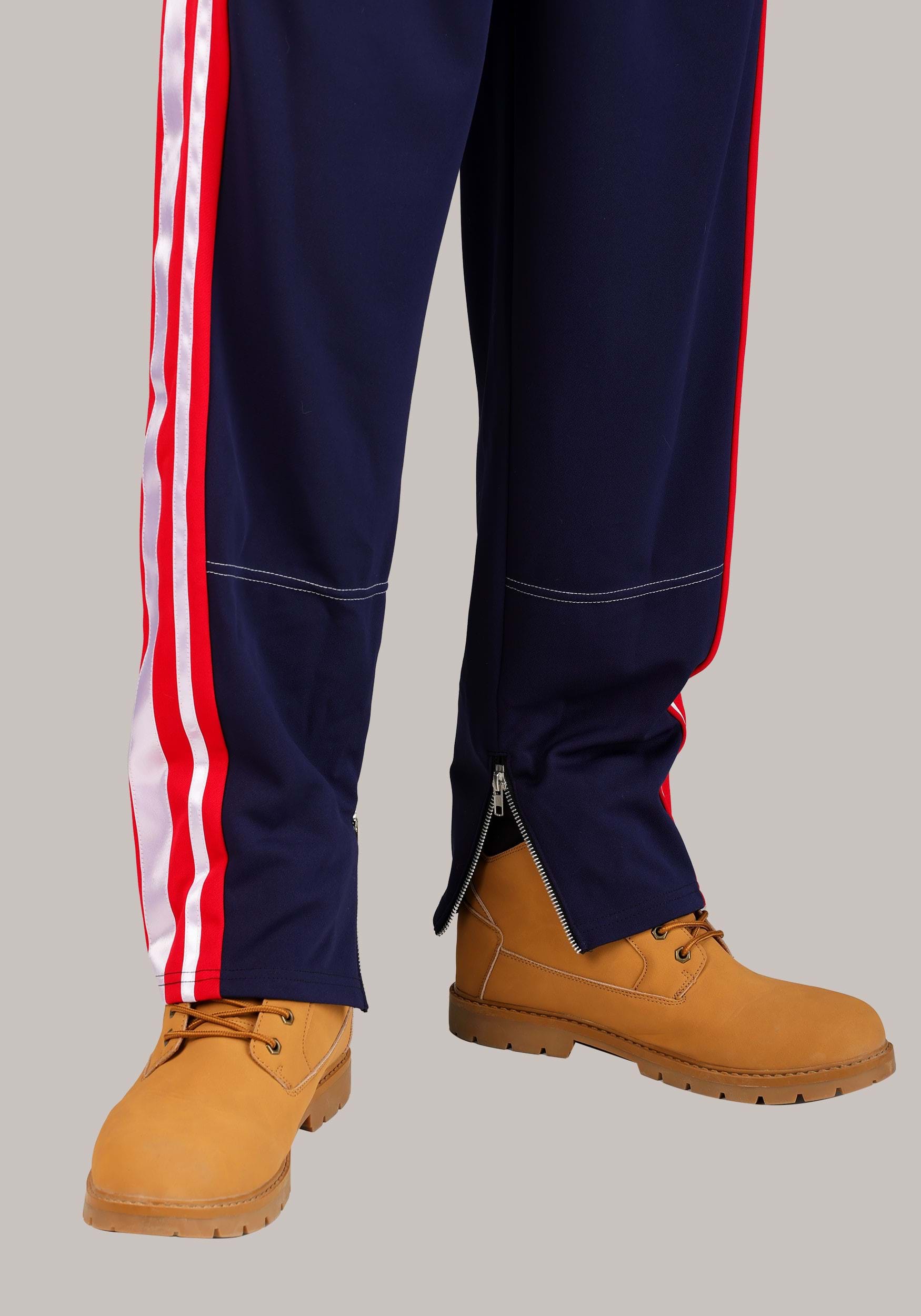 - Tricot pants has red stripes and satin down the sides, elastic and drawstring waistband, ankle zippers, front and back pockets