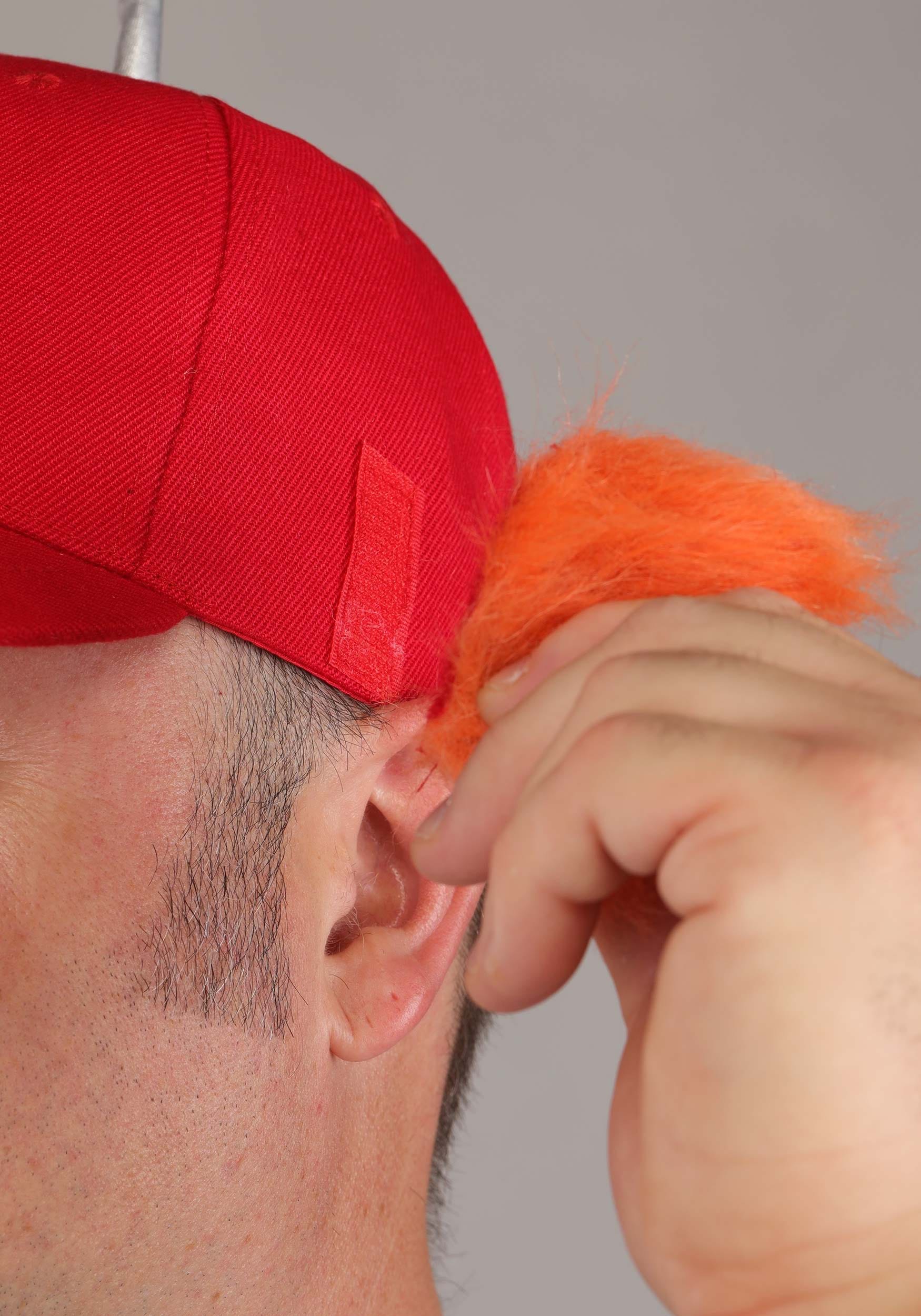 • Red baseball style hat has a silver lame pole and stiff felt flag on top, faux hair on sides of hat