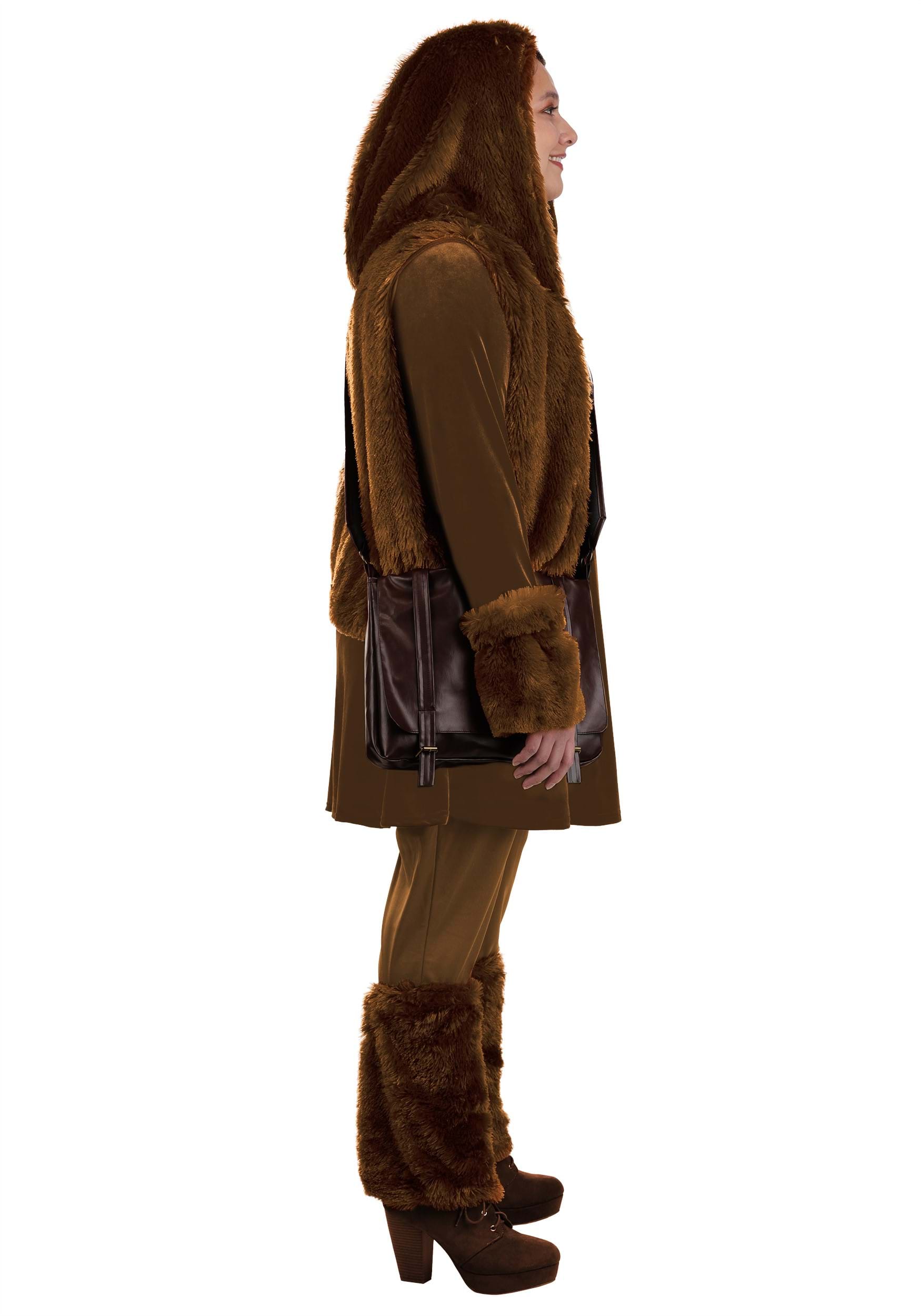 The foundation of this ensemble is a soft stretch velvet dress that zips up the back. Layered on top is a hooded vest crafted from shaggy brown plush fabric to create a true Chewie silhouette. The look includes matching jersey knit leggings with a comfy elastic waistband for a smooth fit. Cuffed gloves and faux fur leg warmers keep the look cohesive and are finished with elastic bands.