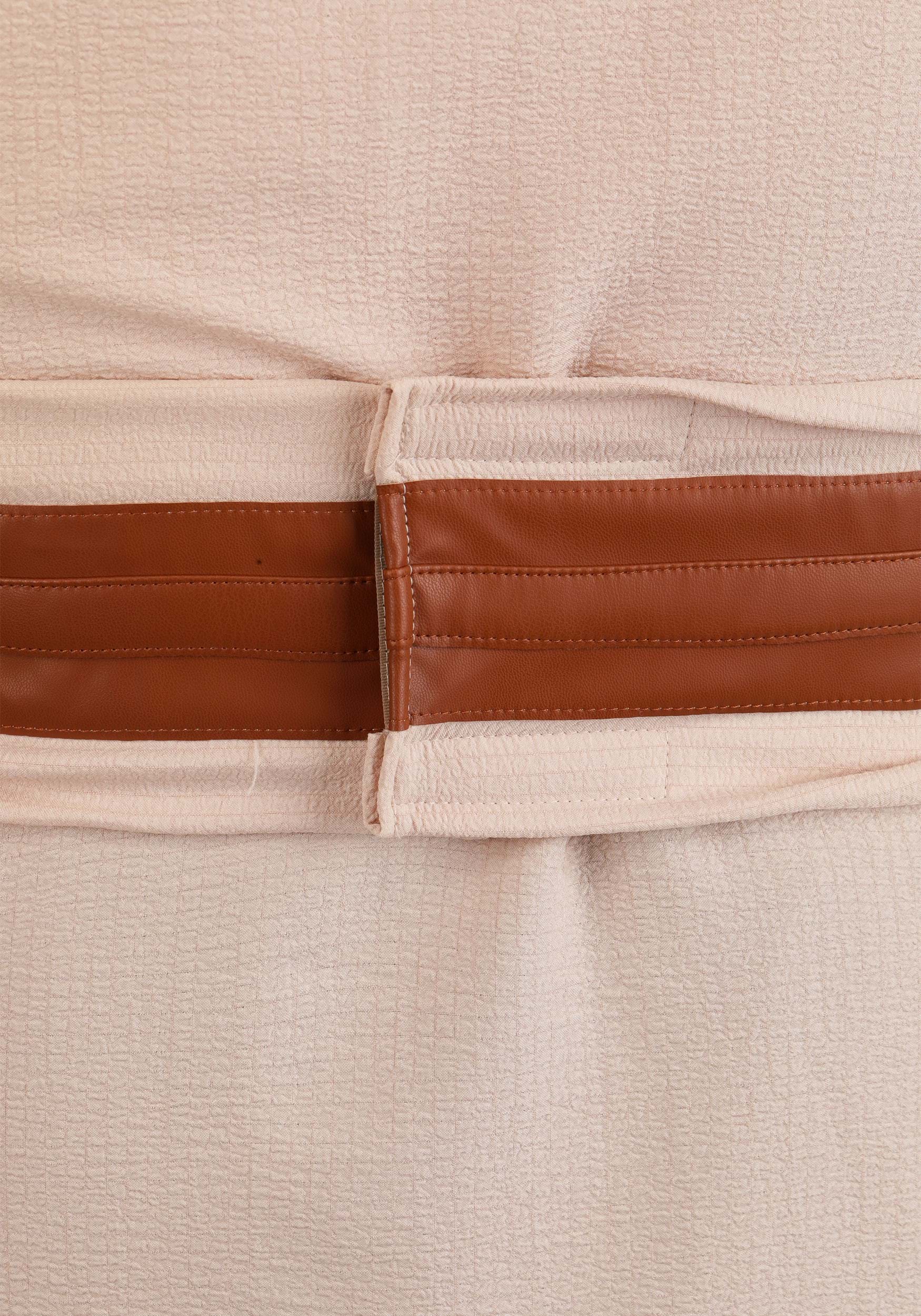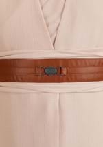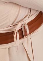 The costume starts with a robe-style tunic made from soft, opaque gauze that flows comfortably while giving off that well-traveled Jedi aesthetic. Woven shoulder overlays are sewn into place to create that layered Jedi robe effect without the need for constant adjusting. Secured inside with simple ties, the tunic stays put. A matching dickie fills in the neckline with the look of a Jedi's classic inner shirt.