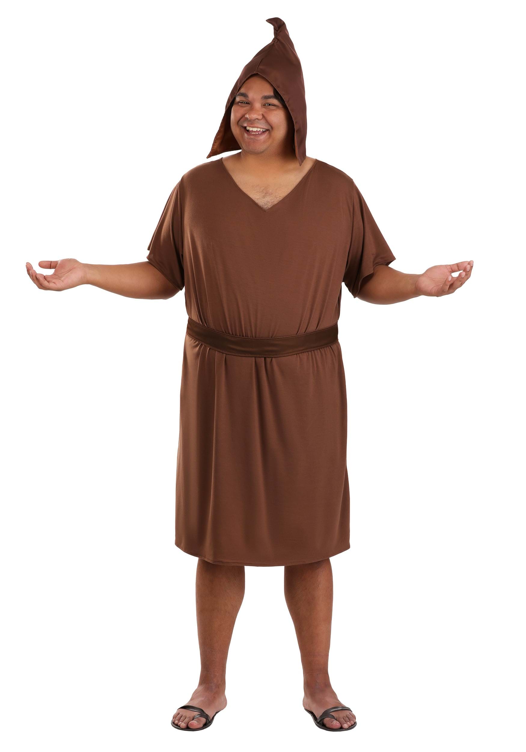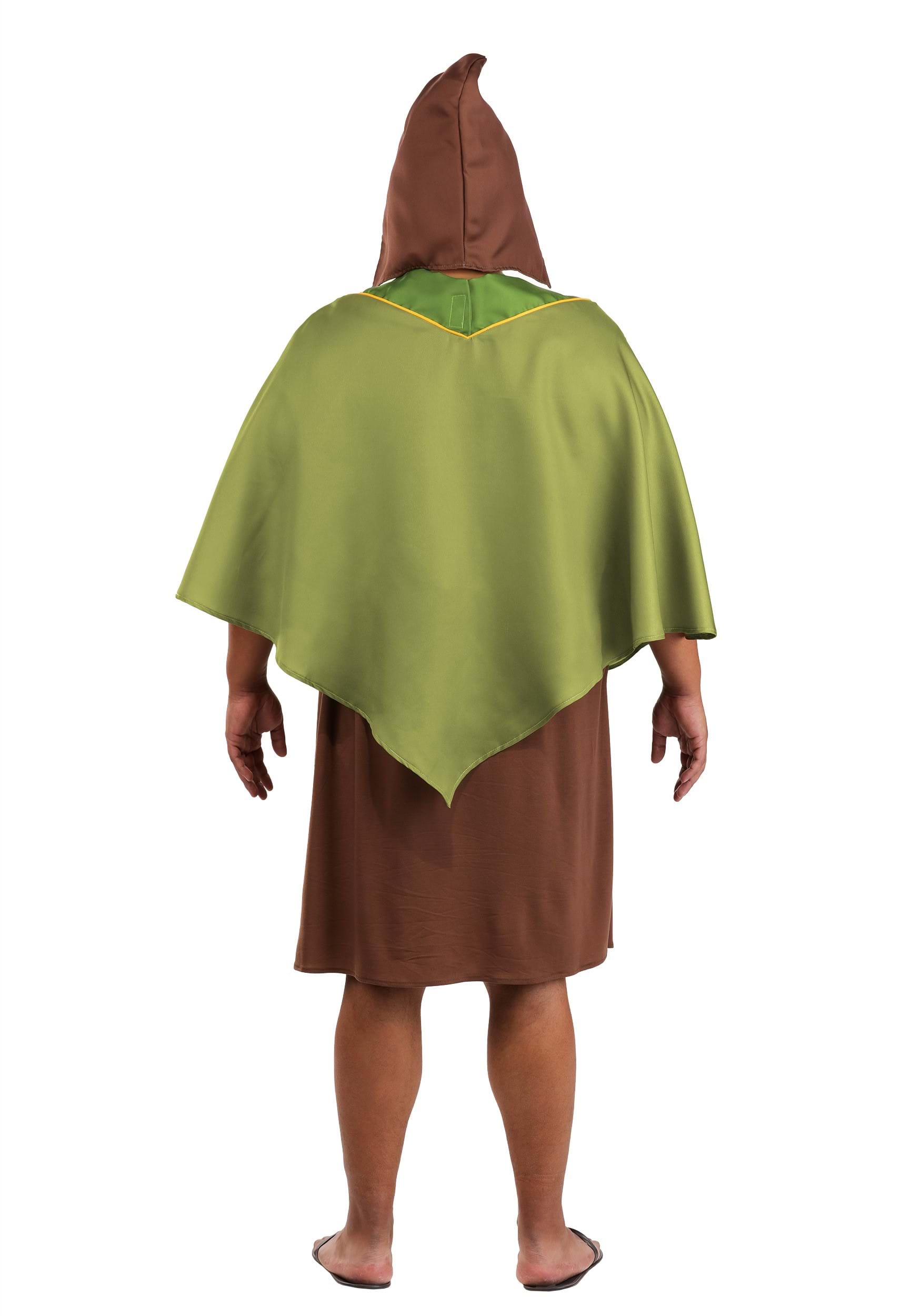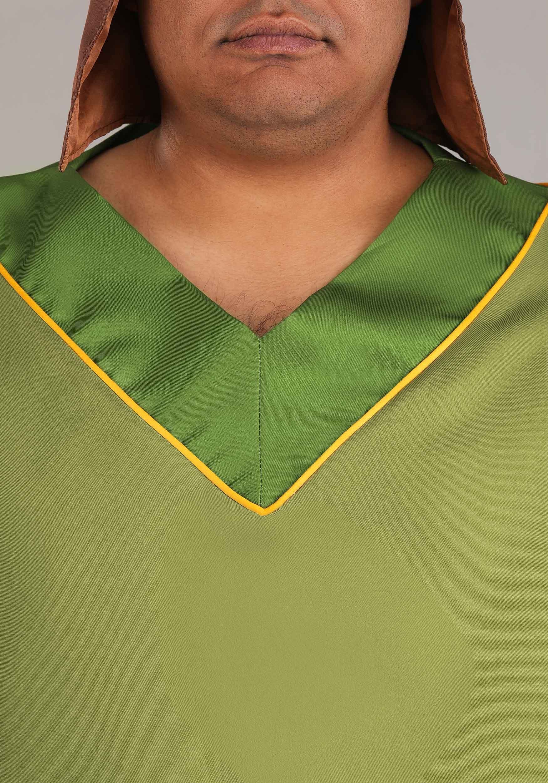 This Pacha costume features a flowy green poncho with a dark green V-neck collar and a touch of orange trim. It layers over a brown tunic that hits around the knees, while a pointed fabric hat is included to match Pacha's look from the movie. It's simple, funny, and perfect for anyone who just wants to do the right thing… (or look great with easy effort).
