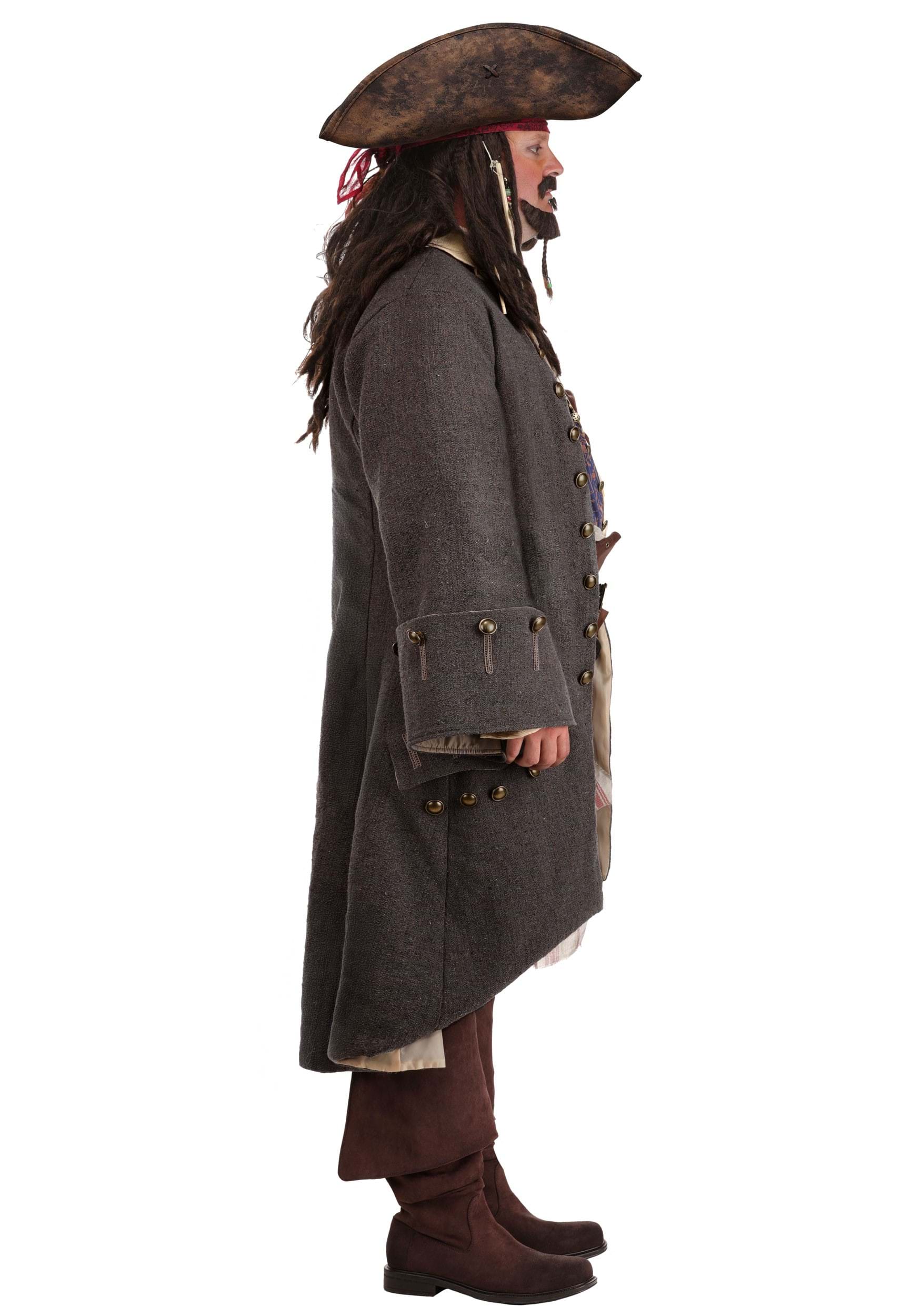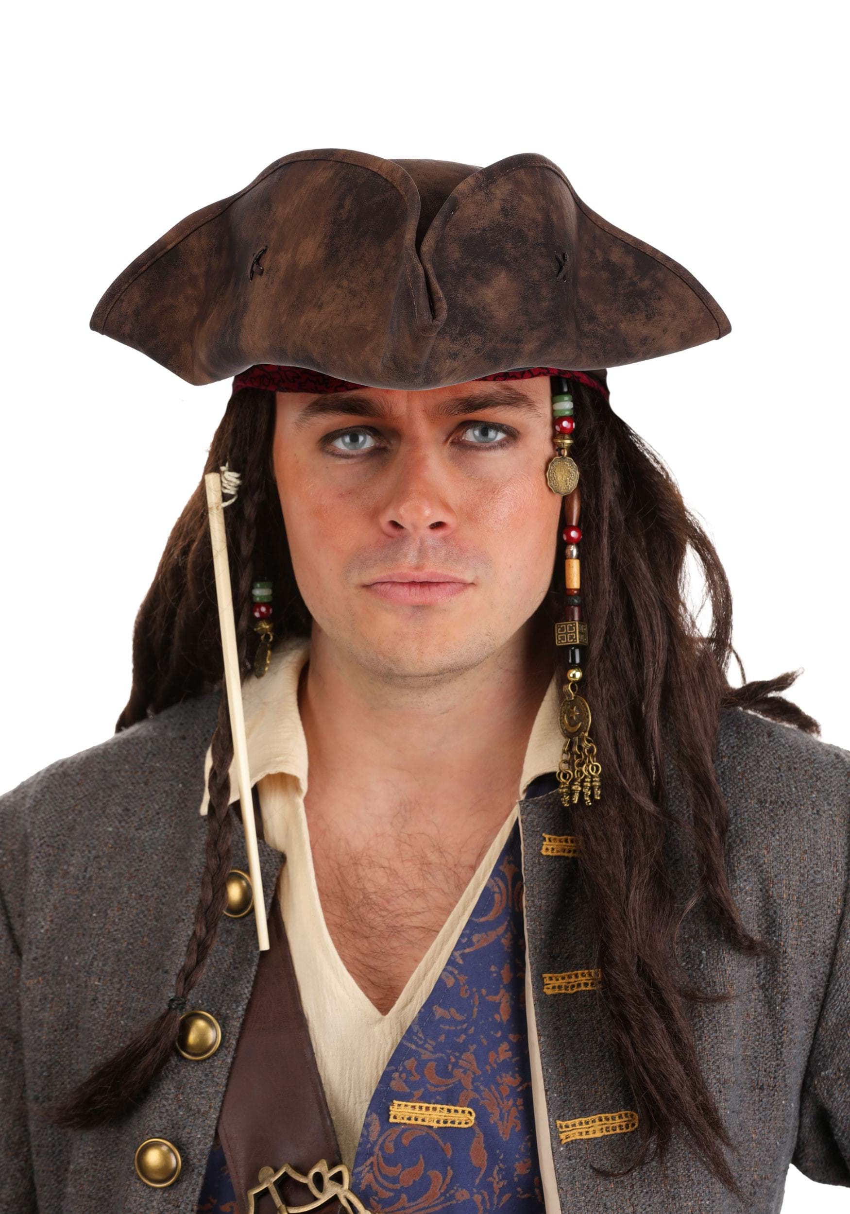 The classic tricorn hat and stretch jersey bandana top off the outfit, along with attached bead clips to match Jack's style. Four embossed faux leather belts have their own unique buckles and layer over slacks and jacket while you'll sport Jack's signature mustache and beard braids, too! As a final addition, you can check the functional compass to know your look is on target!