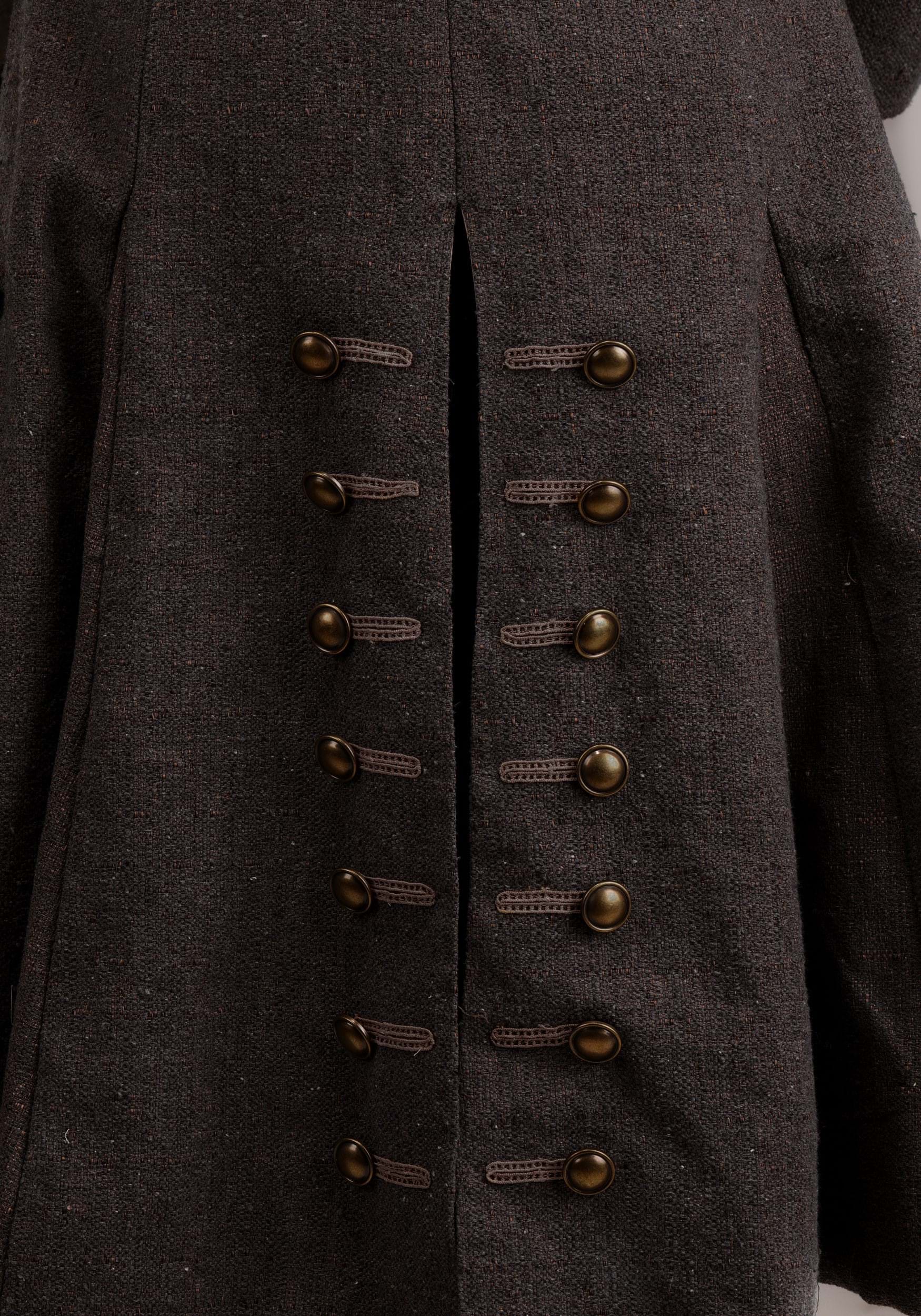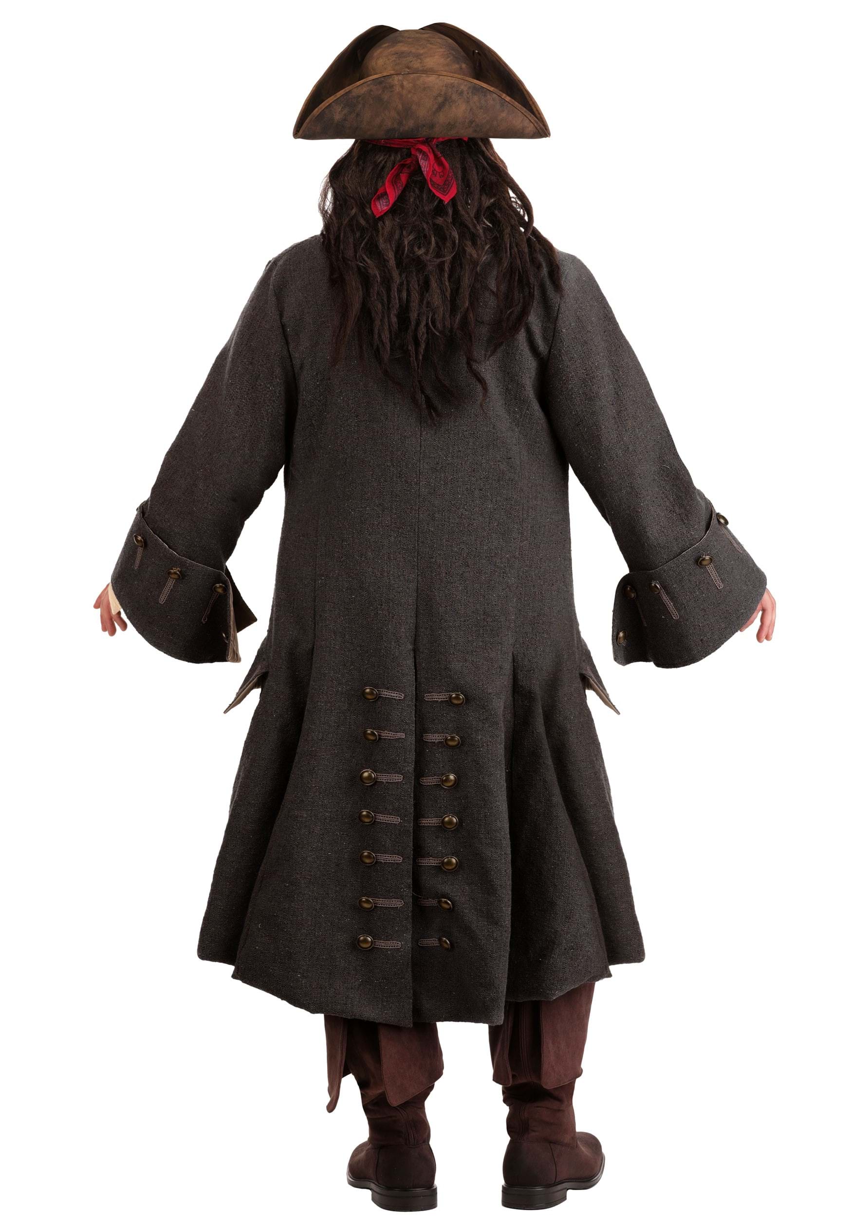 The woven jacket features intricate embroidered accents, functional pockets, tacked cuffs, and a satin lining. A jacquard vest with stylized artwork and faux pockets pair with the linen-blend shirt to create a layered look that recreates Jack Sparrow's style and elastic-waist pants and a raw-edged sash add to the complete silhouette.