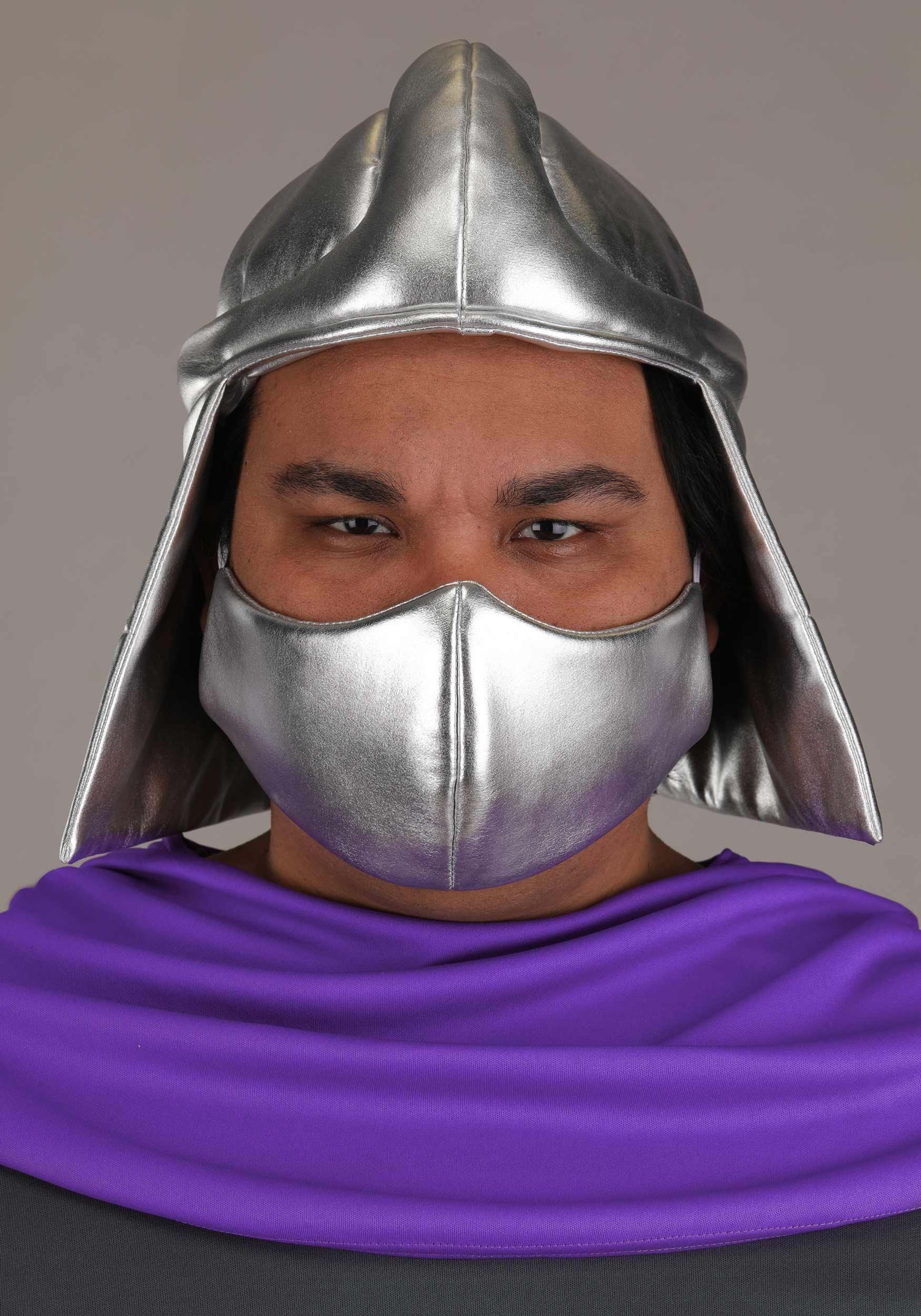 The helmet is made of metallic foil stretch spandex with soft padding inside to hold its shape, giving you Shredder’s signature silhouette without needing a villainous headbutt. The tunic is crafted from heathered grey jersey and features built-in shoulder guards with shiny, silver-tone spikes—no forging required.