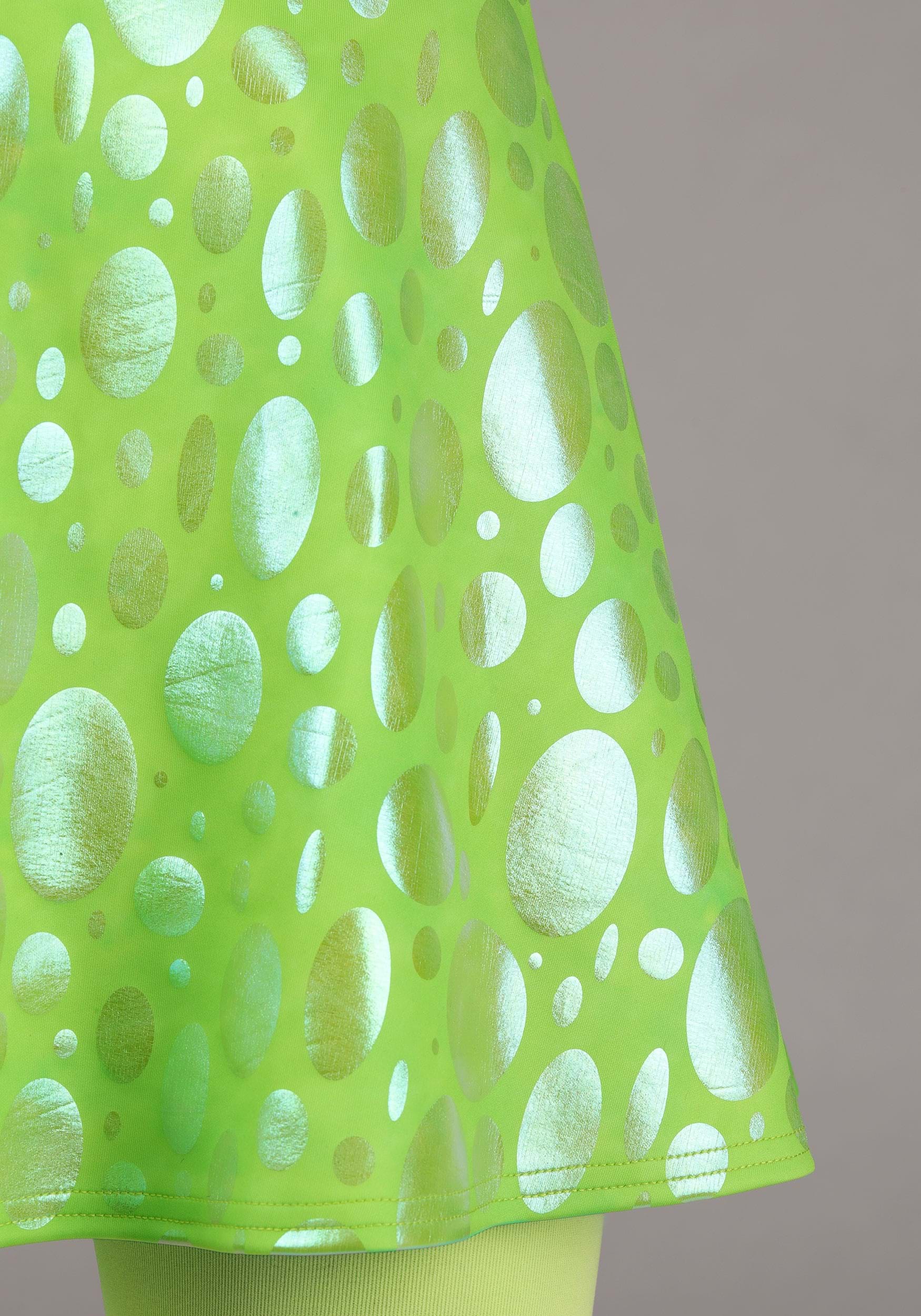 The stretchy scuba knit top is cropped with a playful jagged hem that mimics Mike's toothy grin, while a bold embroidered eye patch centers the look. Iridescent foil scales add a sparkle to the lime green palette. The matching skirt completes the illusion of Mike's mouth, featuring an elastic waist for comfort and flow. Satin horns perch on a soft headband, and the matching gloves and stuffed claws complete the look.