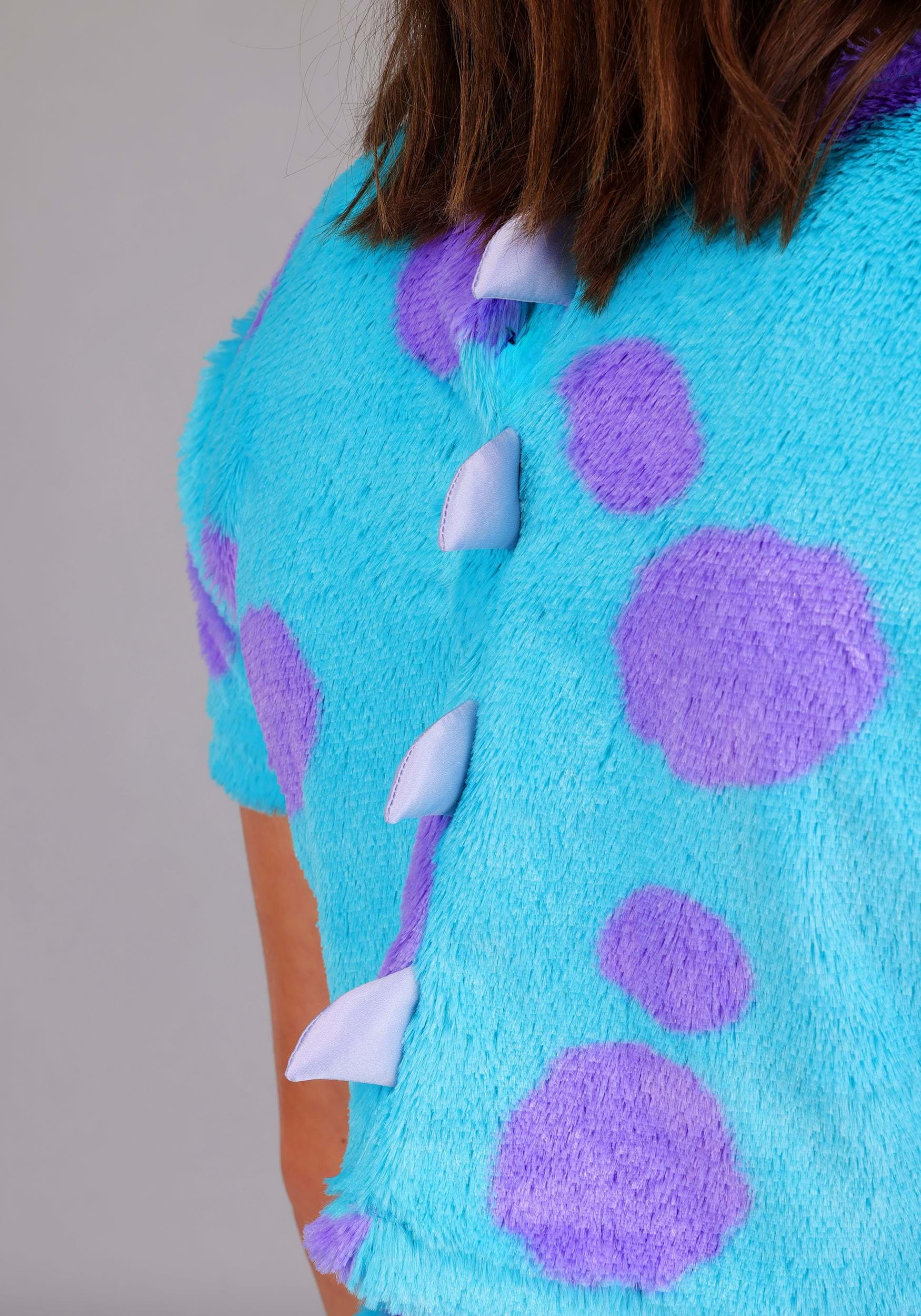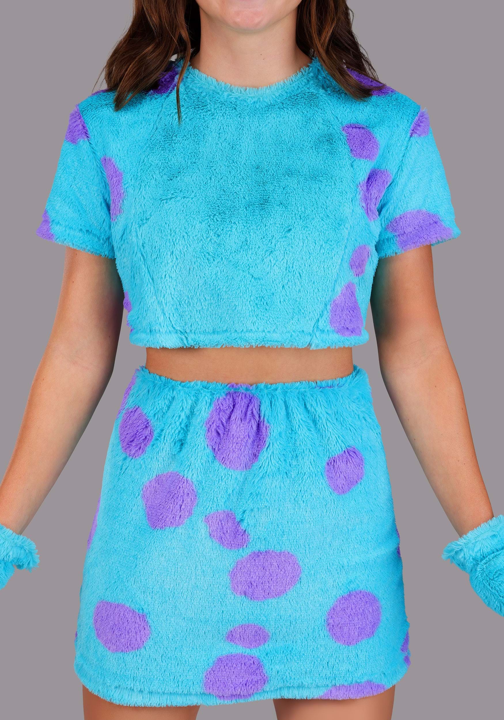 This stretchy faux fur top is speckled in Sulley's signature aqua and lavender pattern, complete with shiny satin spikes along the back. The coordinating skirt features a comfy elastic waistband and a plush tail. A fabric-covered headband holds puffy satin horns with detailed embroidery, and matching gloves finish the look with pointed satin claws—ready for high-fives or roars!