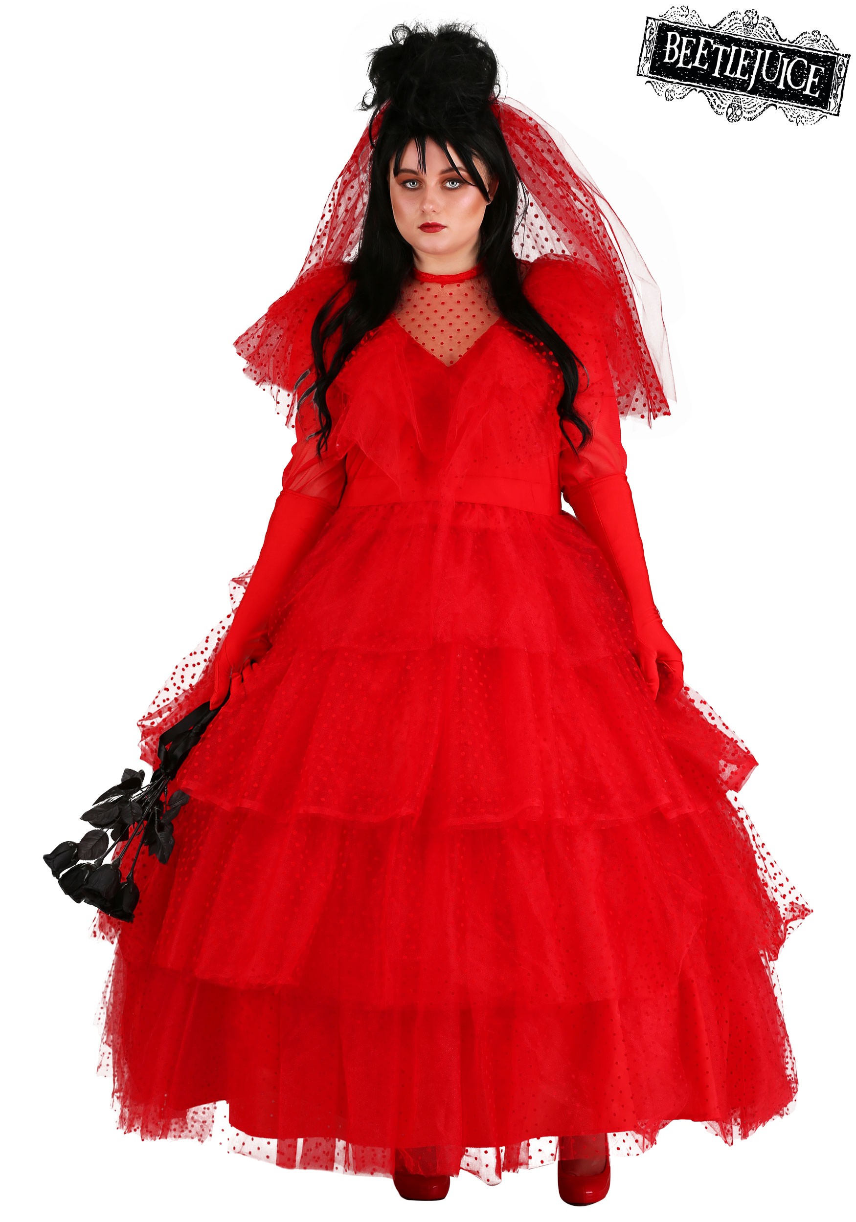 This is an exclusive Plus Size Premium Lydia Deetz Wedding Dress Costume for Women.