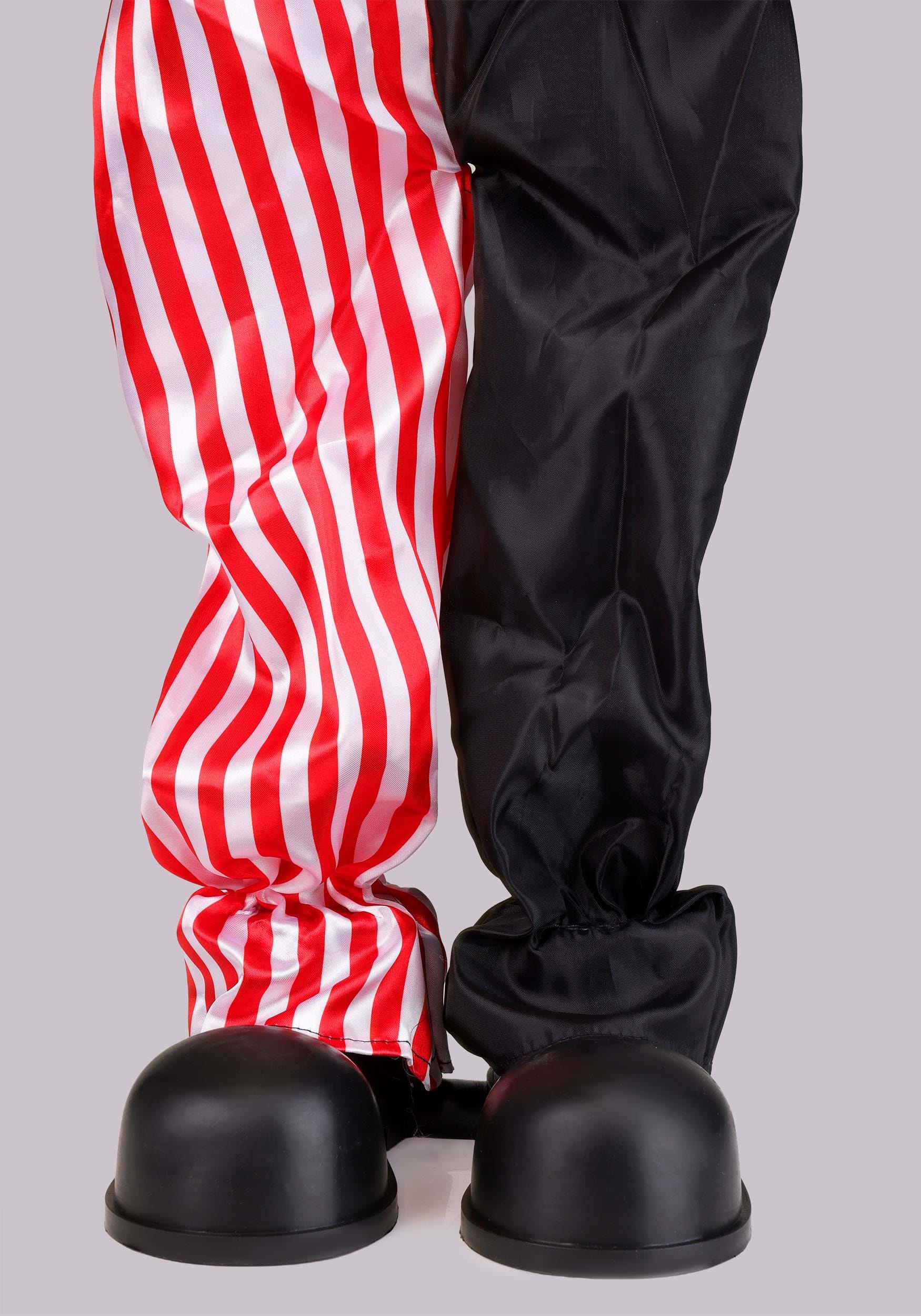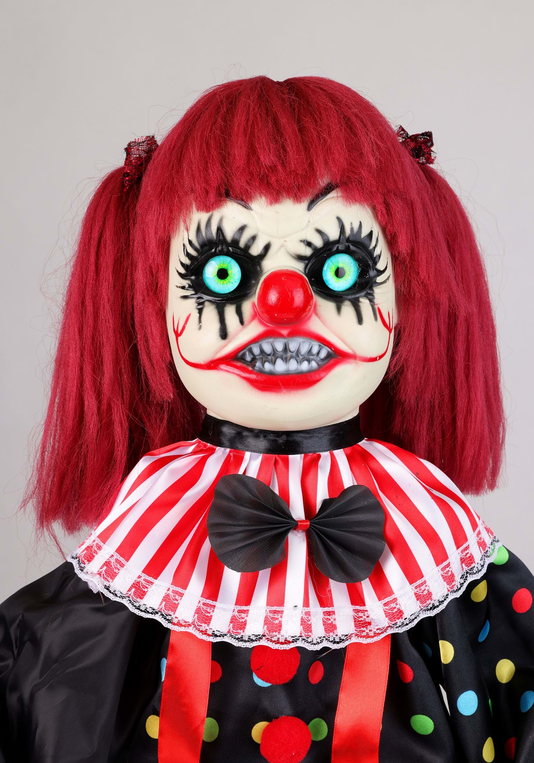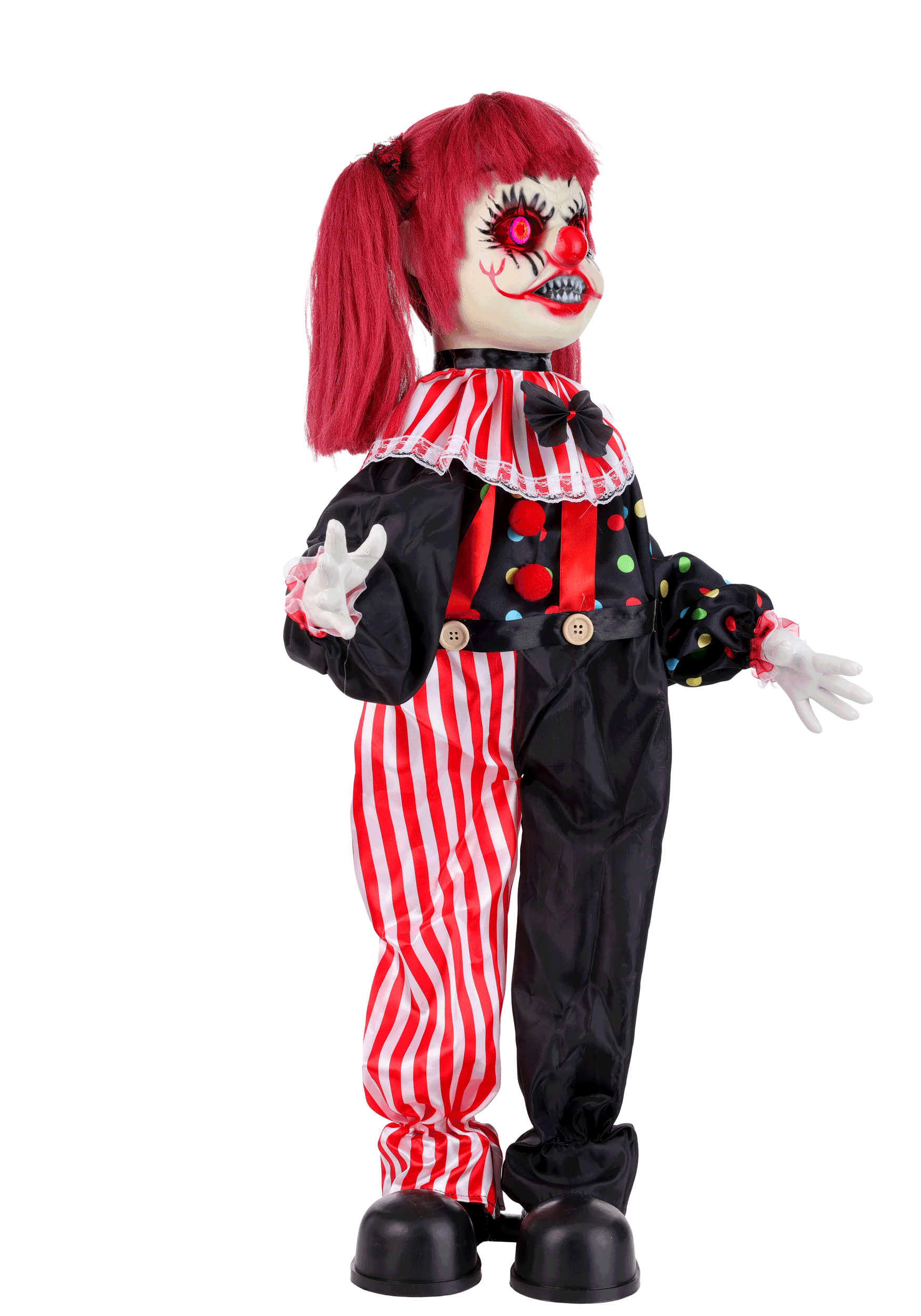 Sarah Slight the Creepy Clown Animatronic Decoration features a standing animated clown girl dressed in colorful fabric clothing, supported by a sturdy plastic stand. Her bright costume combines striped and polka-dot patterns with ruffled accents, giving the decoration a classic circus look with a sinister edge. When activated, Sarah's eyes flash an intense red as she twists back and forth at the hips.