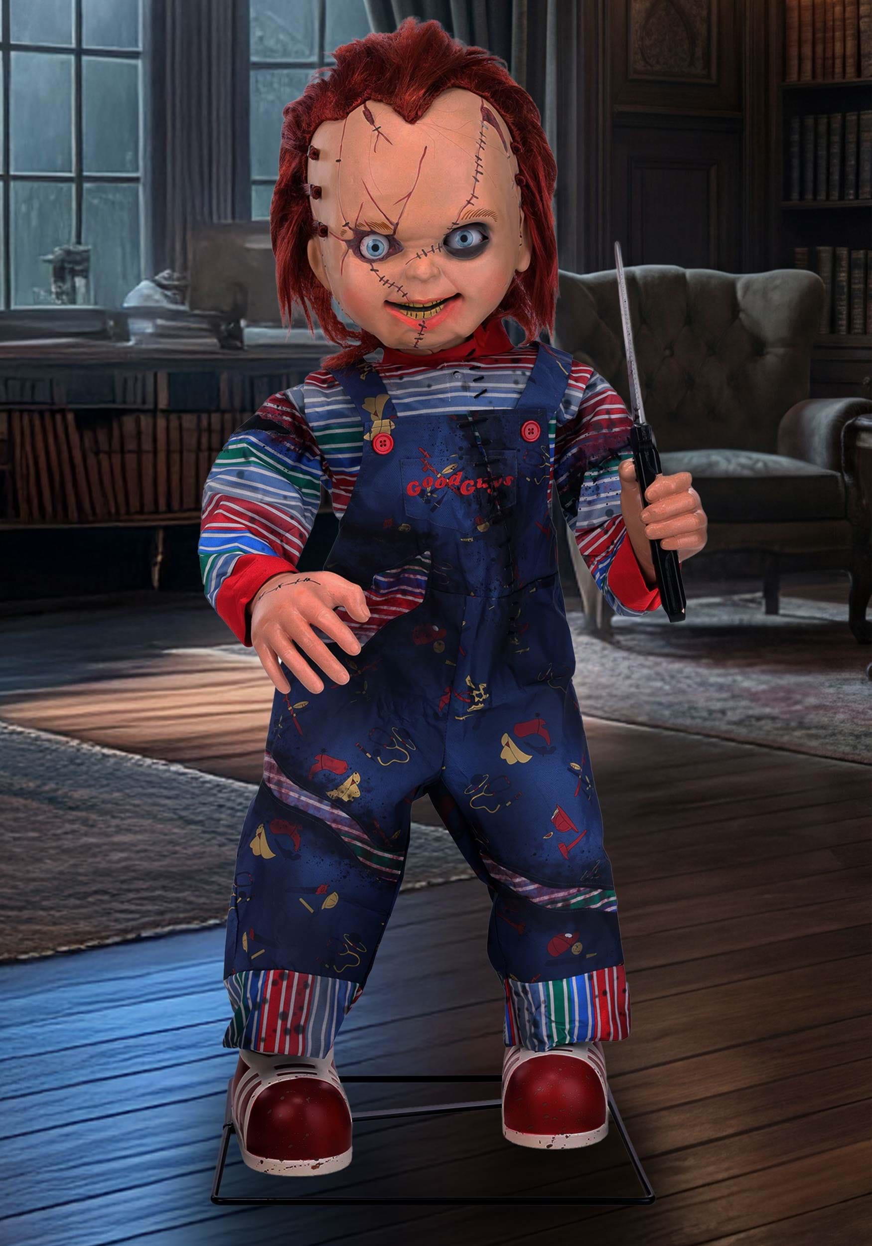 This officially licensed Chucky animatronic comes with everything you need to build one disturbingly cheerful nightmare machine. When fully assembled, he stands 3.5 feet tall and includes a molded plastic head and hands, foam-covered arms, and his signature overalls-and-stripes look made from polyester fabric. Assembly takes about 45 minutes, emotionally recovering may take longer.