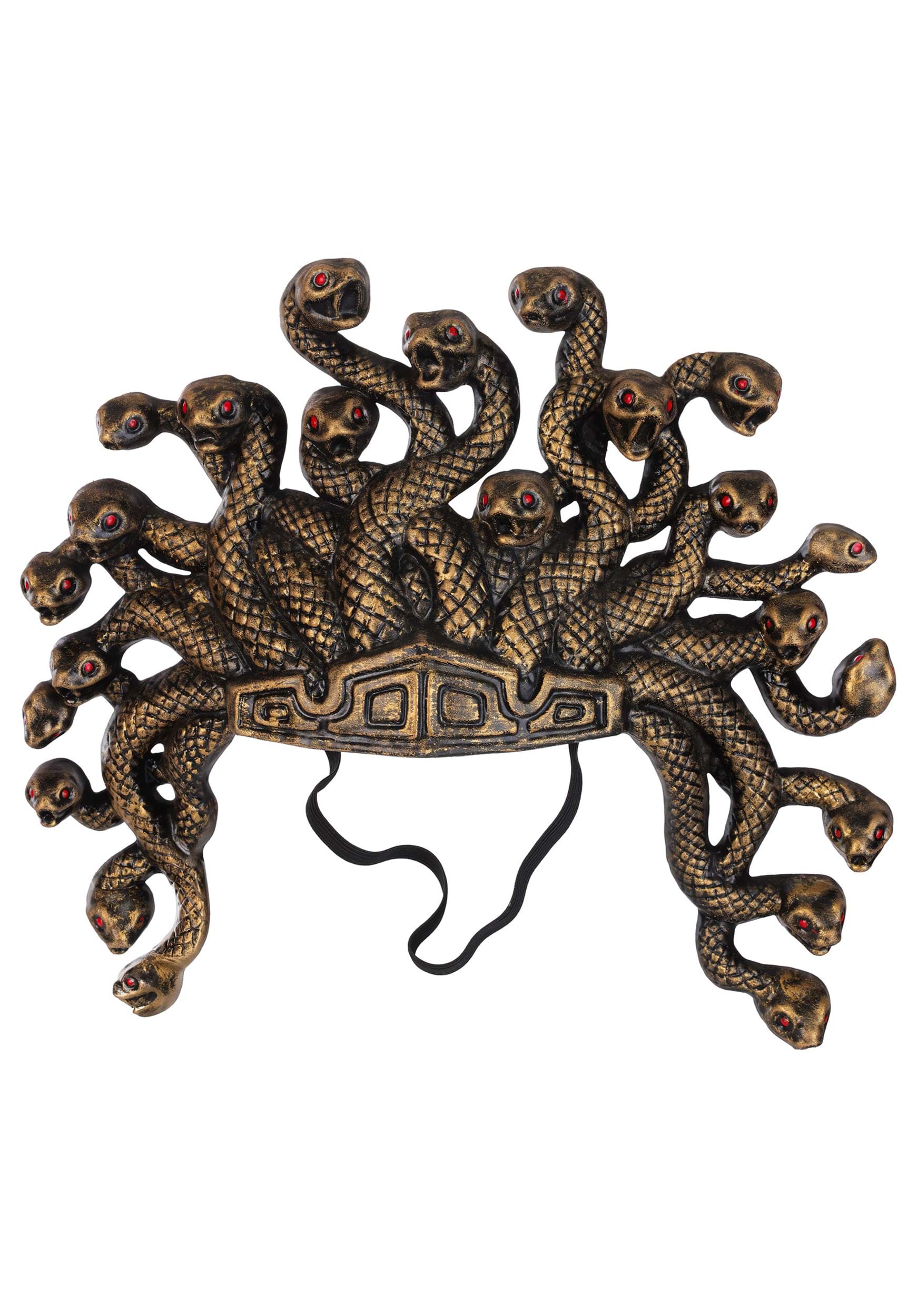 This molded headpiece features a coiling nest of sculpted snakes with gaping jaws and textured scales. Painted in a burnished gold-and-black finish, it captures that freshly-escaped-from-a-ruined-temple look with no actual danger required. It’s lightweight enough for comfort but detailed enough to look like you commissioned Hephaestus himself.