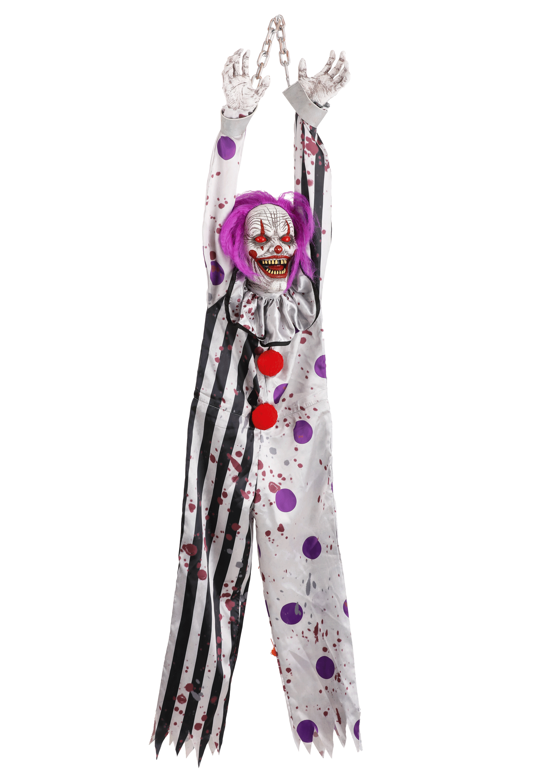 Add some frightening fun to your Halloween décor when you add this 4.5FT Spine Shivering Shaking Animated Evil Clown Decoration to your display! This creepy clown is made of lightweight plastic and satin fabric, and hangs from the attached plastic chain. When the motion sensor is activated, this prop will light up, shake, and make eerie sounds. This delightfully dreadful clown is sure to add plenty of horror to your holiday display!