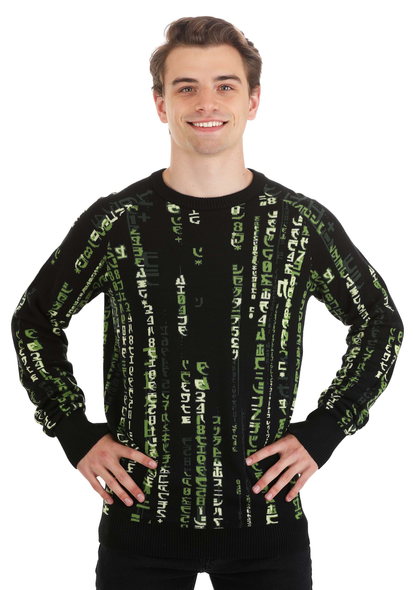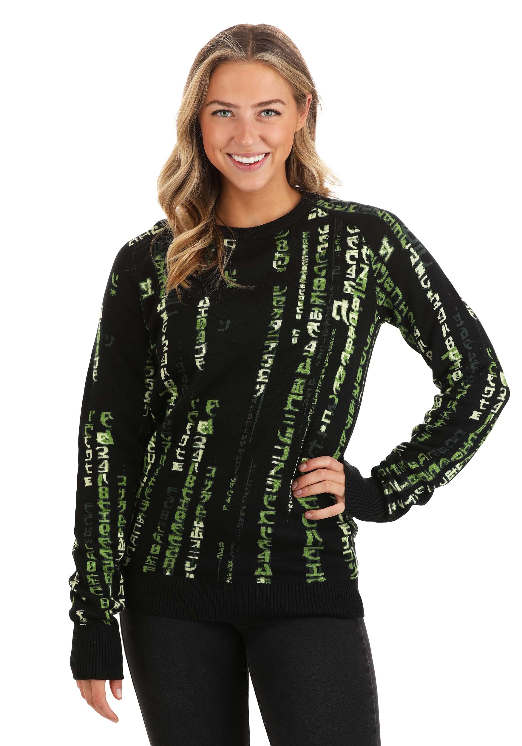 Fans of the Matrix franchise are going to love our exclusive Matrix sweater for adults. It features that iconic Matrix code as a knit pattern—with the characters in various shades of green to bring the life the fade of the digital rain effect. A unisex fit means it's great for men and women to wear to sweater parties, movie nights, or even to wear as everyday apparel. And it's Warner Brothers officially licensed, so you can be sure you're wearing authentic Matrix apparel whenever you slip it on.