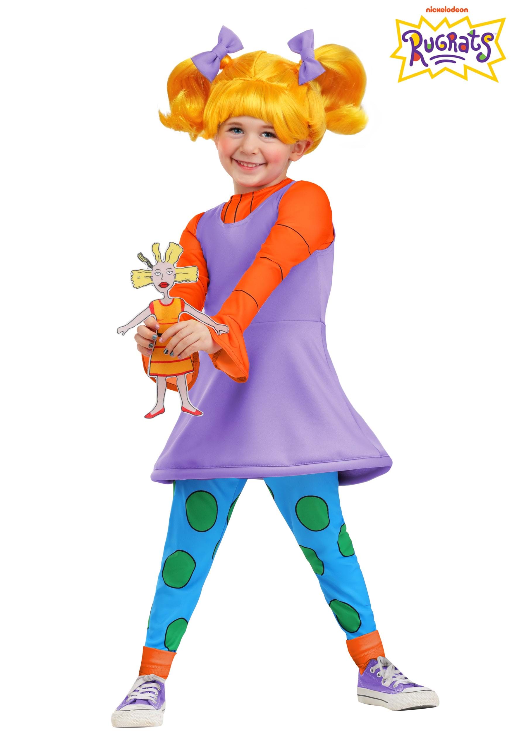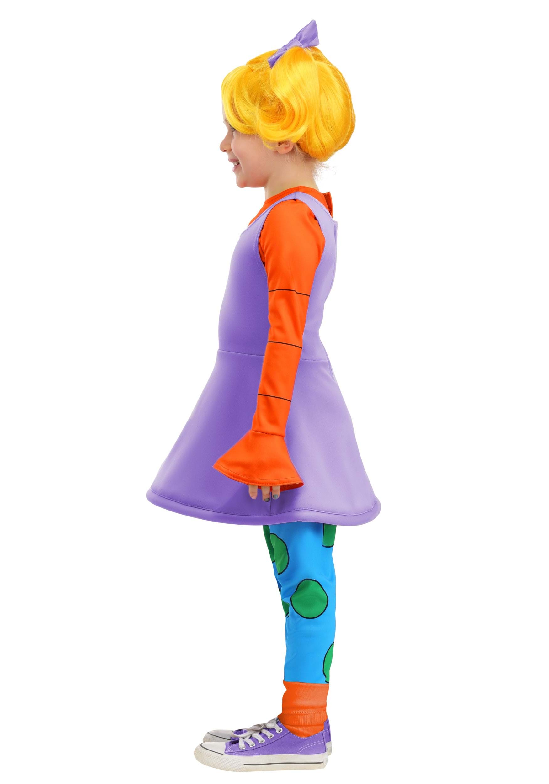 The costume features a purple knit dress with an attached orange long-sleeve shirt underneath, just like Angelica wore in the cartoon. It’s soft, easy to pull on, and designed for layering over everyday clothes—because no toddler costume should require negotiations. Blue leggings with big green polka dots complete the outfit, stretching comfortably at the waist for running, jumping, and firmly stomping in protest.