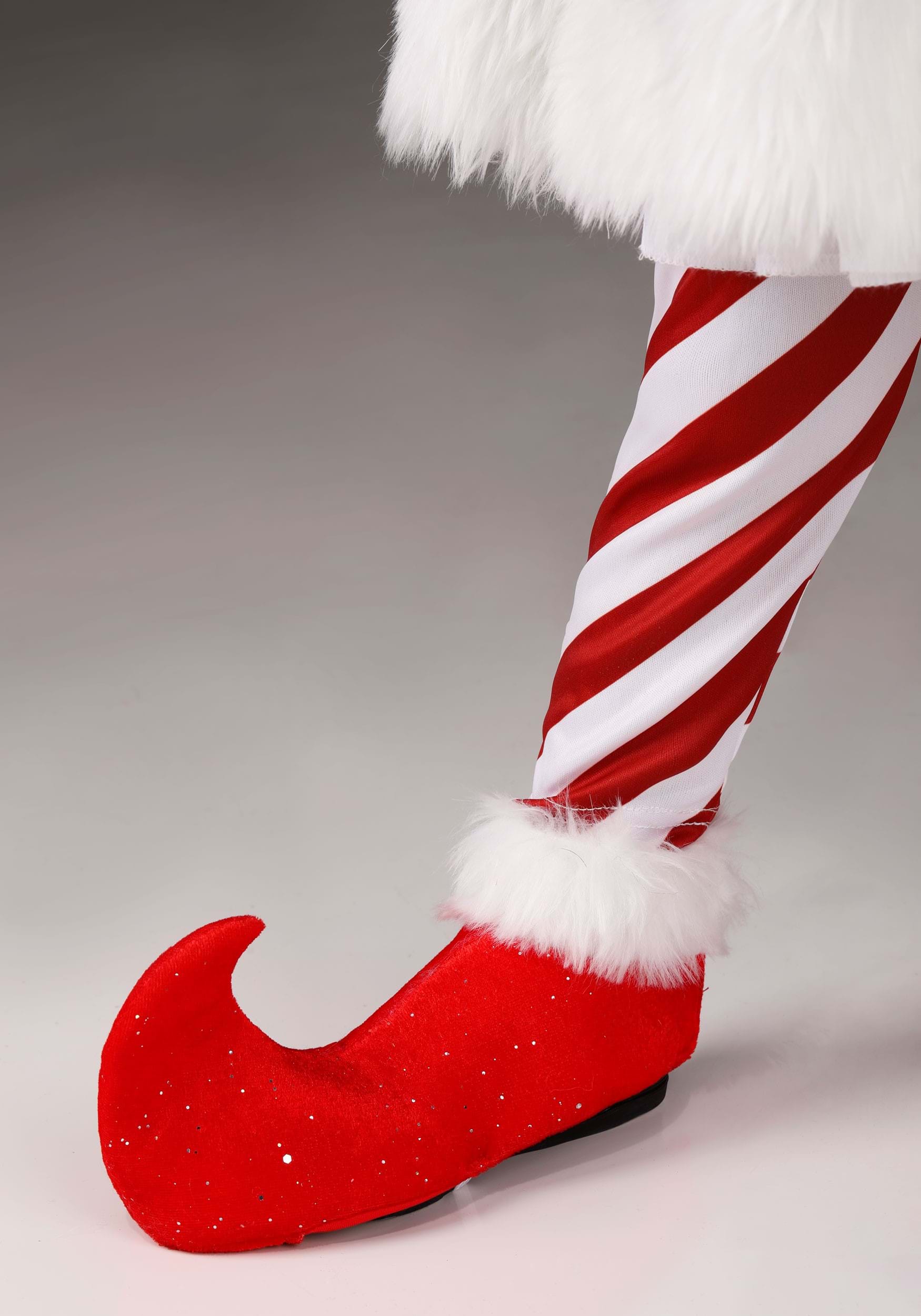 The striped leggings are soft, stretchy, and comfortable enough for dancing, running, or attempting to sneak a cookie before dinner. Matching red sparkle mitts slip on easily, and the coordinating shoe covers secure under the foot with elastic bands and hook and loop fasteners for a snug fit. Topping it off is a red sparkle velour hat trimmed in white faux fur, complete with a fluffy pom-pom and foam ears sewn right in—because what’s an elf without those classic pointy ears?