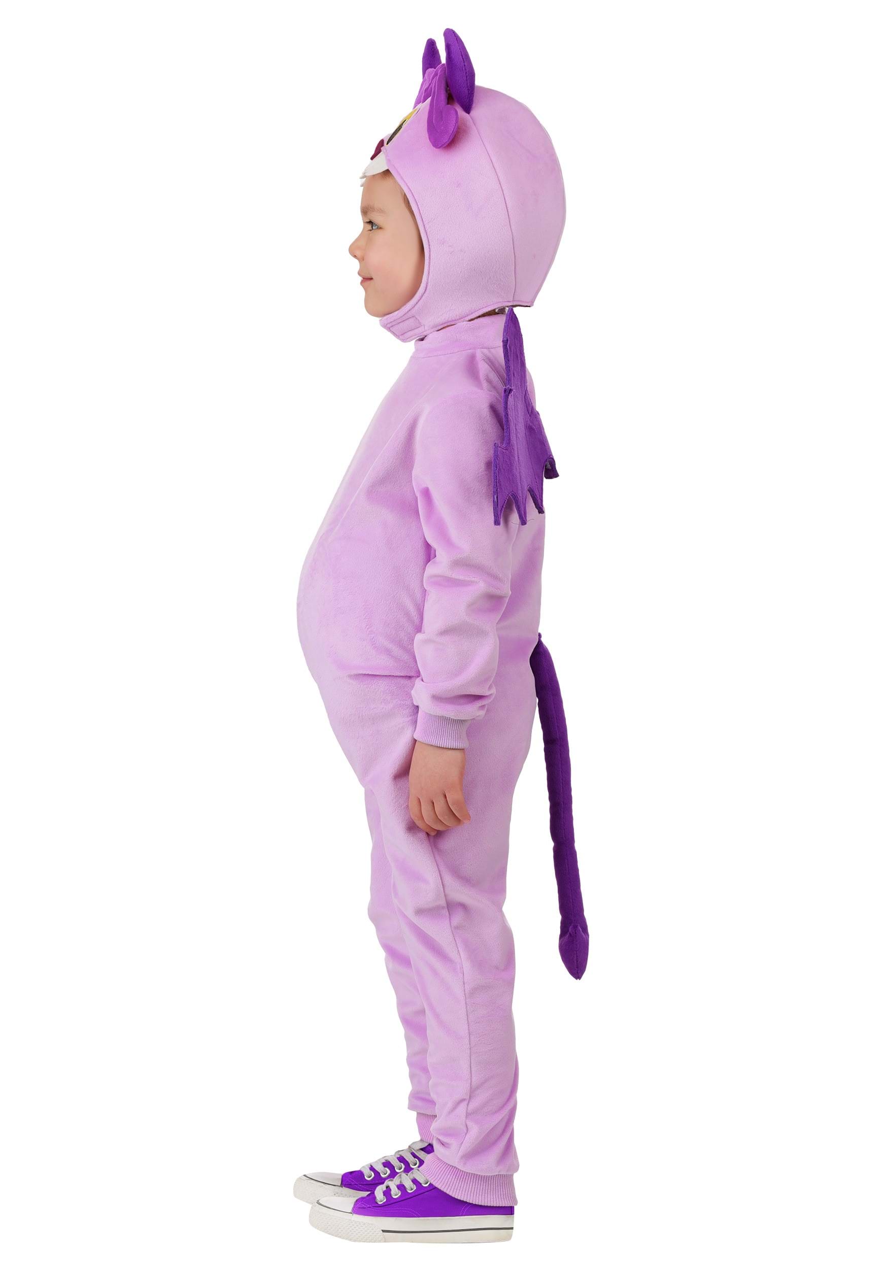 The soft purple cuddle-plush jumpsuit fastens with a back zipper for quick dressing, while rib-knit cuffs at the wrists and ankles ensure a snug fit. A polyfill tummy with a playful swirly belly button design adds charm, and the asymmetrical wings attach easily with hook-and-loop closures. The pointy tail and a headpiece with minky hair, horns, and embroidered details complete this devilish look!