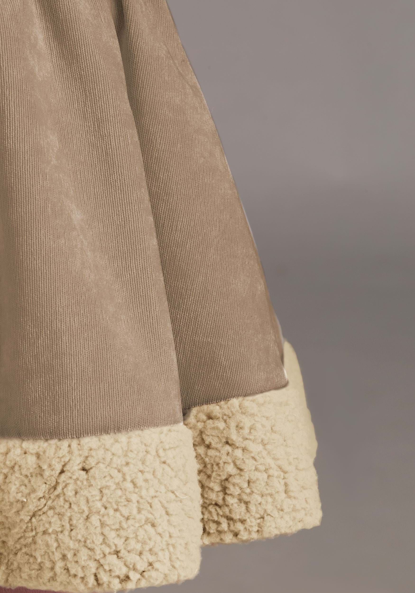 - Corduroy dress has sherpa fleece collar, sleeve cuffs and hemline, nylon and stiff tulle skirt lining, elastic waistband, hook and loop fastener down center front, sewn on minky hand covers have elastic bands to secure on hands
