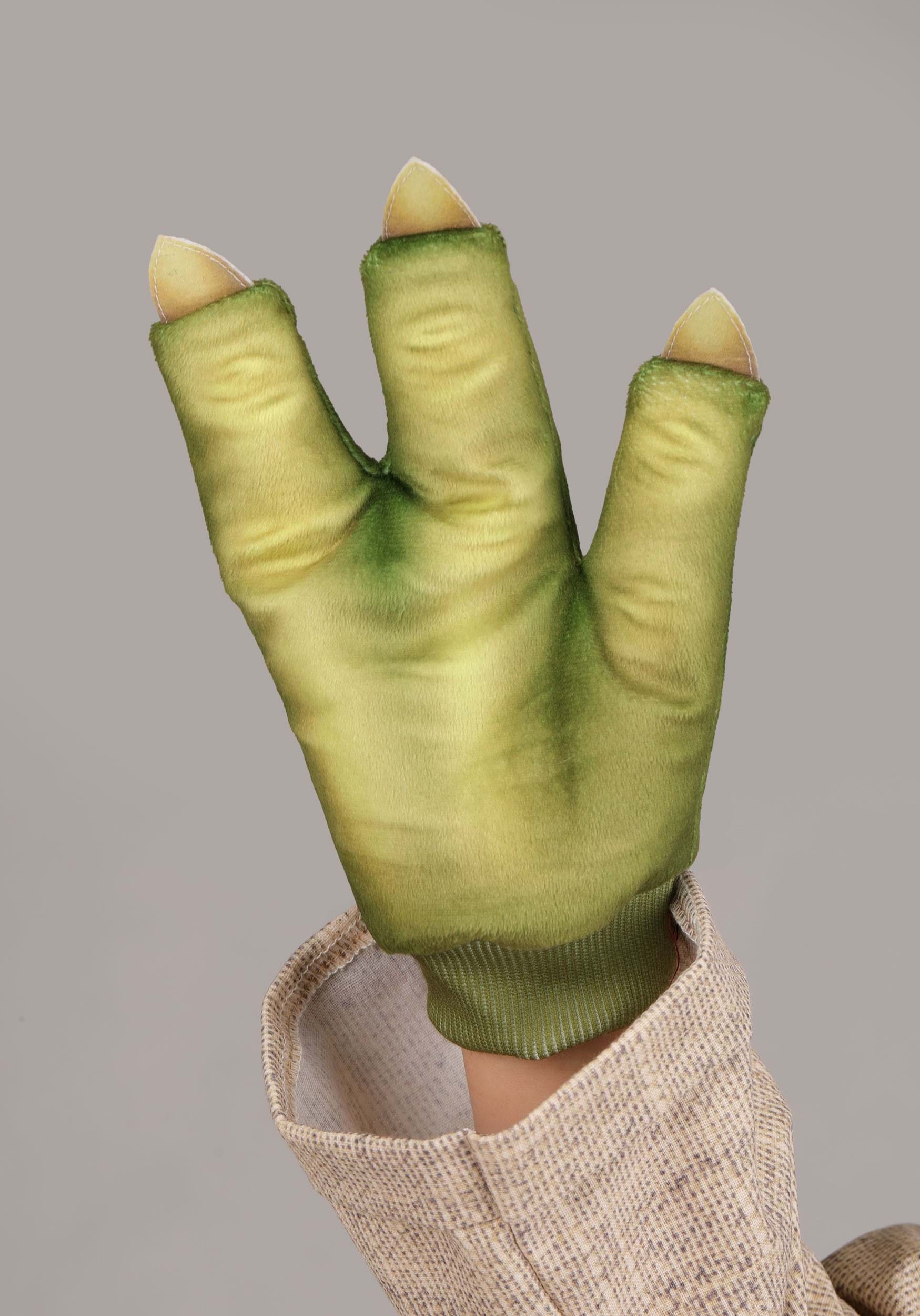 The attached hood is made of plush Minky fabric and includes stuffed foam ears with fluffy fur tufts and stitched head details. Matching green gloves slip on easily, with printed Yoda skin texture, felt nails, and stretchy cuffs to keep them comfy. It also includes brown jersey leggings and a matching mock neck shirt that fastens in the back.