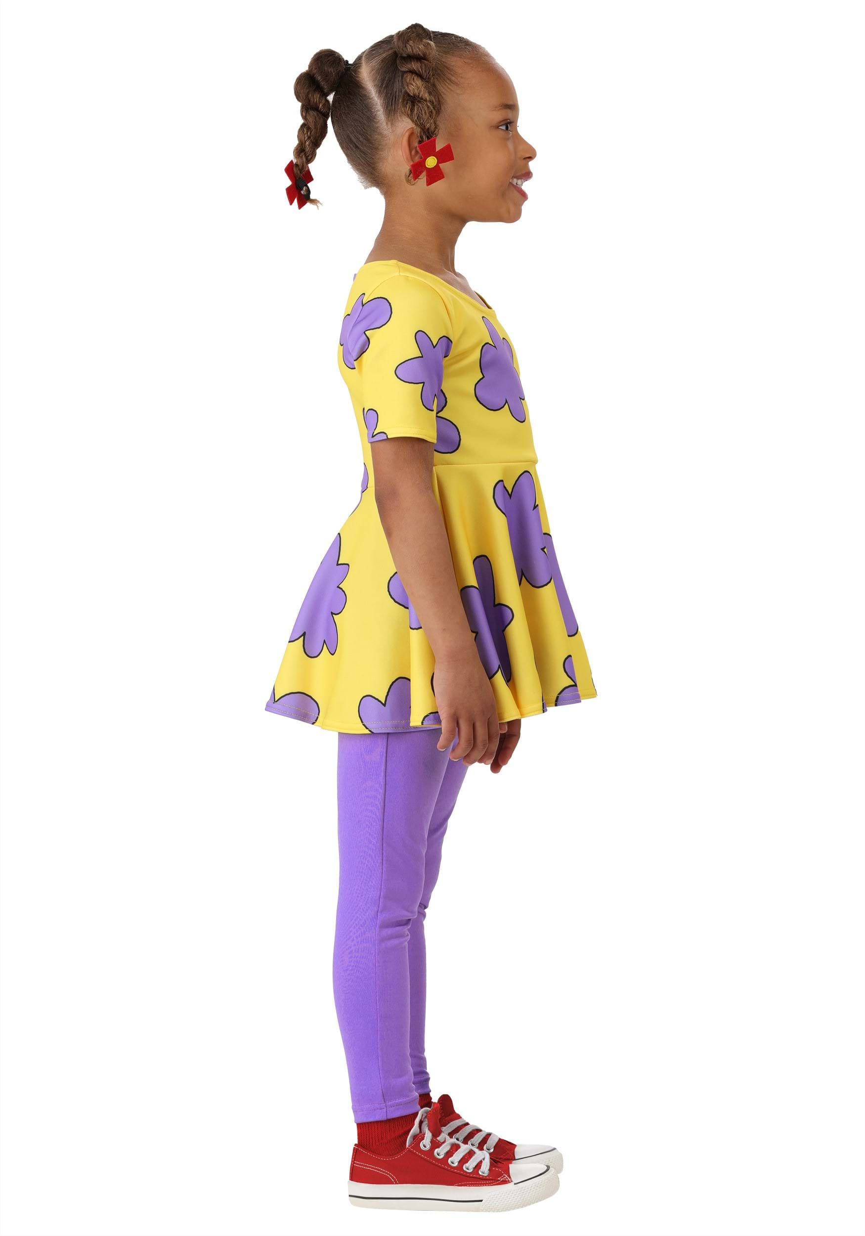 This costume includes a yellow dress printed with big purple flowers, just like Susie wore on the classic Rugrats series. It’s made of soft scuba-knit material that gives the dress a bit of structure without adding bulk, and the short sleeves and flared skirt keep things comfy for full days of pretend play, trick-or-treating, or cartoon marathons on the couch.