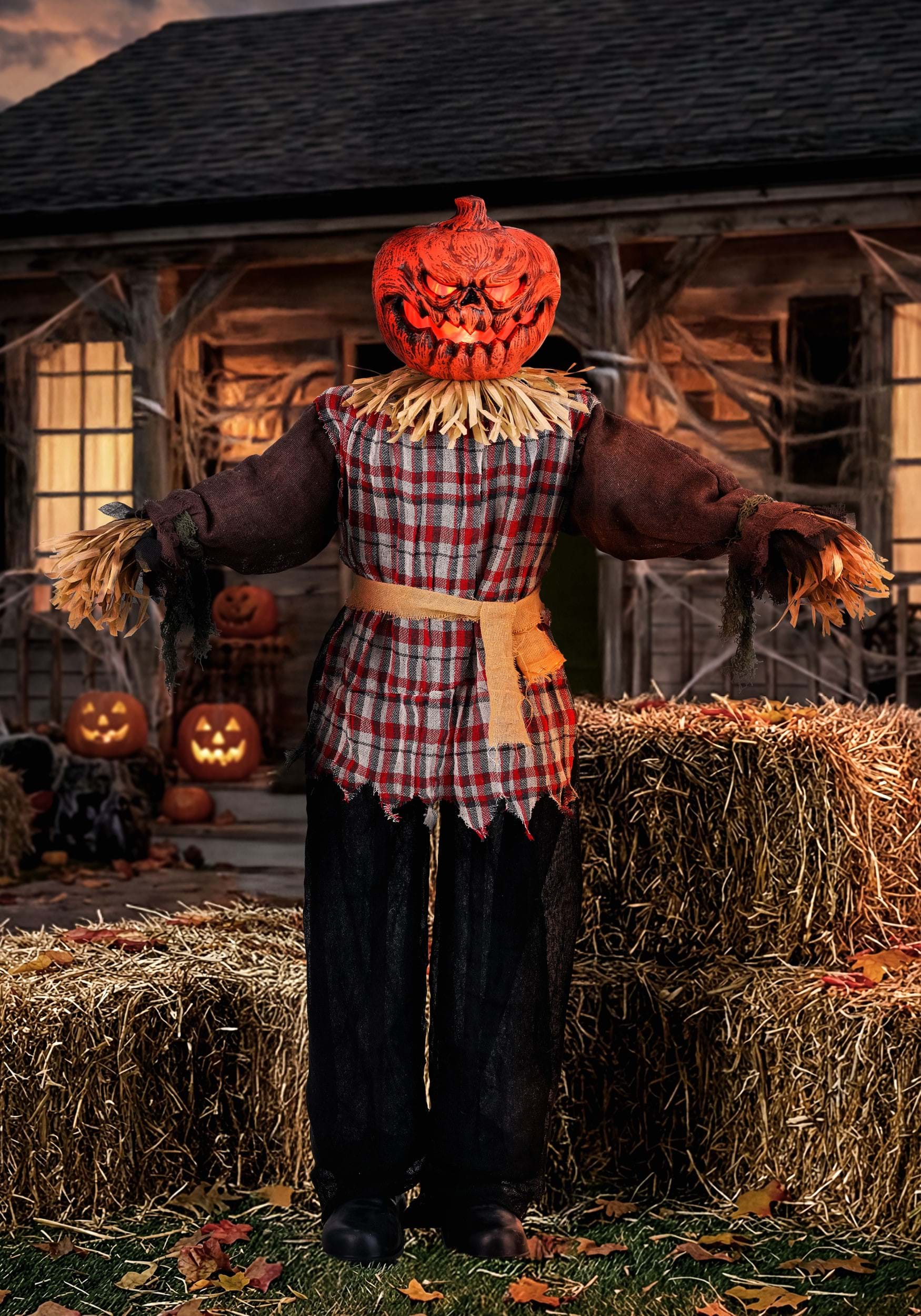 Draped in tattered farmhand clothes and framed by straw, he looks like the scarecrow who stayed out in the field far too long and picked up a poetic streak along the way. Guests wandering up the path may expect the usual pumpkin stare, only to discover they've stumbled into a rather theatrical Halloween monologue.