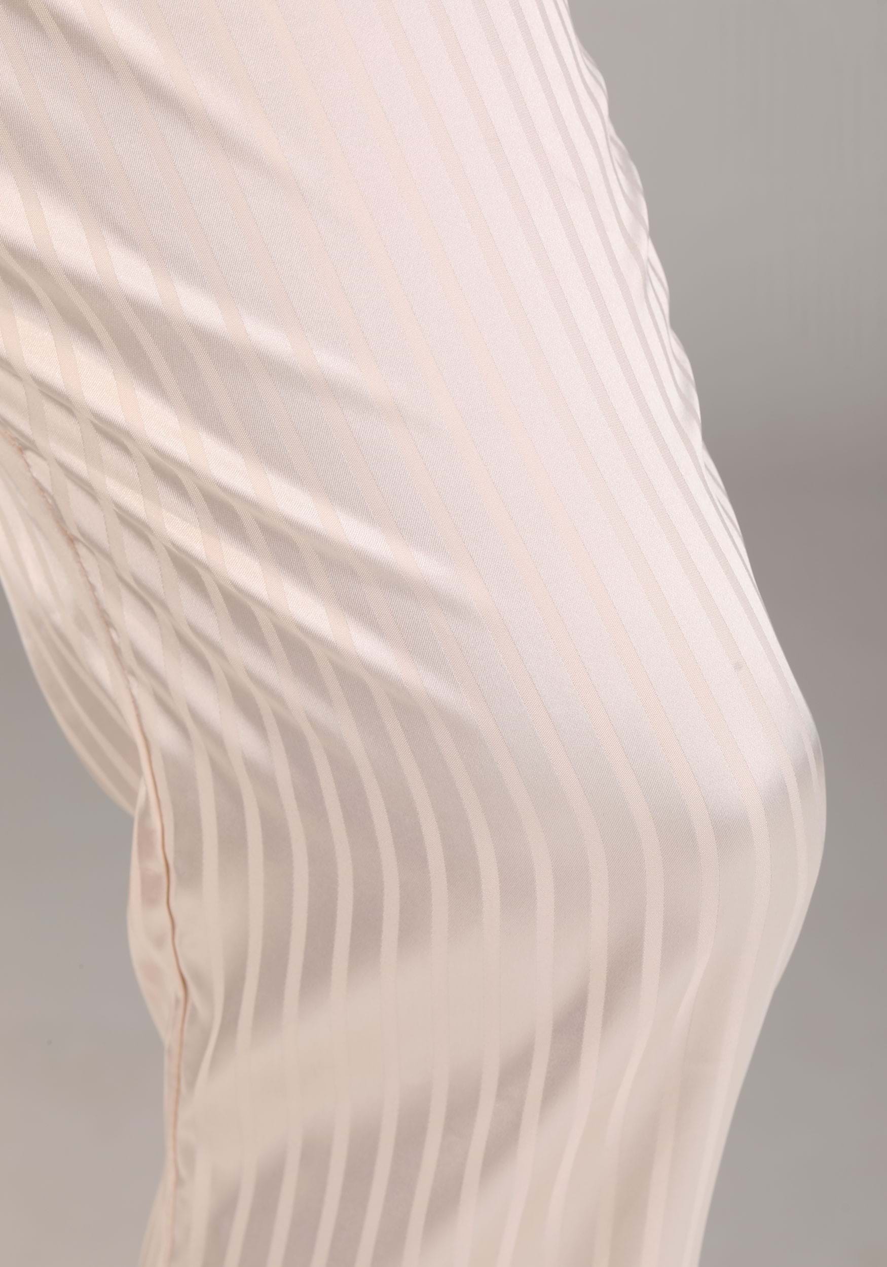 - Striped satin jumpsuit has a zipper down center front, matte satin collar and lapels