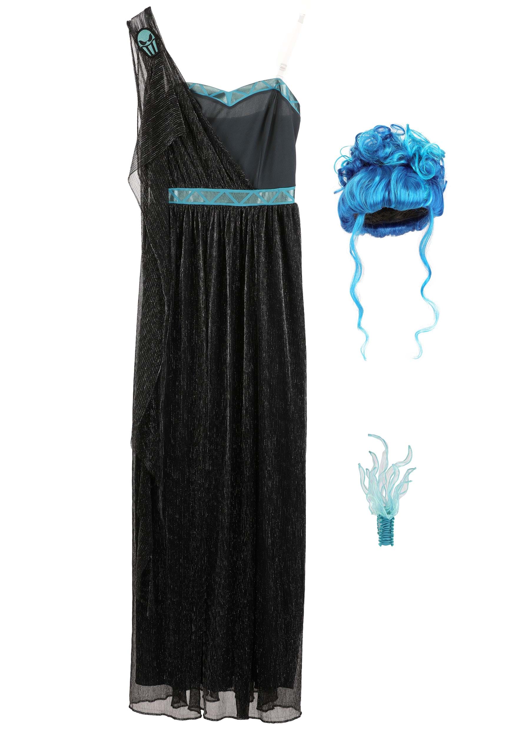 This attractive Made By Us outfit starts with a soft knit sleeveless dress with a zipper down the back and detachable clear shoulder straps for a secure fit. A pleated mesh overlay, metallic printed belt and neckline, and metallic embroidered skull shoulder clasp, give Hades's signature toga a new shimmer. Finally, a dramatic leg slit and iridescent organza flame corsage with an LED light ensures the costume has a fiery finish.