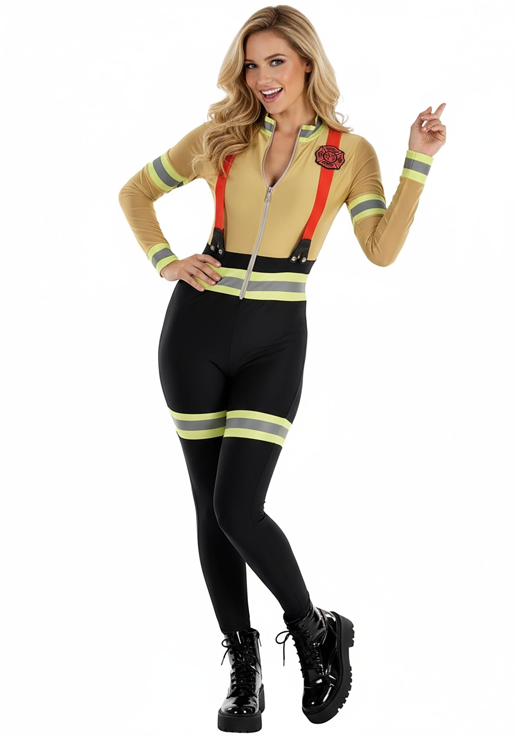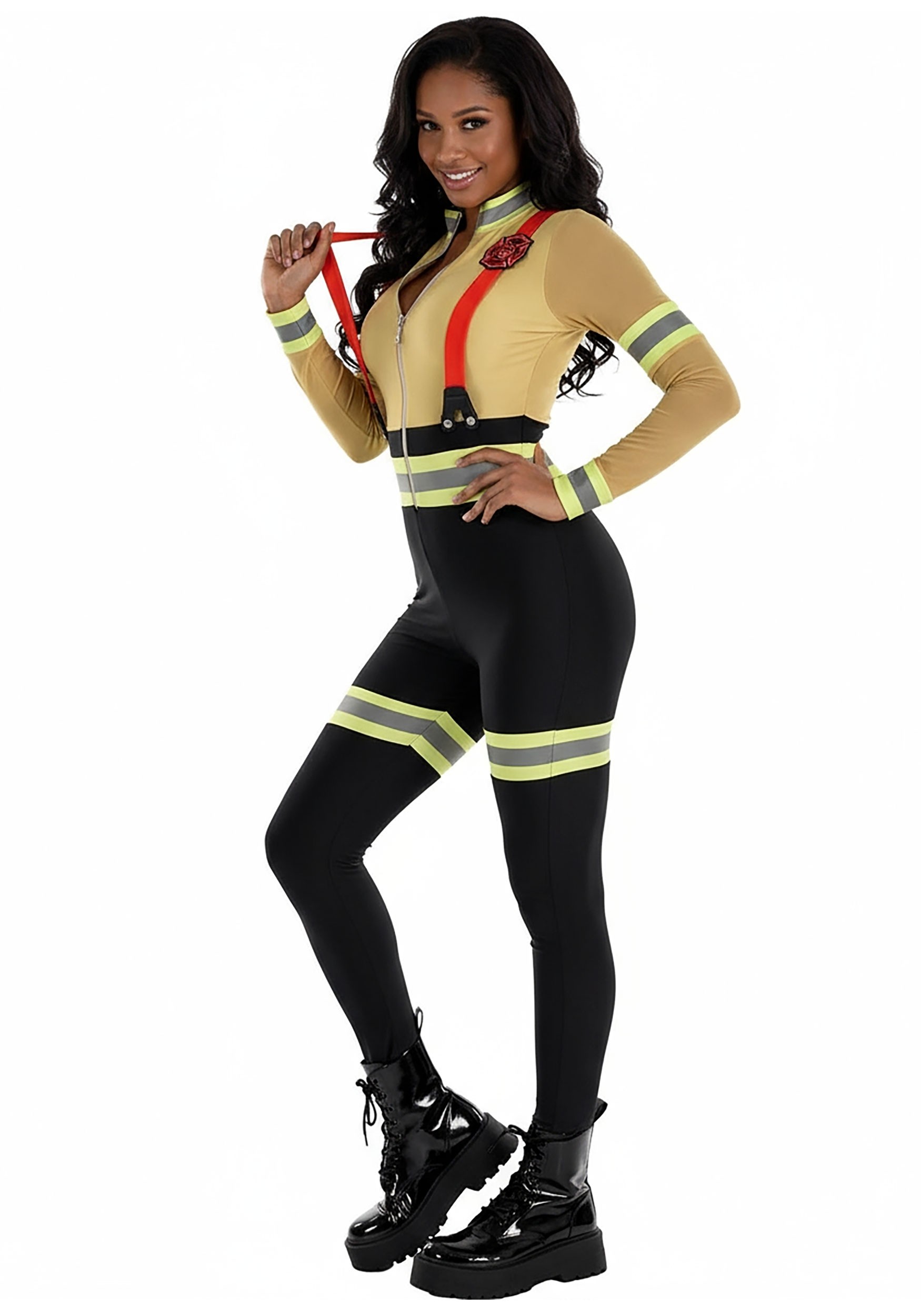 This firefighter-inspired jumpsuit is designed for a sleek, form-fitting look with just the right amount of stretch—because saving the day should never feel restrictive. The tan top half is styled like a traditional firefighter coat, complete with yellow and reflective stripes on the sleeves, wrists, waist, and thighs. The bottom half transitions to black, creating that firefighter uniform contrast.