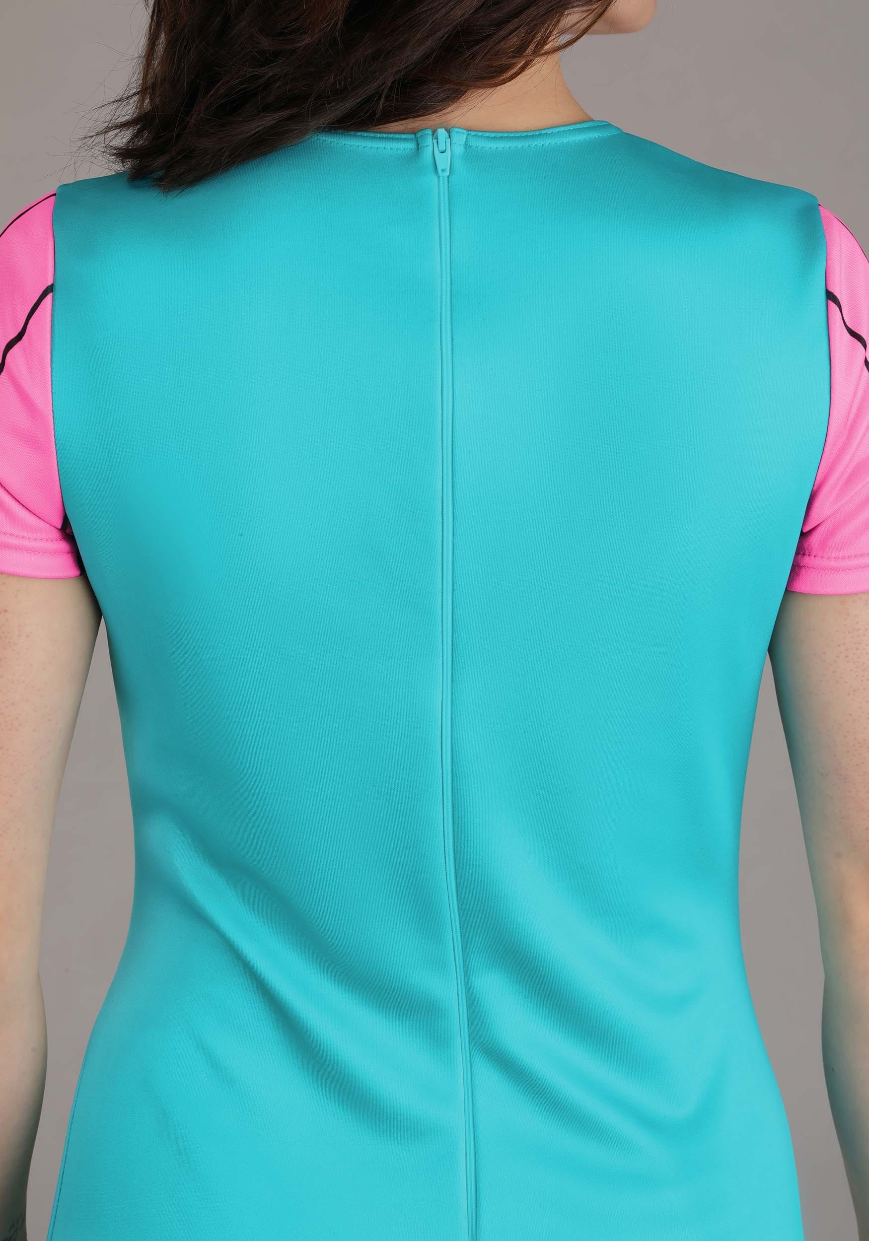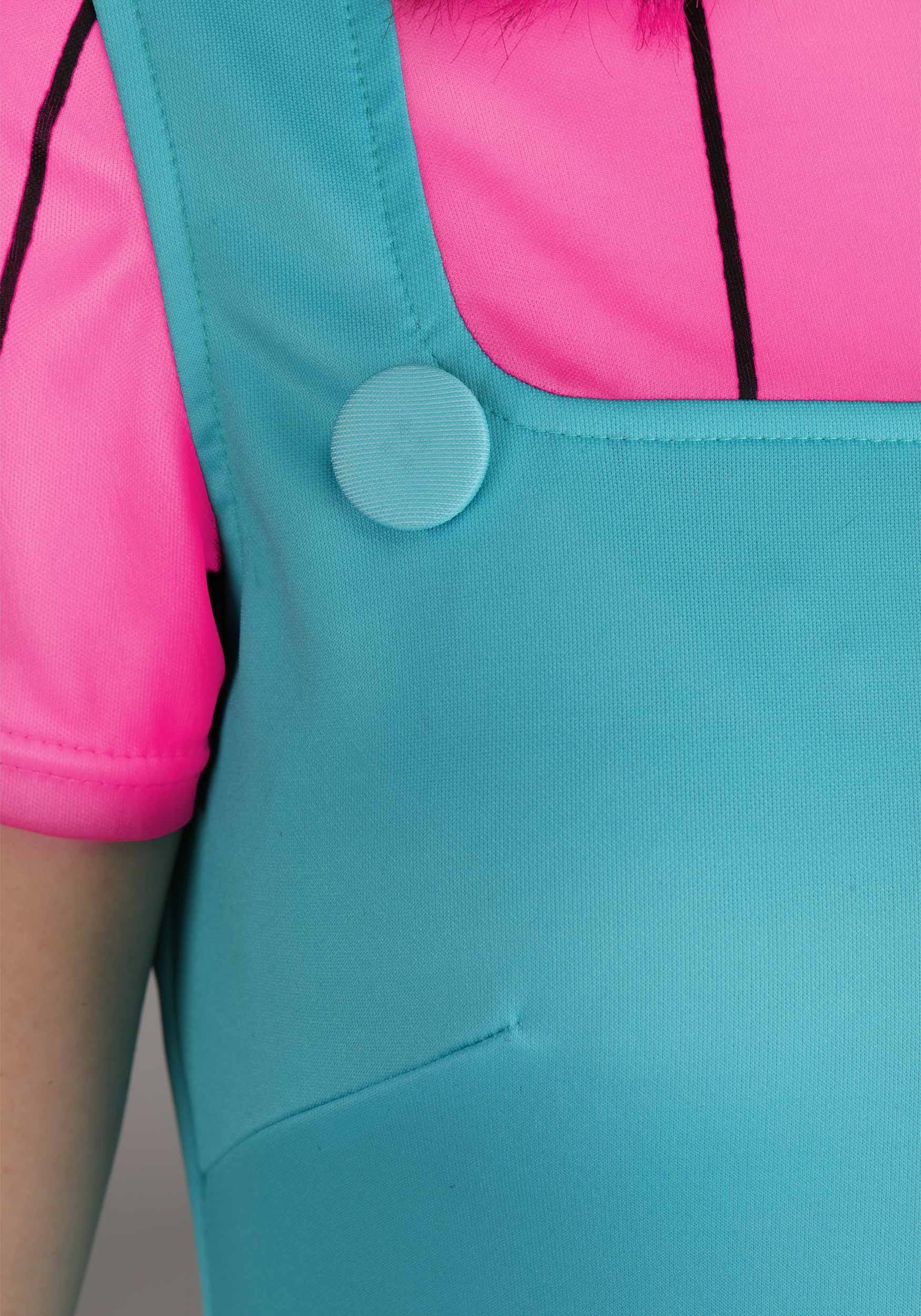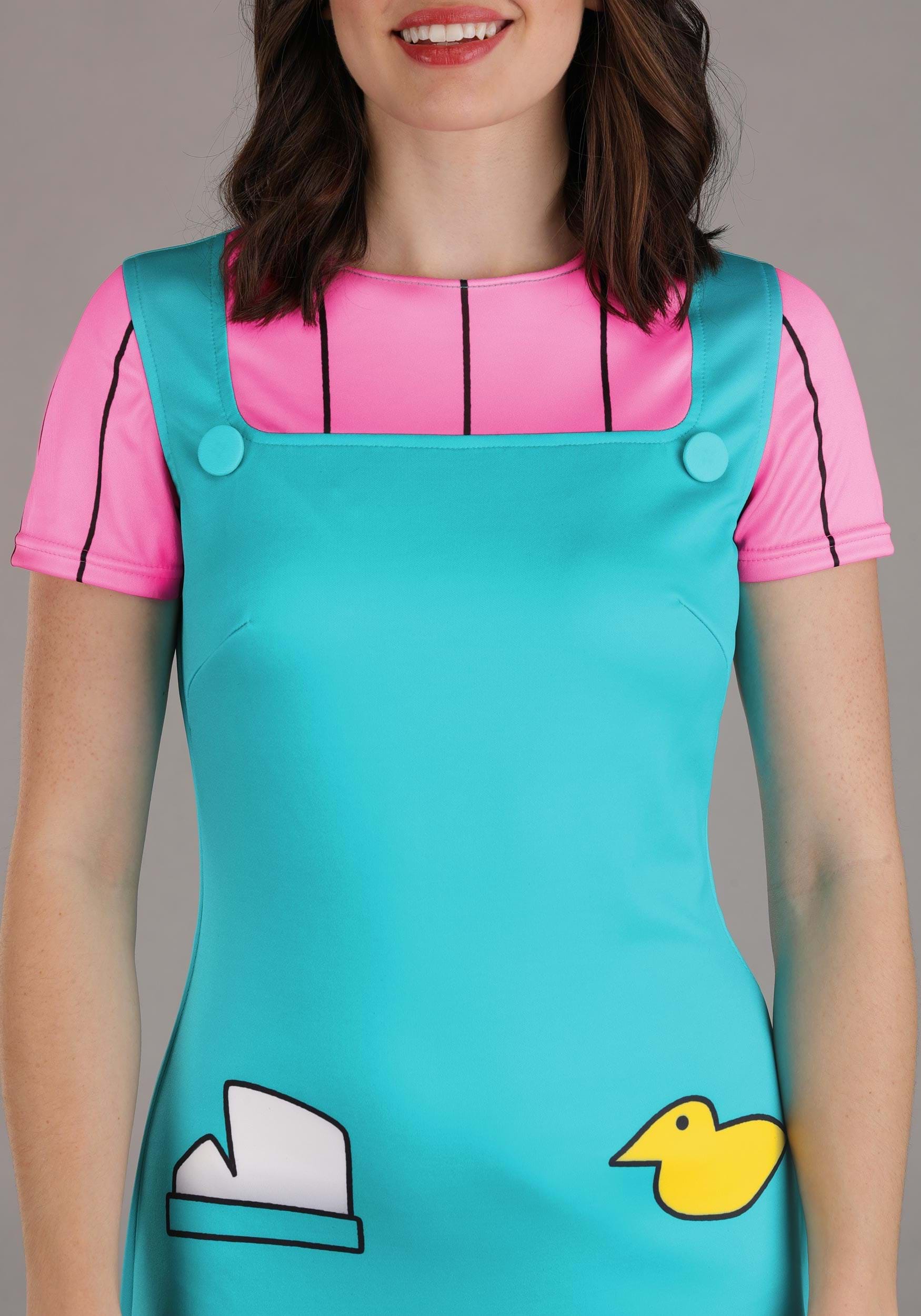 The costume features a one-piece dress with a built-in tee and jumper design. The pink top has Lil’s signature black pinstripes, while the turquoise overlay includes printed details like a cartoon duck and a faux pocket for that unmistakable animated flair. The stretchy knit fabric allows for easy movement, whether you're marching through a Halloween bash or defending your snack choices with conviction.