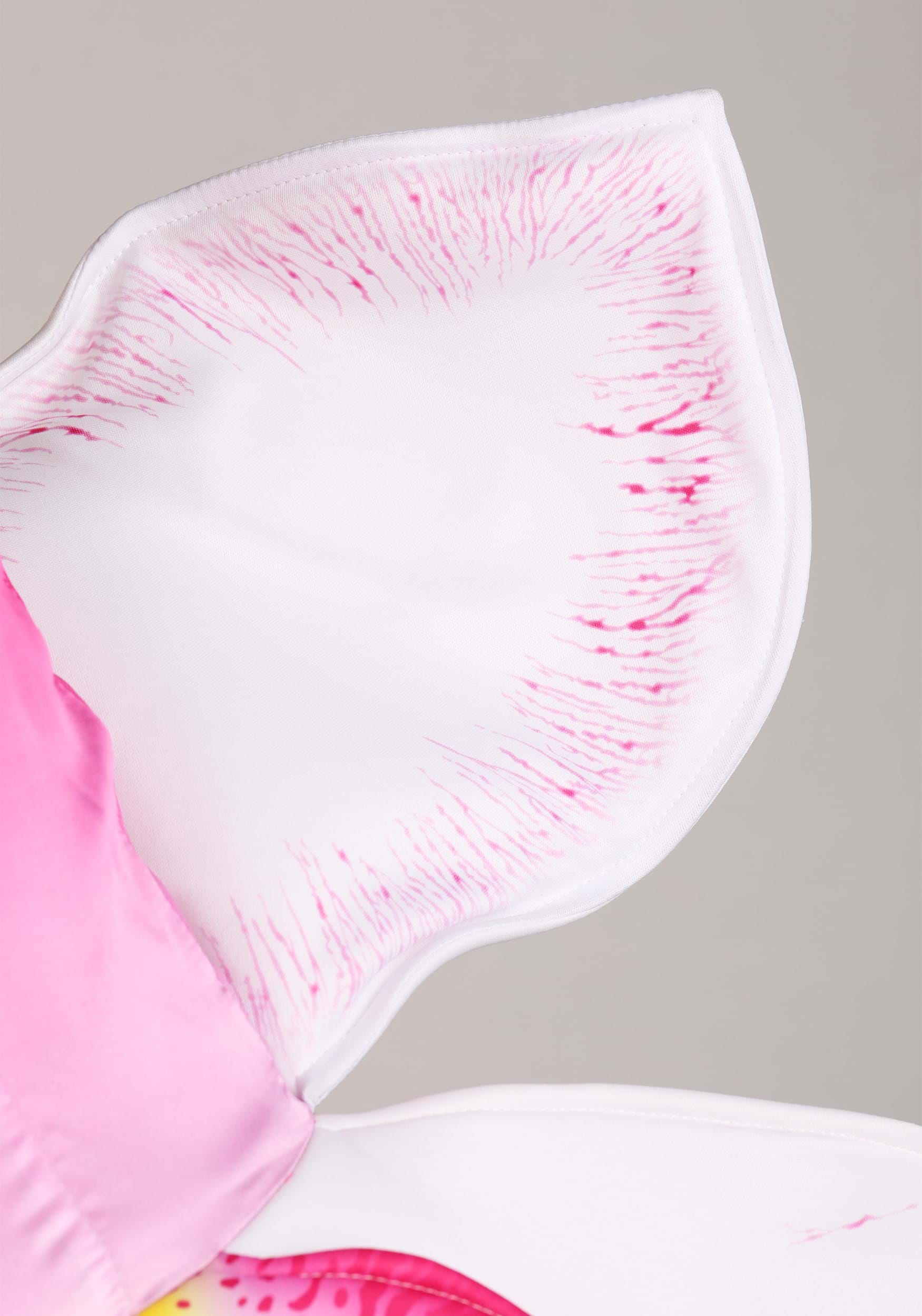 Dimensional petals bloom around the waist and back, creating a full orchid effect in soft white and bright pink with detailed printed veining. The petals are plush and sculpted to hold their shape, so you stay in blossom mode all evening long. Slip on a pair of heels or flats, add some shimmer, and you’re ready to grow your social circle in style.