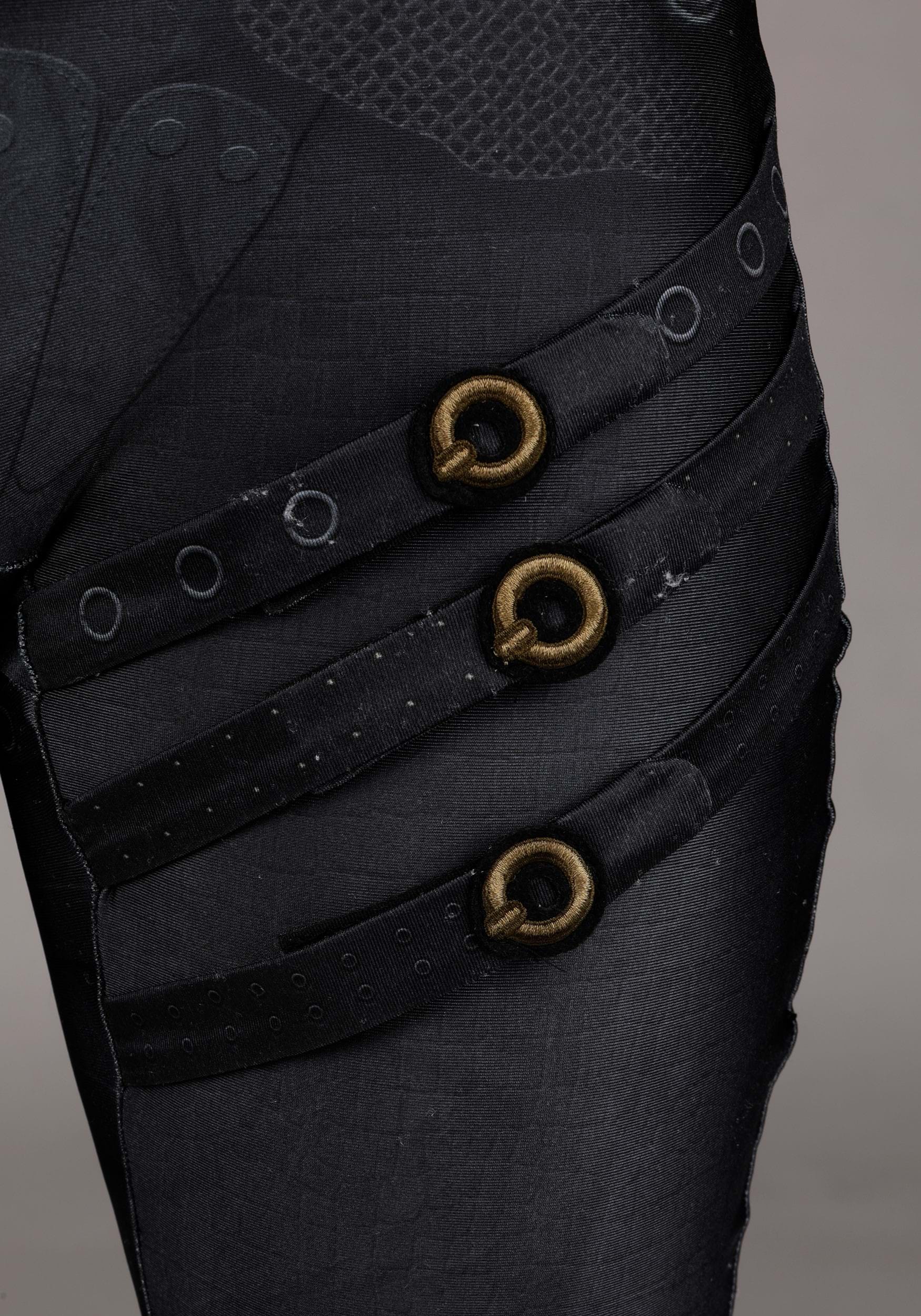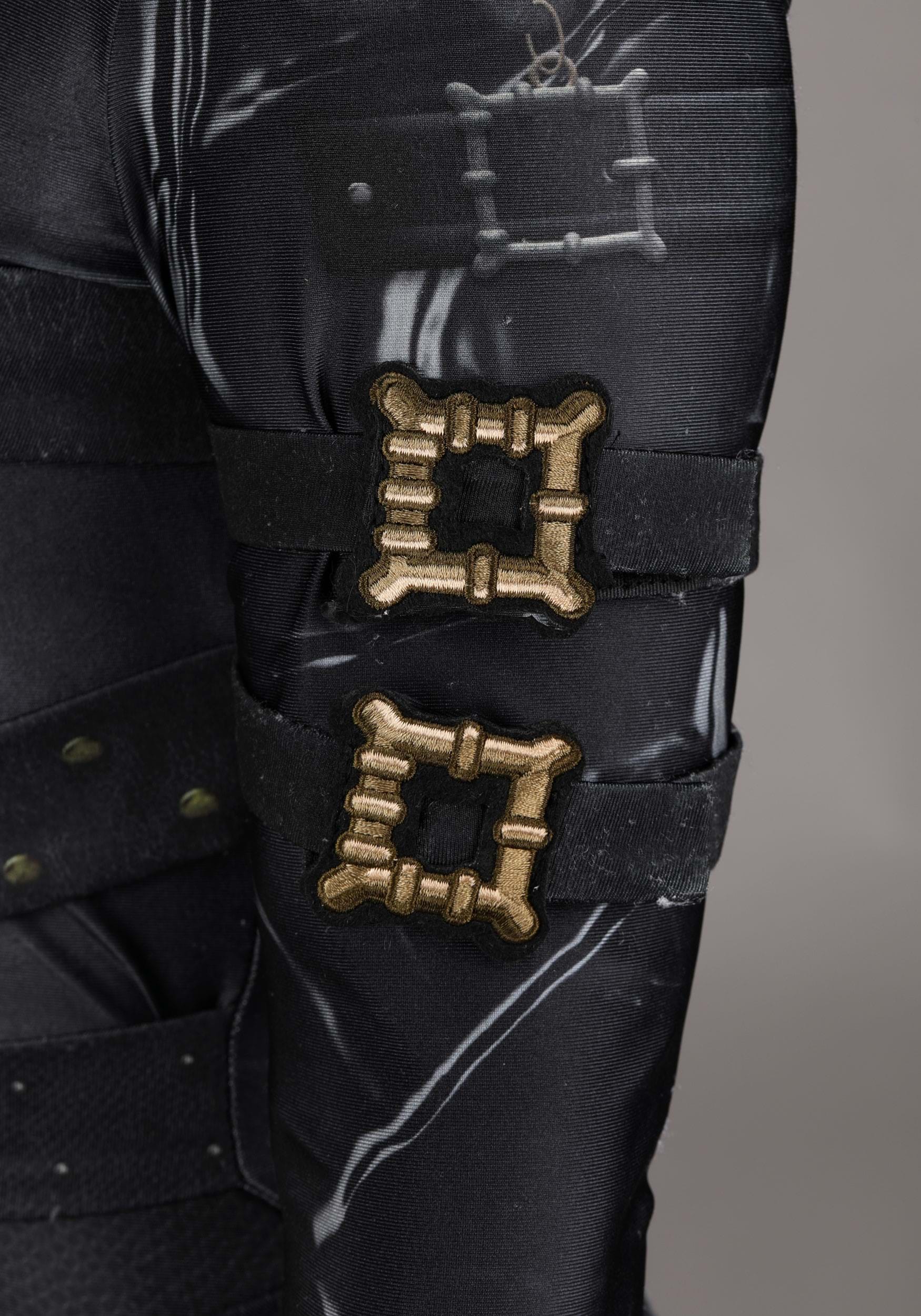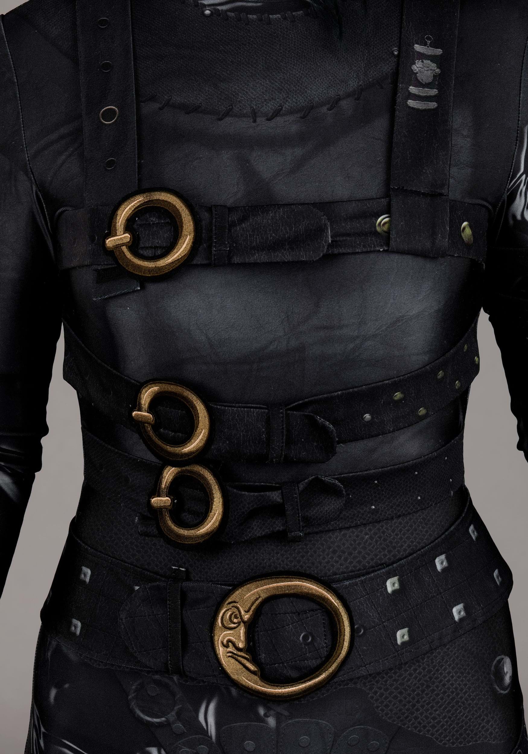 This women's plus size costume keeps all the details of Edward's look while making sure it fits with ease. The black jumpsuit is made from stretchy fabric, so it hugs where it should without feeling restrictive. It zips up easily and features faux belts around the waist and legs, with gold-colored embroidered buckles to nail that patchwork aesthetic. The included belt gives extra shape and detail, completing the look.
