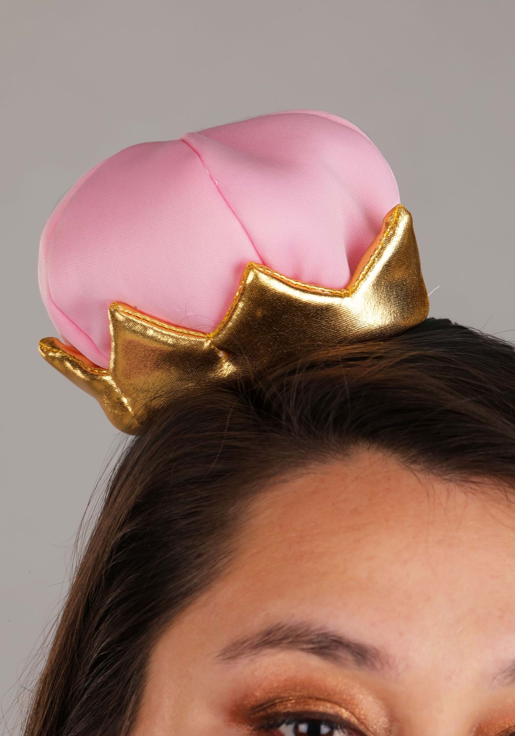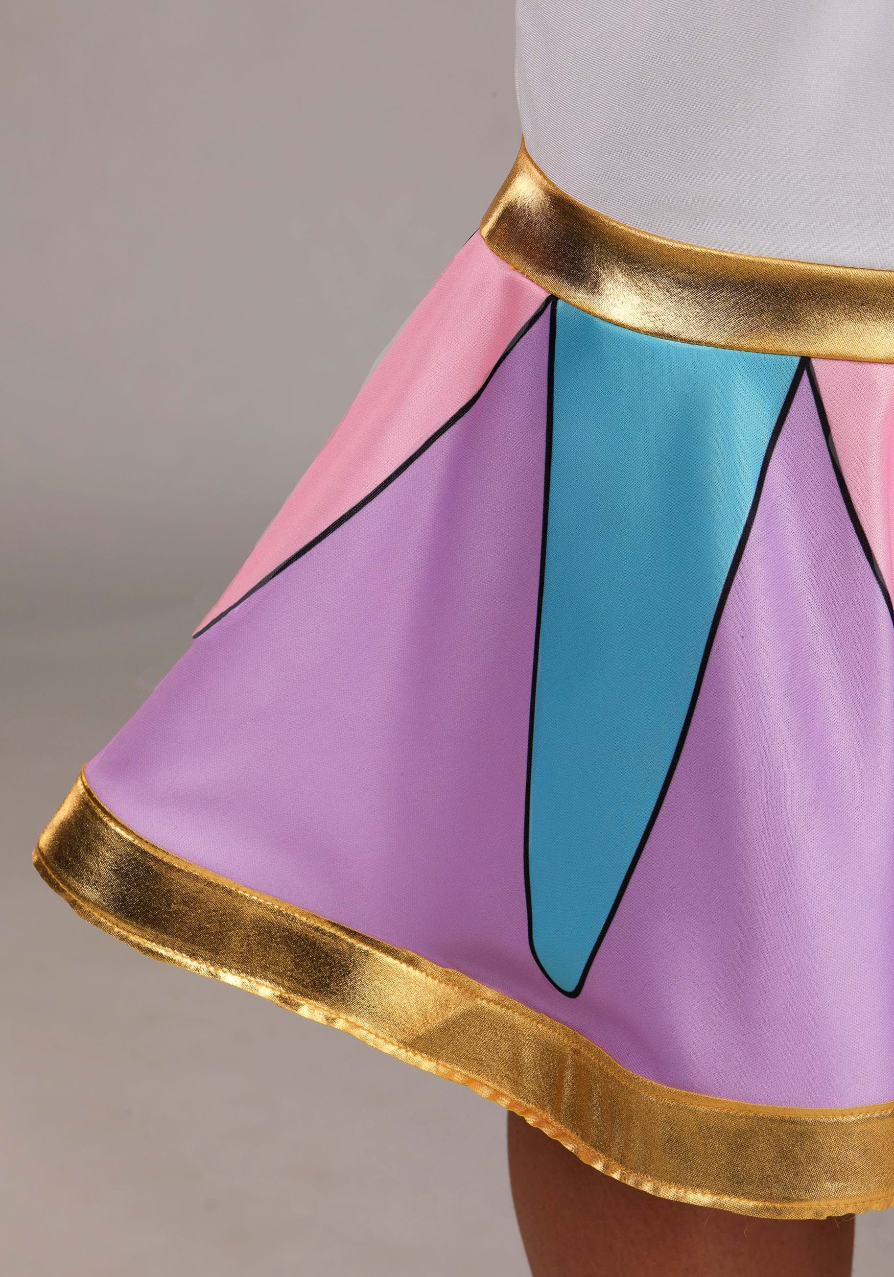 Crafted from soft four-way stretch jersey, this dress showcases gold stretch lamé sleeves and a swirl of vibrant purples, pinks, and blues for a cheerful look. The purple stretch jersey collar is edged in gold and secures easily at the back with hook-and-loop fasteners. Complete the look with the foam-backed knob hat, which stays securely in place with metal alligator clips for a playful finish.