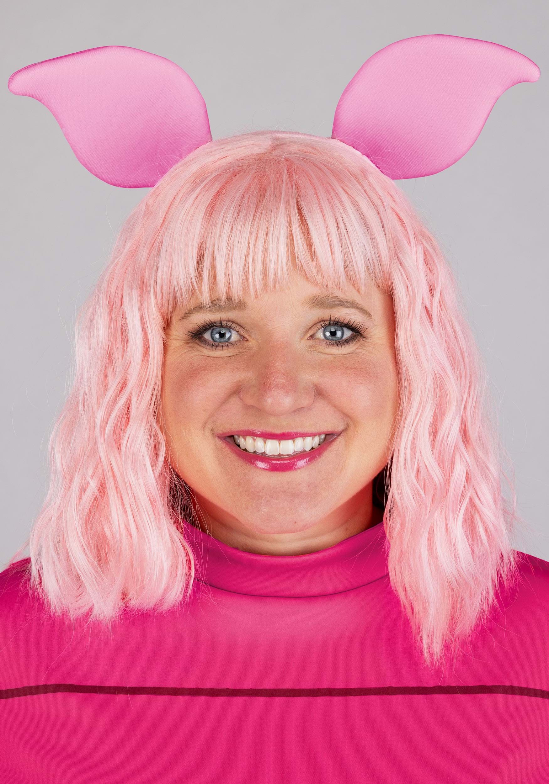 This women's Piglet costume features a pink jersey knit dress with sublimated stripes and lightweight long sleeves. Matching tights with an elastic waistband and a headband with playful fabric-covered ears complete the look. Easy to wear with a zipper back, this costume is ready for parties, Halloween, or any whimsical occasion!