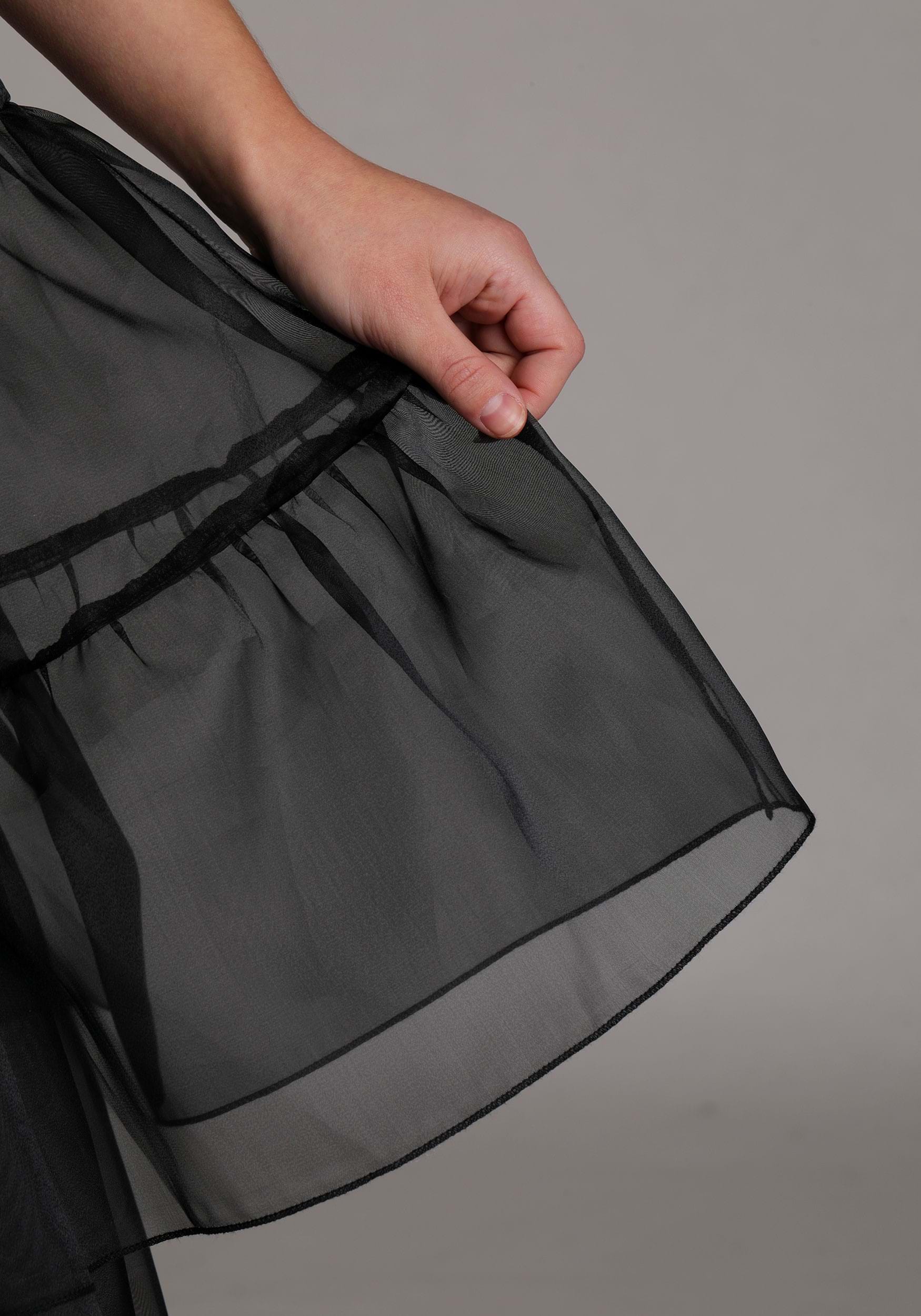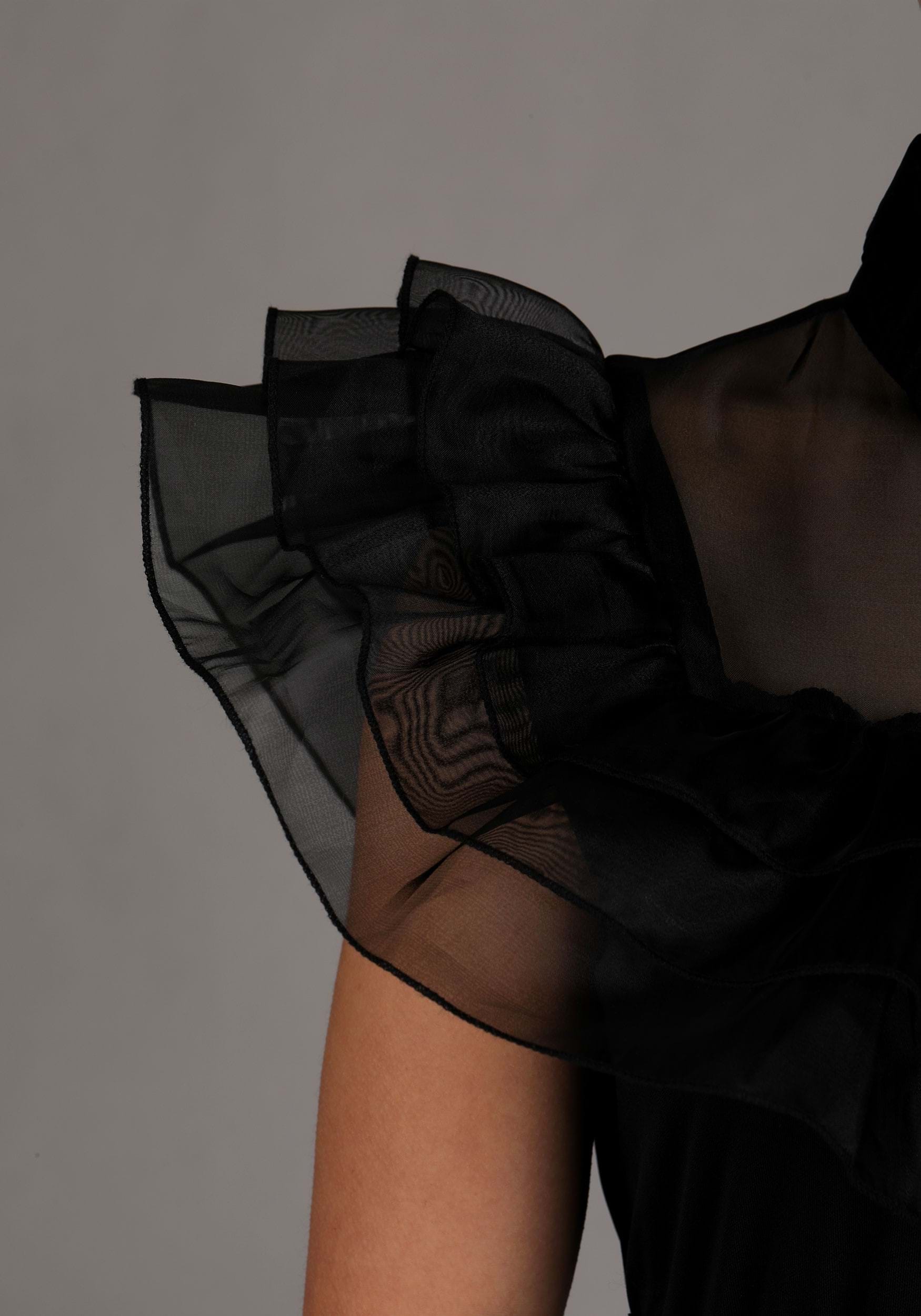 The bodice is collared with button detailing down the front and pairs seamlessly with the included belt, which fastens at the back and cinches the waist for that signature silhouette. The sheer ruffle accents continue across the back and sleeves, giving the entire outfit a floaty, ghostlike presence—perfect for dancing, drifting, or dramatically exiting social functions.