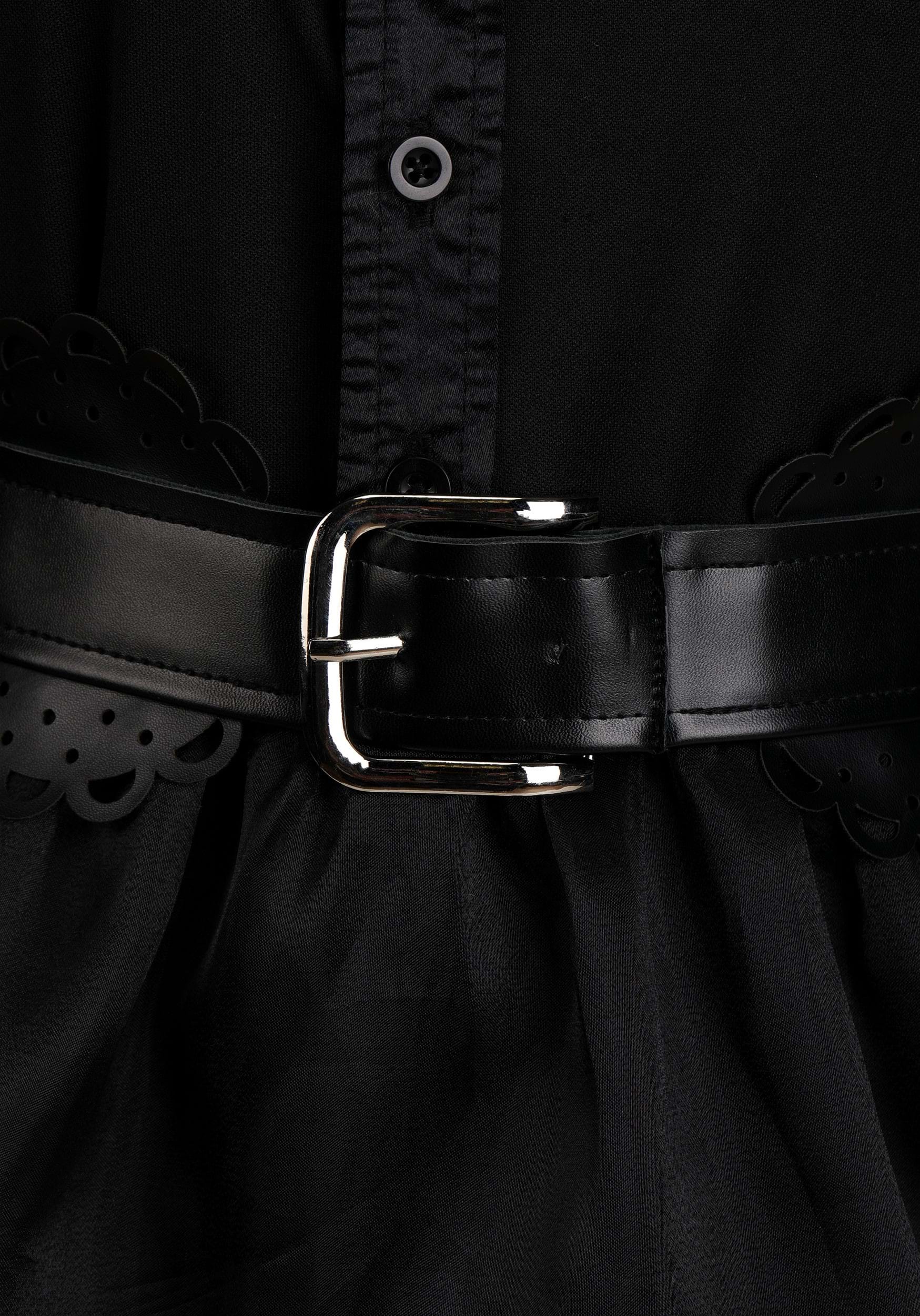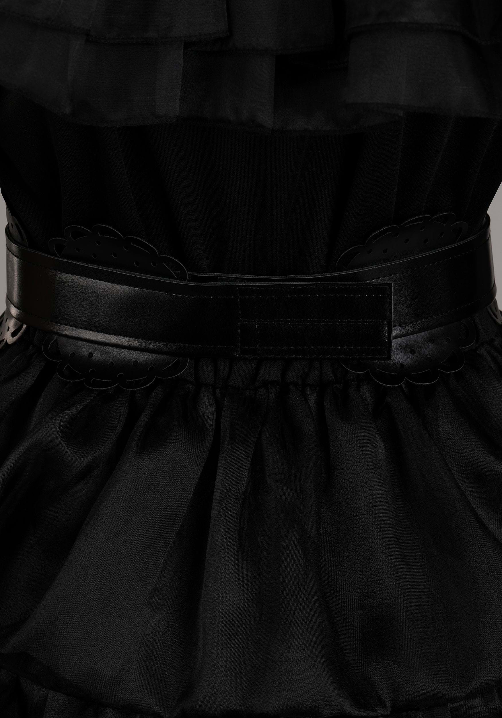 This two-piece costume includes a sweeping black dress and a matching faux leather belt. The dress features a tiered tulle skirt that falls in soft, haunting layers to the floor, channeling major gothic drama with every swirl. The top half includes fluttery ruffled sleeves and sheer mesh across the shoulders for a look that’s equal parts eerie and elegant.