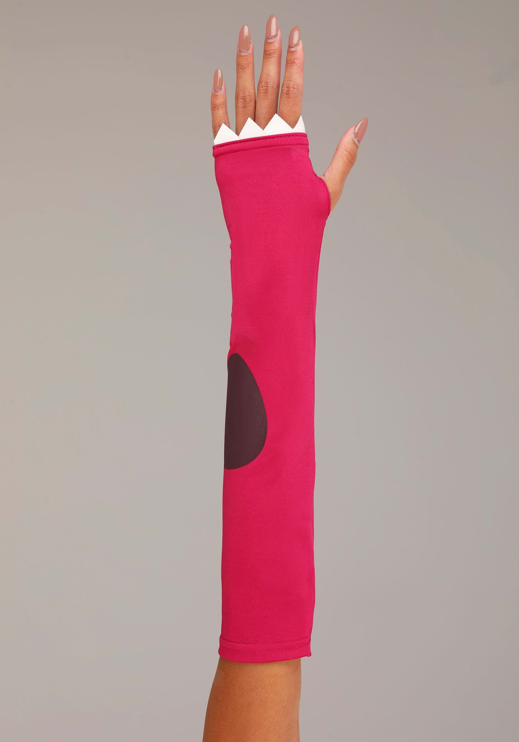 - Pair of elbow length, spandex gloves slide on, printed dino spots, vinyl spikes