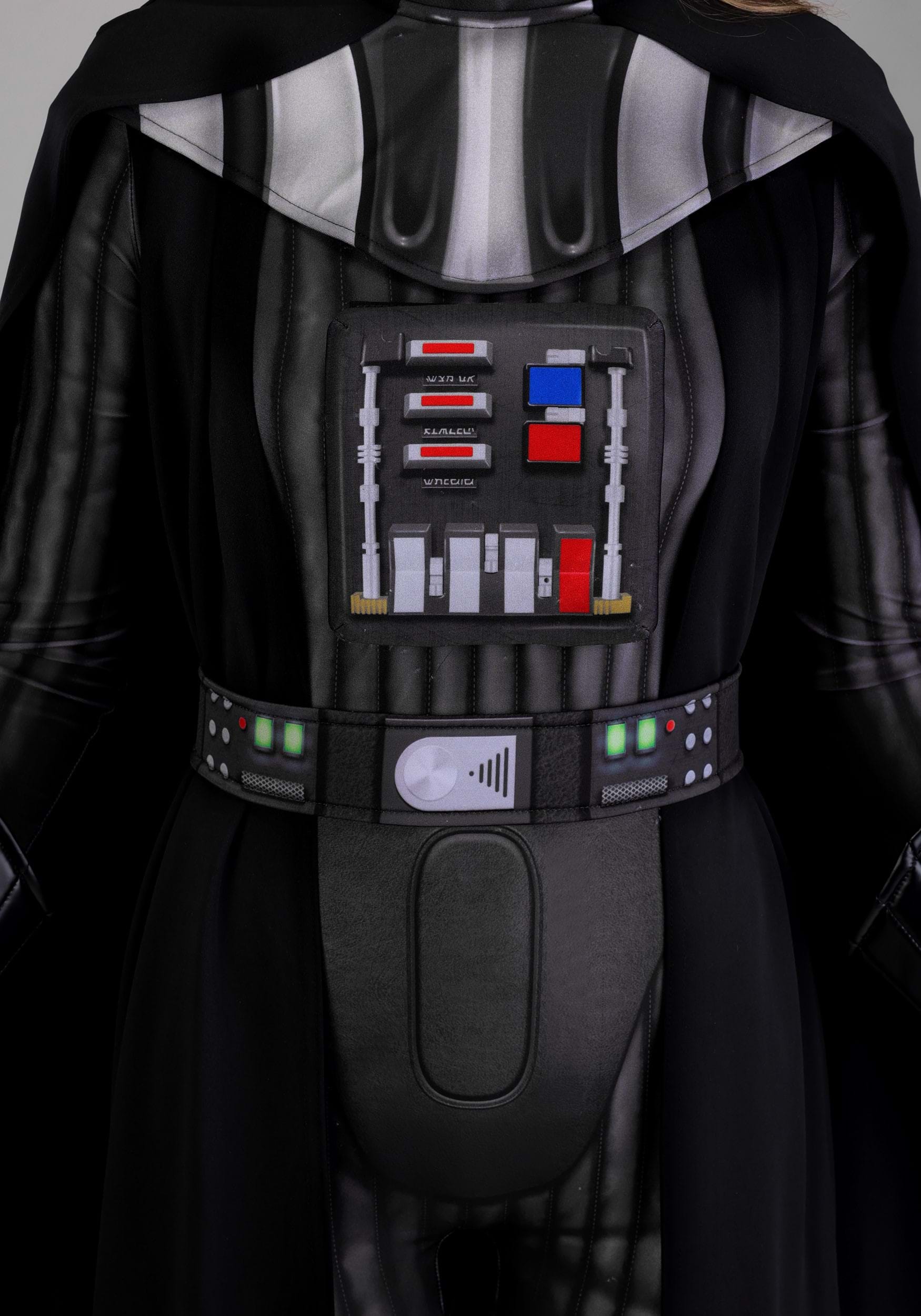 The jersey-spandex jumpsuit is printed with Vader's iconic armor, complete with topstitched quilting, a faux codpiece arc, and sleek detailing from head to toe. It zips up the back with a hidden closure, and the attached EVA foam control panel secures at the chest with hook and loop strips. Stitched, padded gloves and a molded foam front mask secure with elastic.