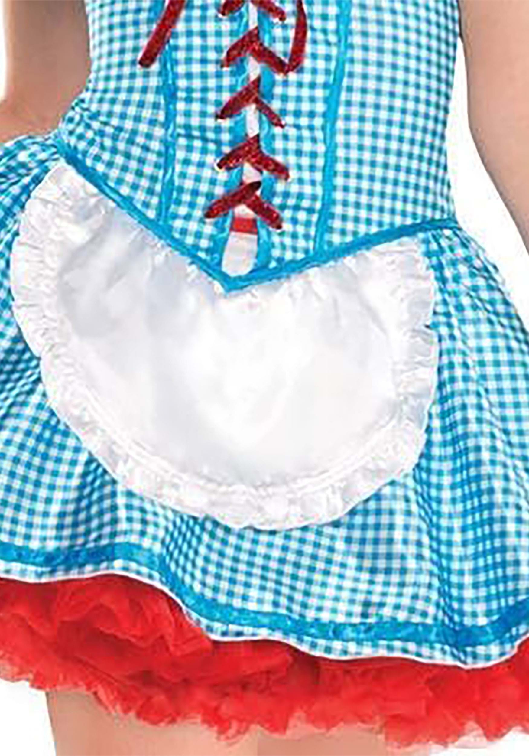 The white satin apron is attached to the front, giving it that signature “I might bake you cookies or I might lead an adventure” vibe. The skirt is short and playful, perfect for pairing with your favorite petticoat if you're going full tornado-chic. Whether you're headed to a costume party, a night out in Oz, or just looking for a fun way to show off your childhood nostalgia with a grown-up edge, this Dorothy look is ready to click its heels and go.